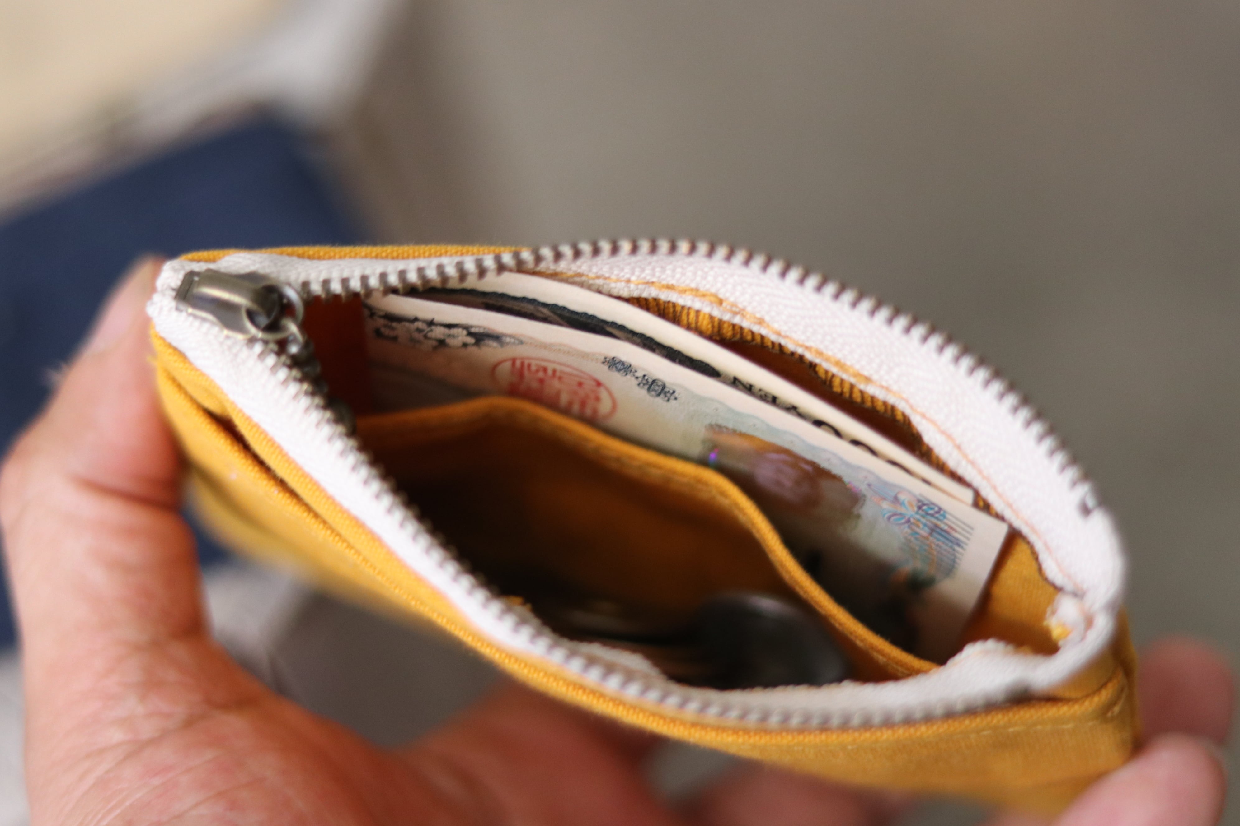 小さいながら外ポケ、内側にも小部屋を付けた使える小袋です。