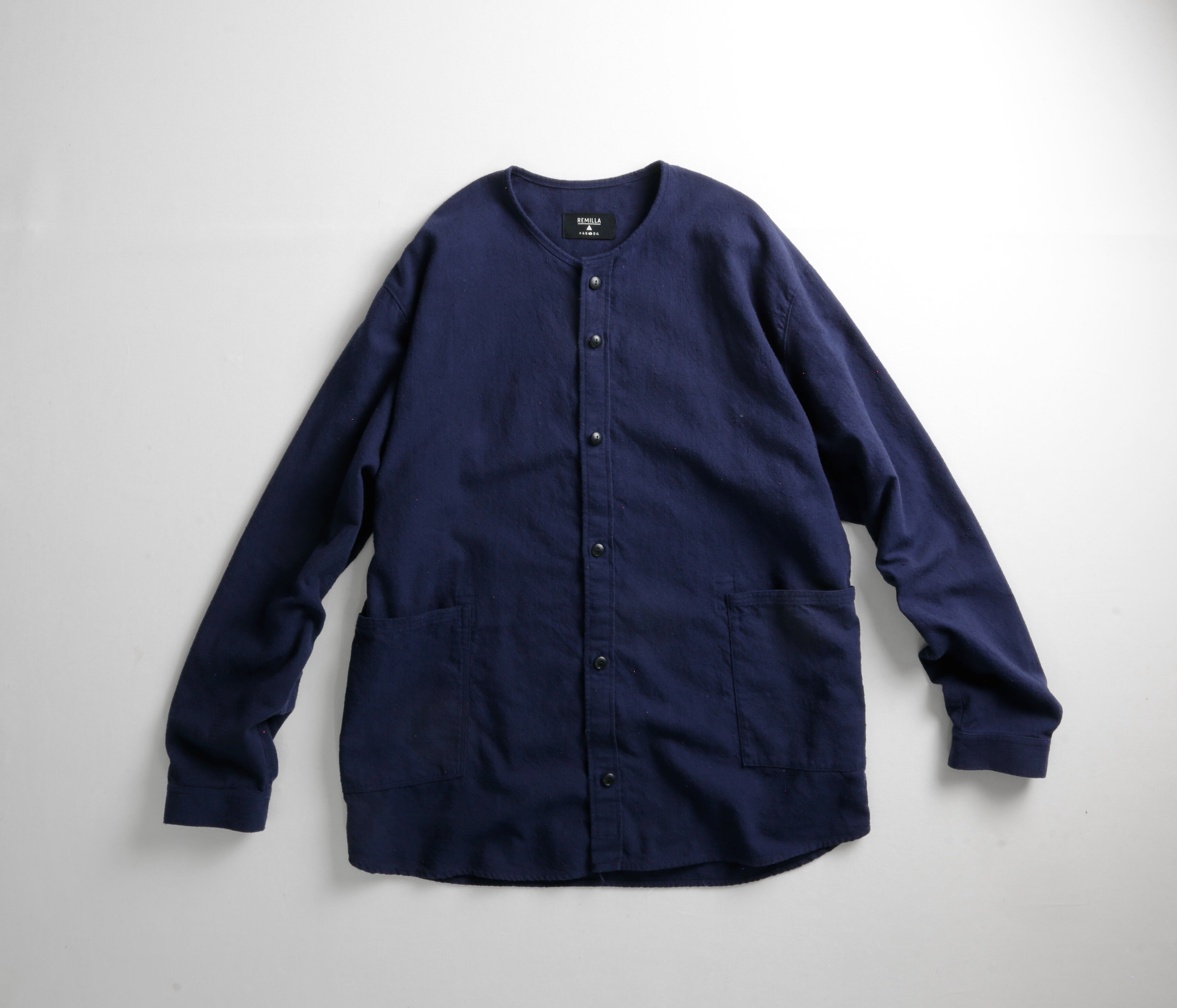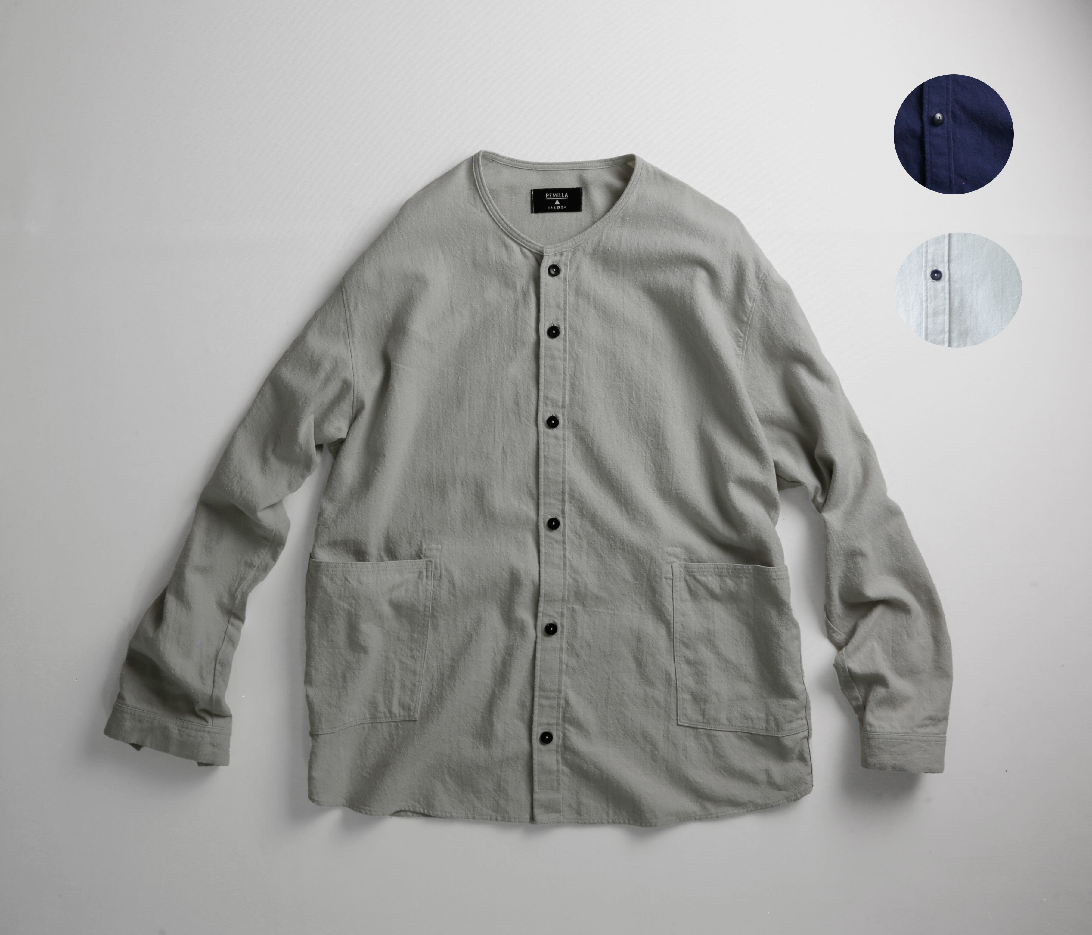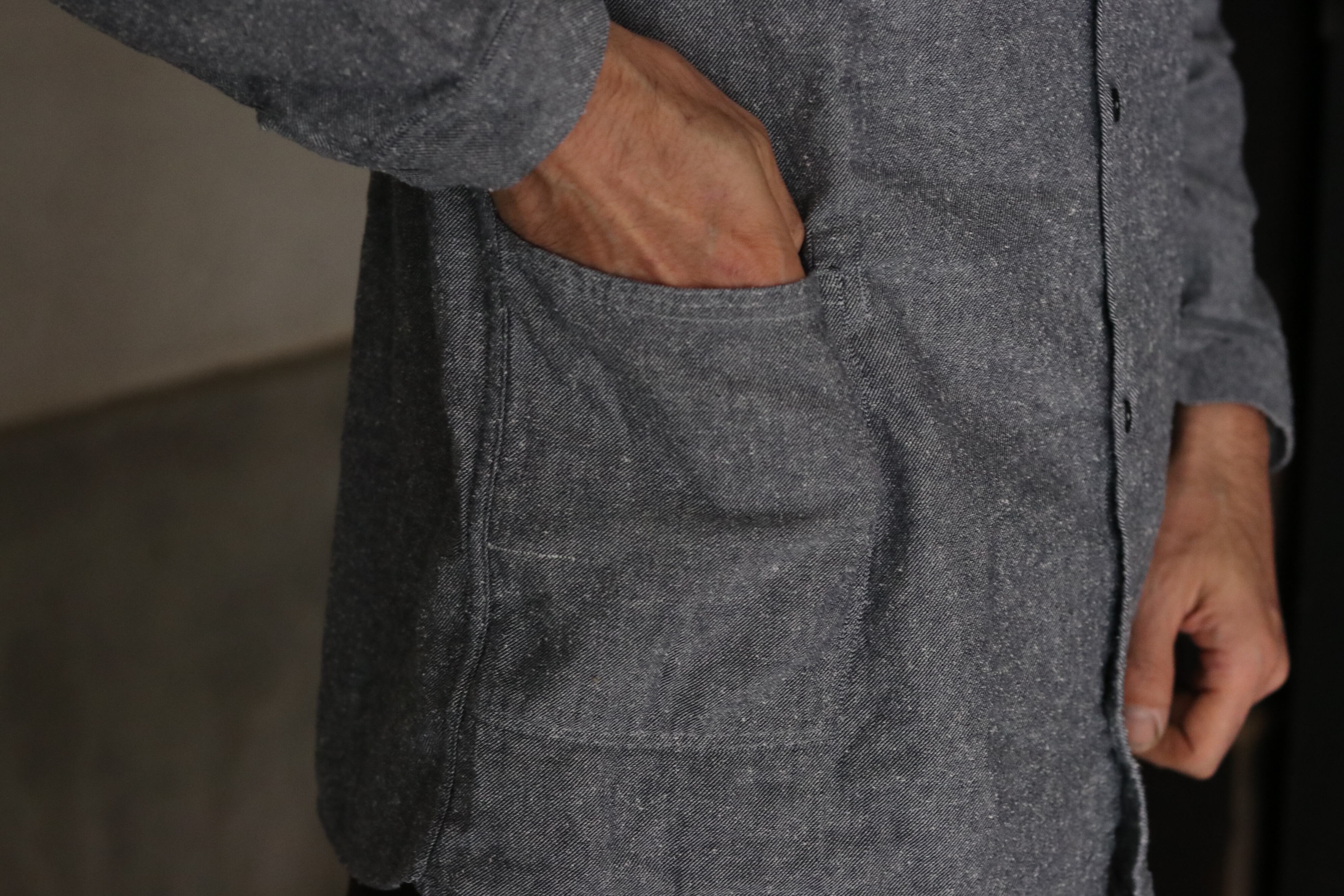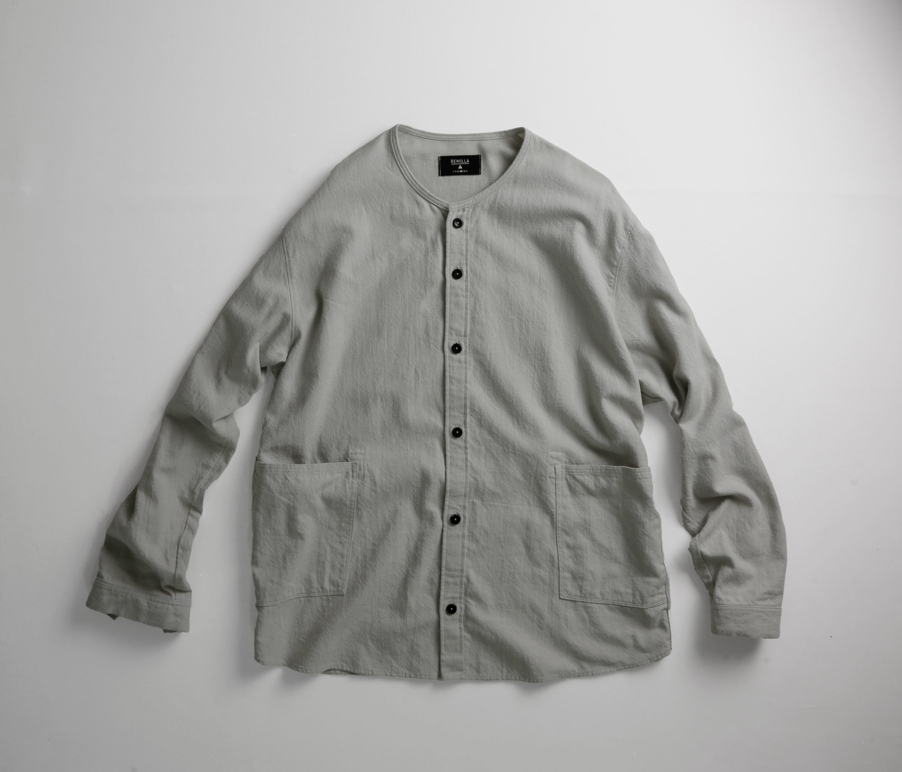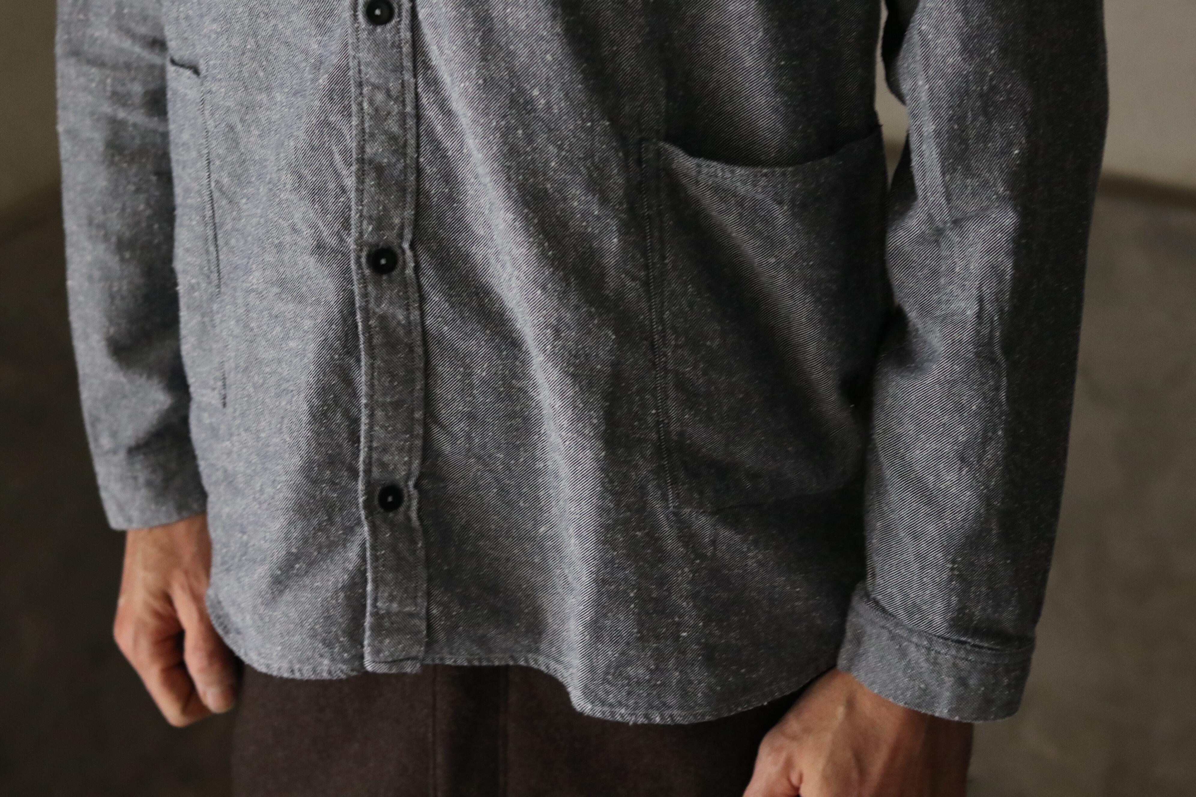 少しゆったりとした身幅に、丸首のようなパイピング始末と、手が入る大きさの左右パッチポケットが特徴の1着。シャツのようでカットソーの雰囲気を持つイメージ。素材が持つ肌触りの良さを活かした布帛を使ったカーディガン的アイテム。