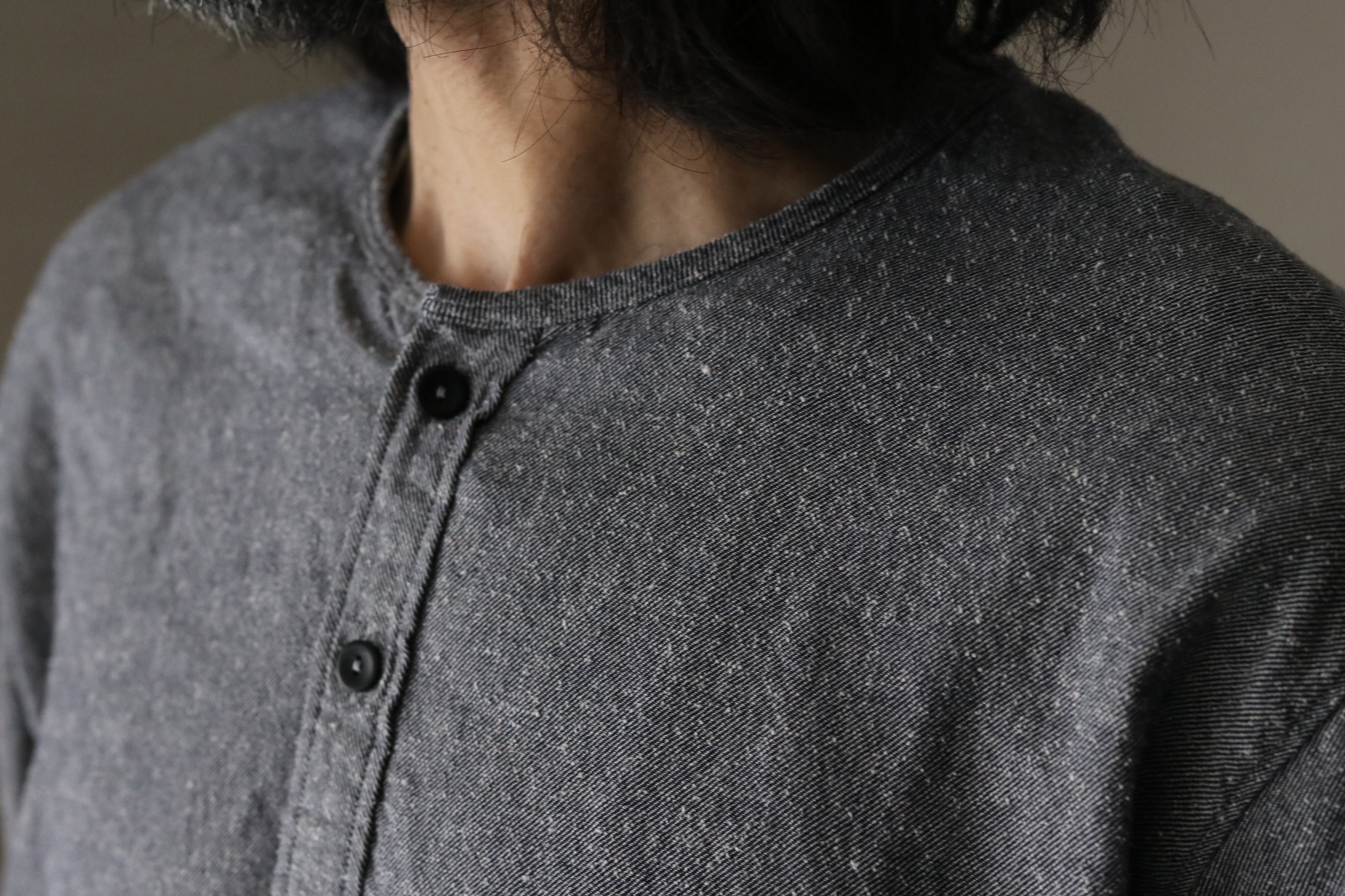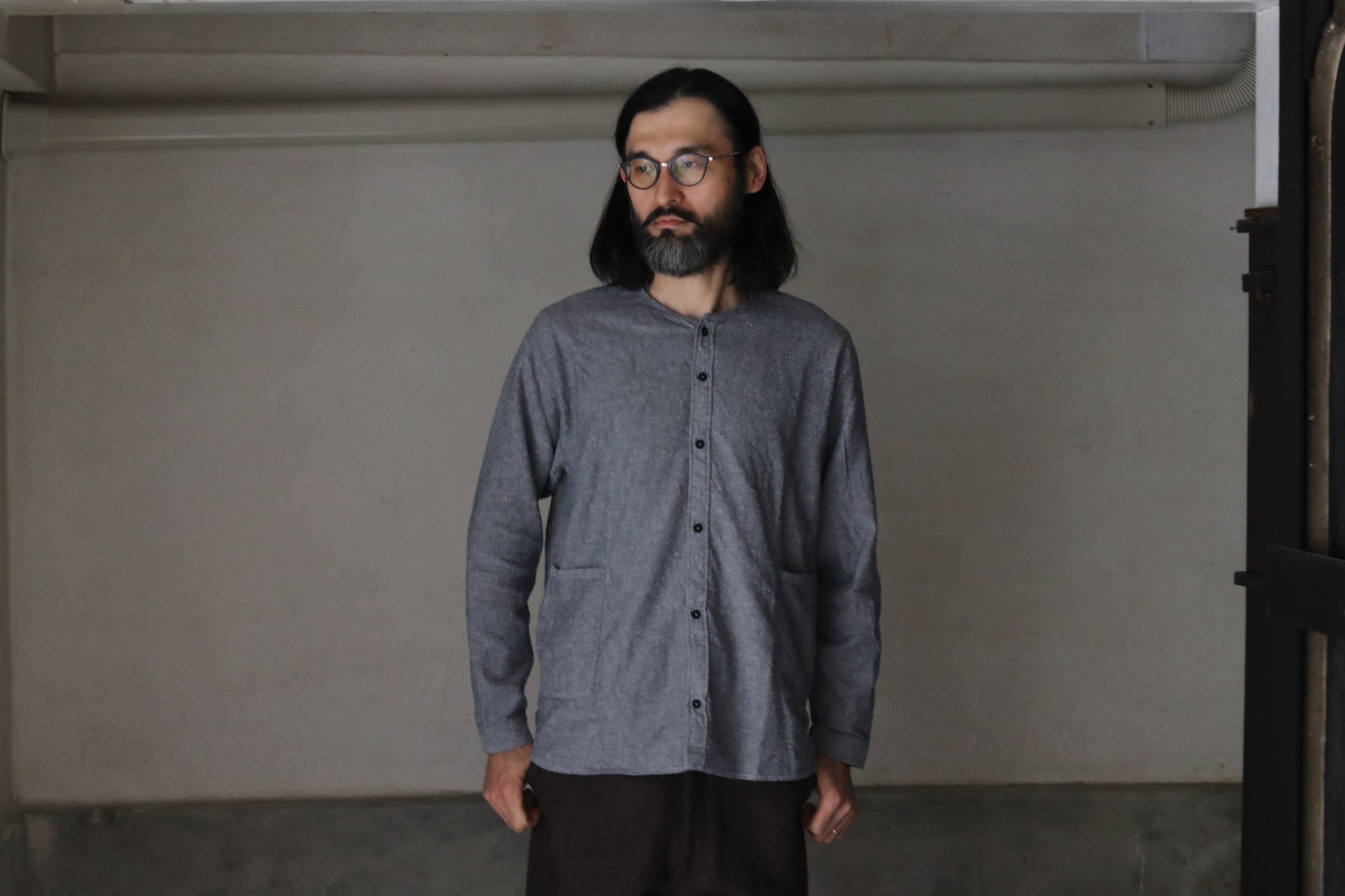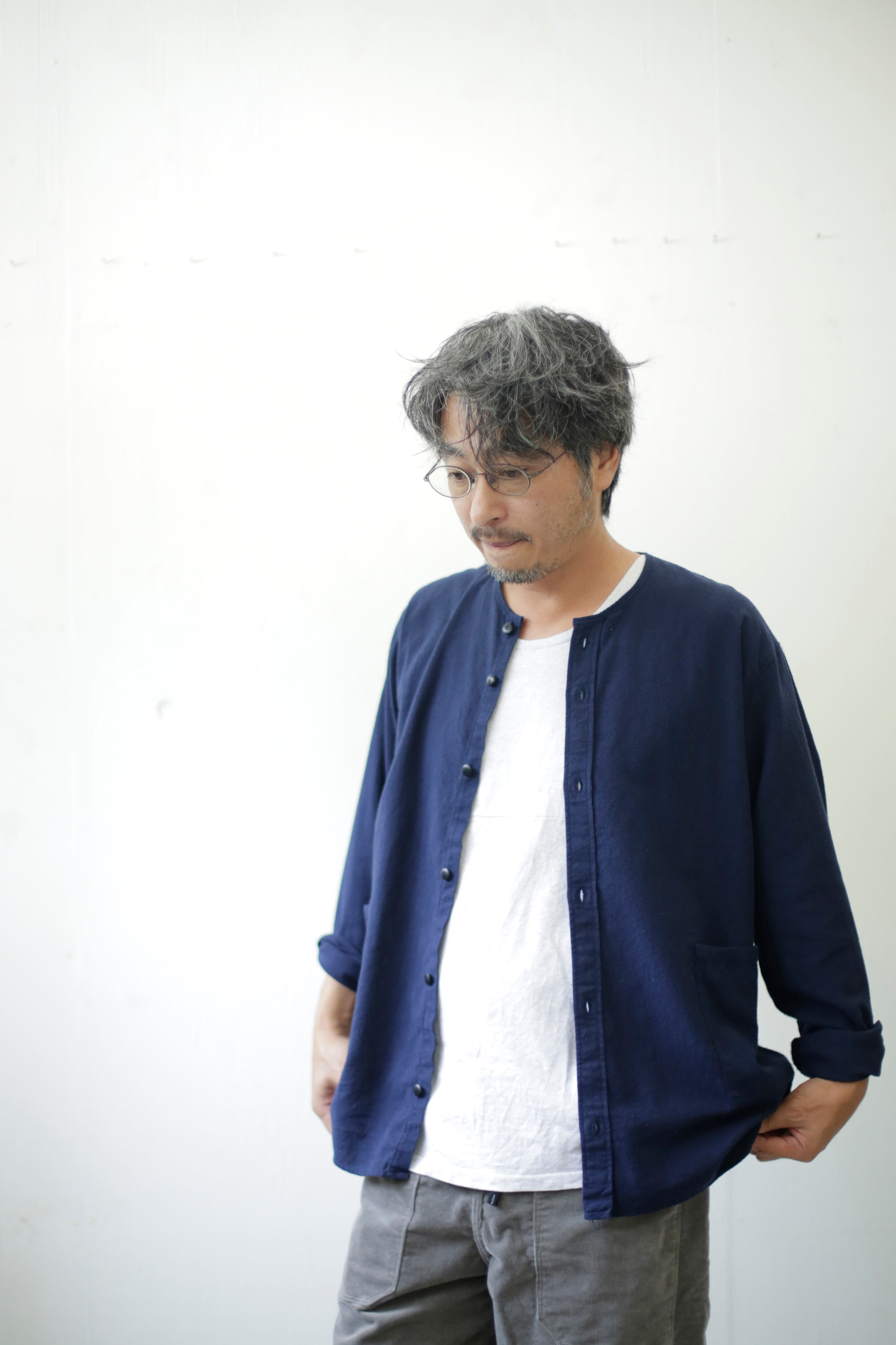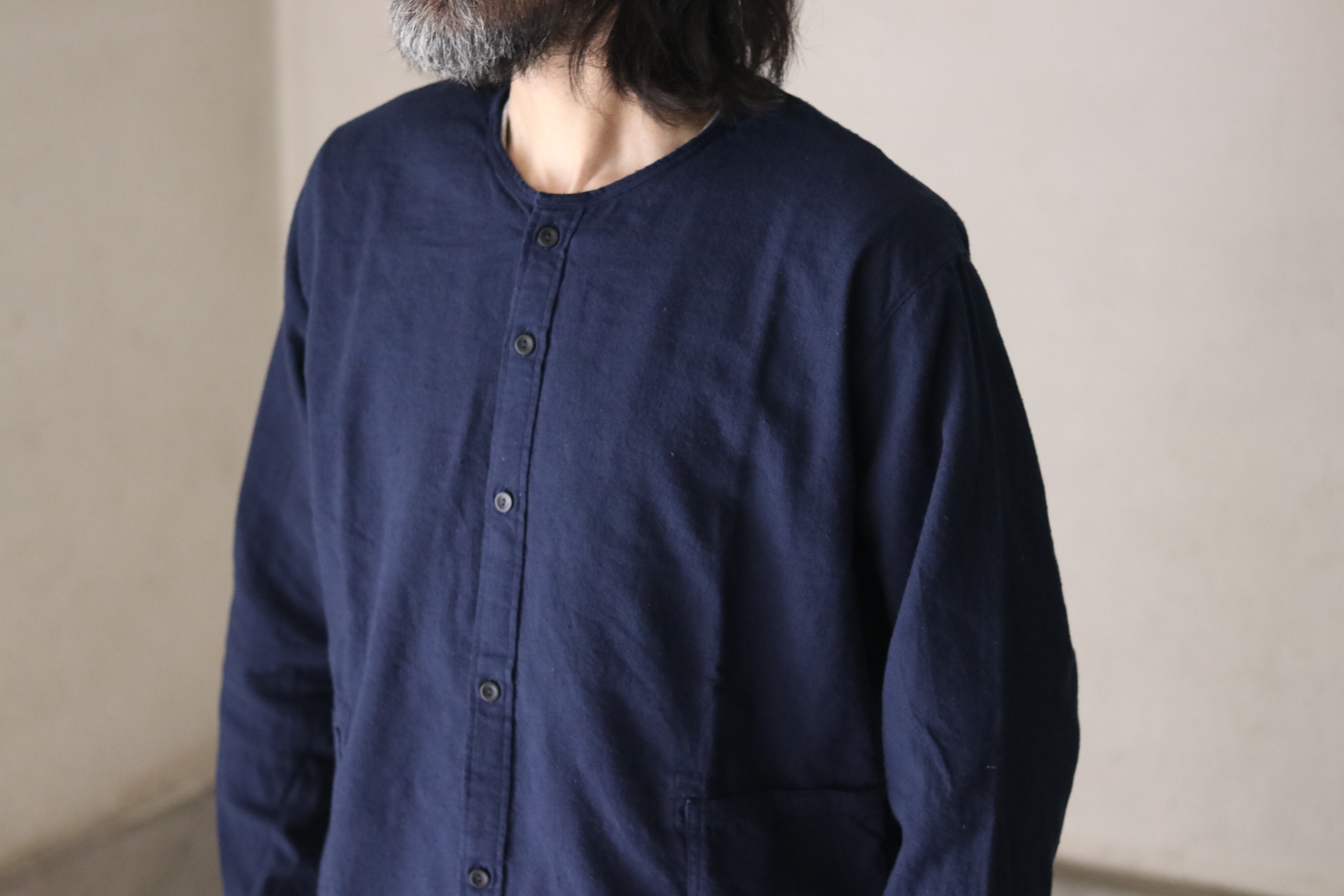 少しゆったりとした身幅に、丸首のようなパイピング始末と、手が入る大きさの左右パッチポケットが特徴の1着。シャツのようでカットソーの雰囲気を持つイメージ。素材が持つ肌触りの良さを活かした布帛を使ったカーディガン的アイテム。