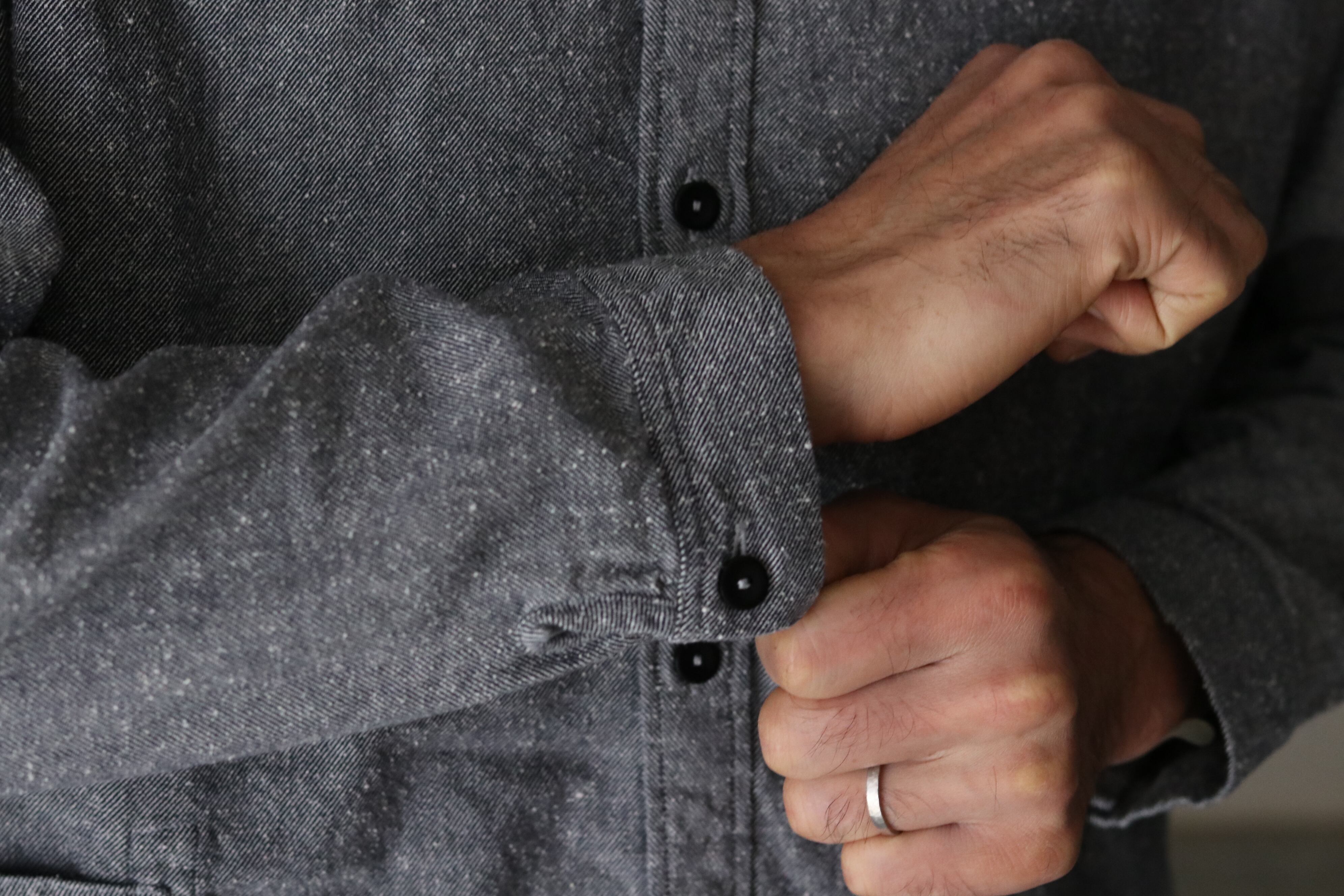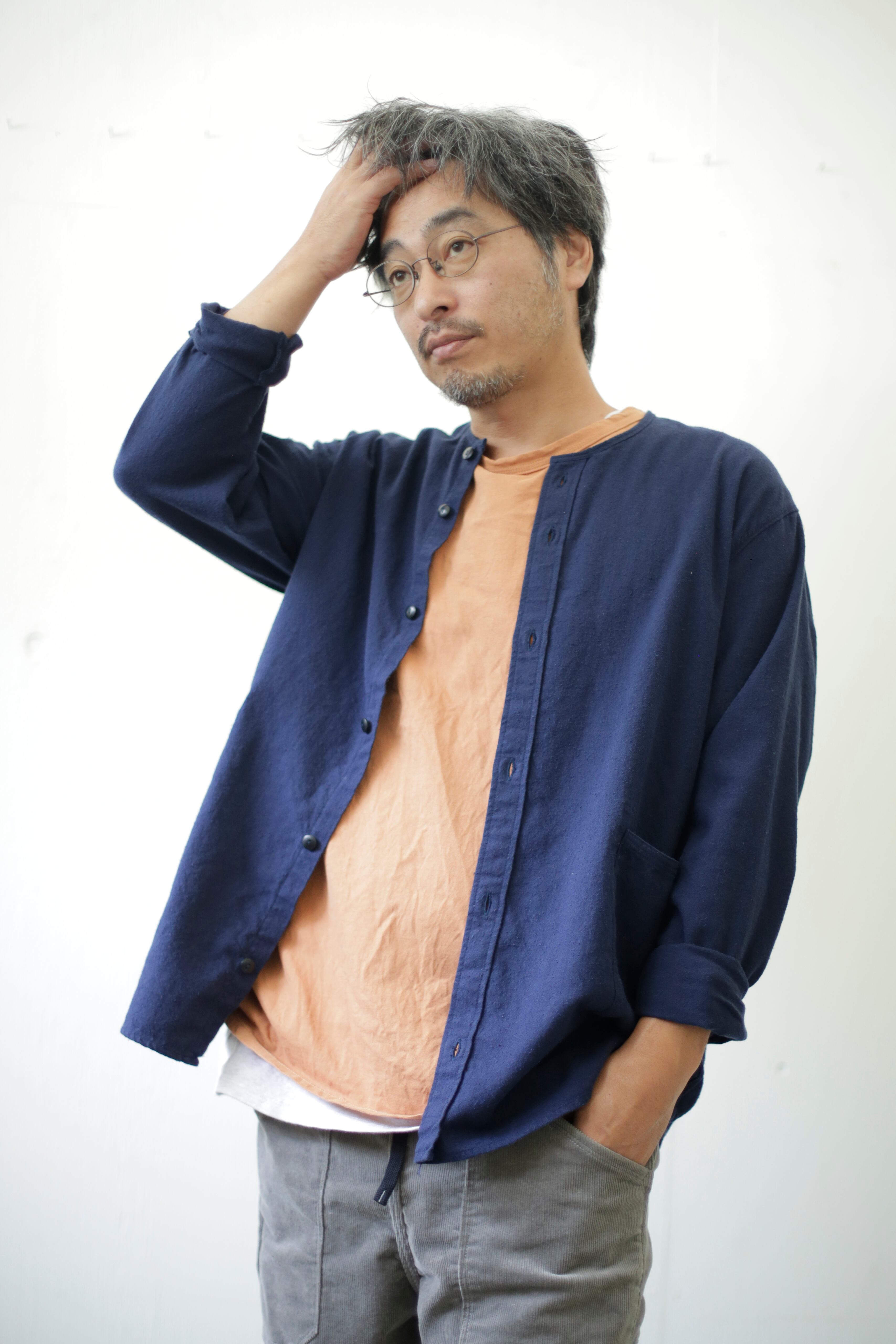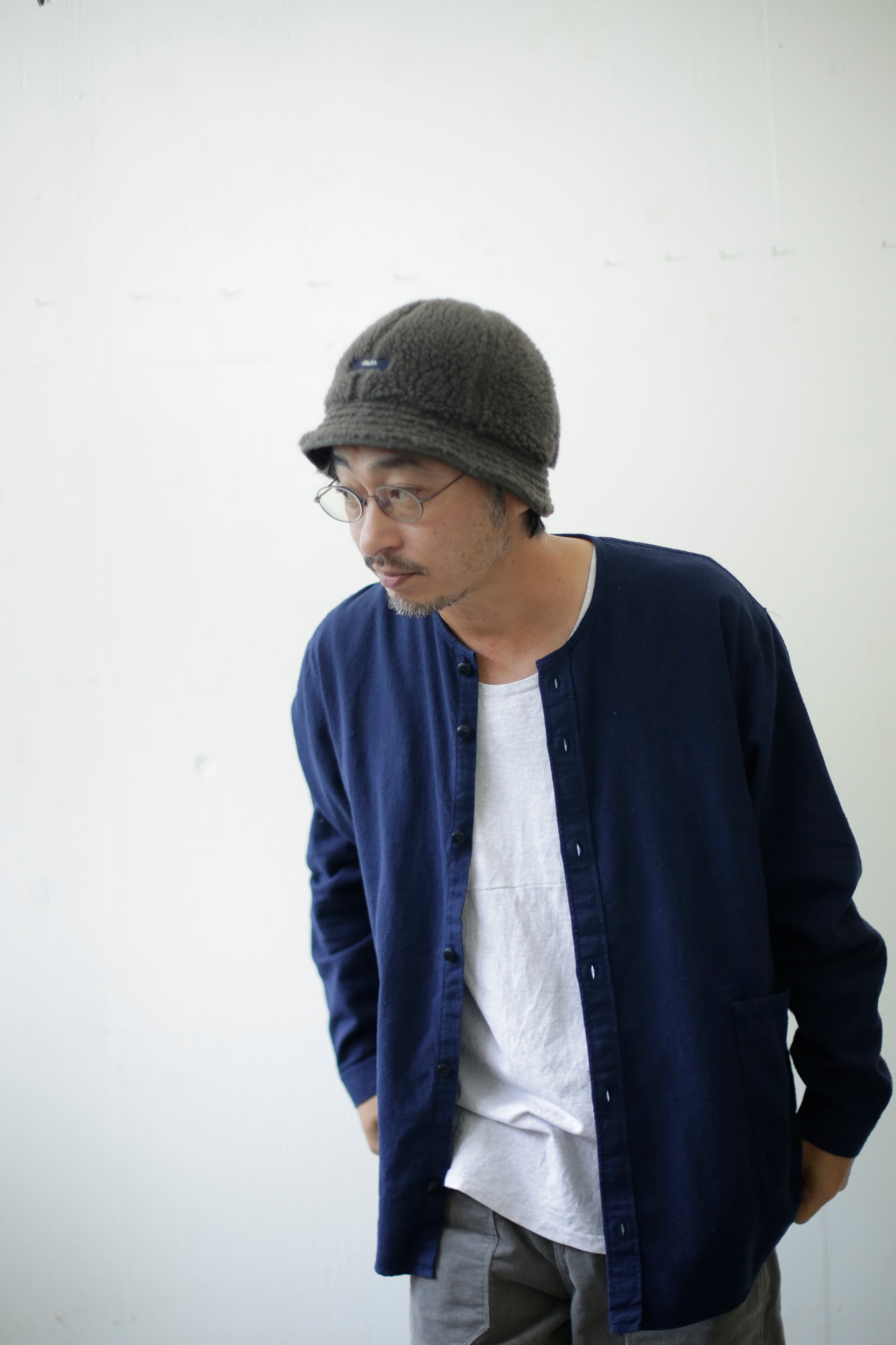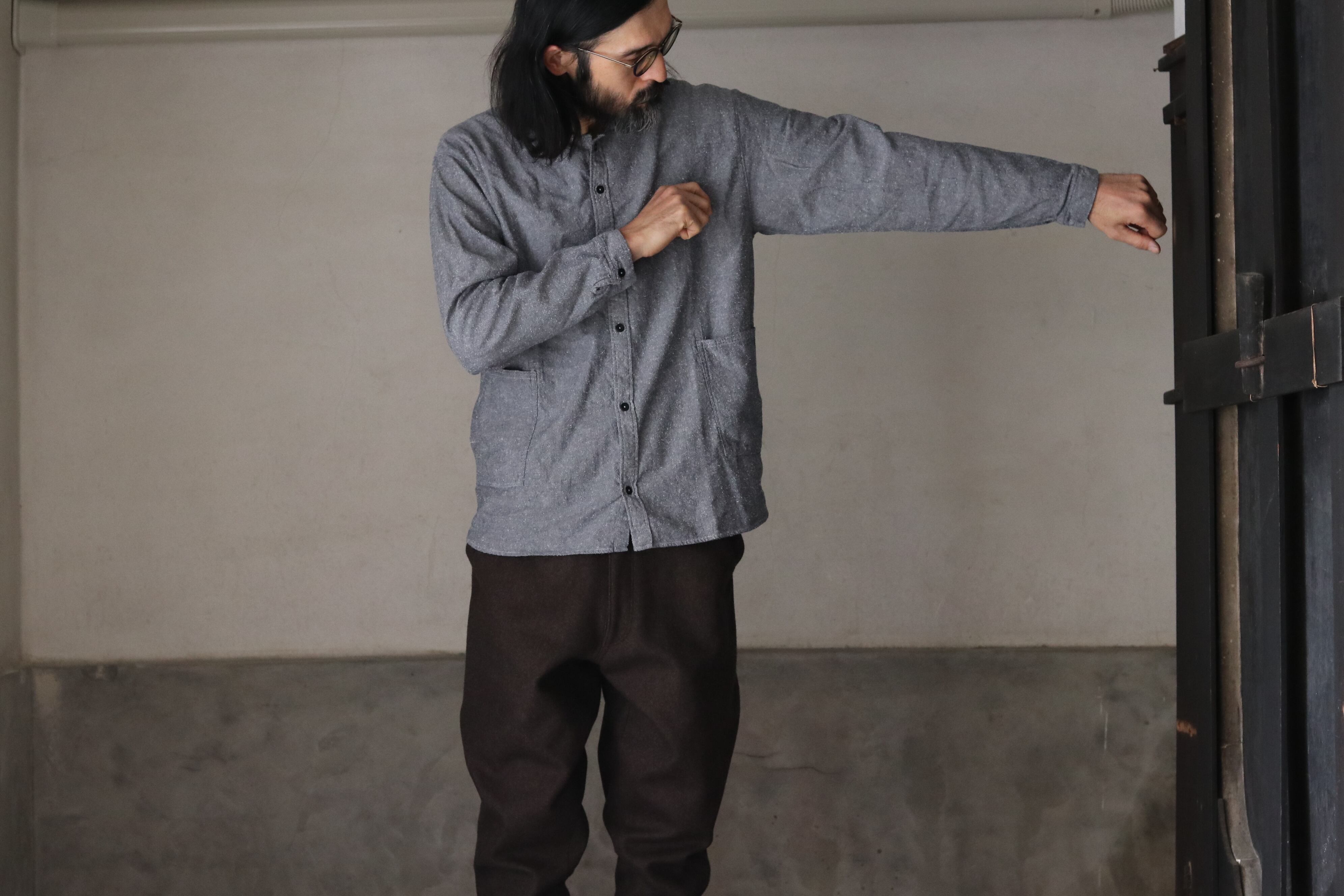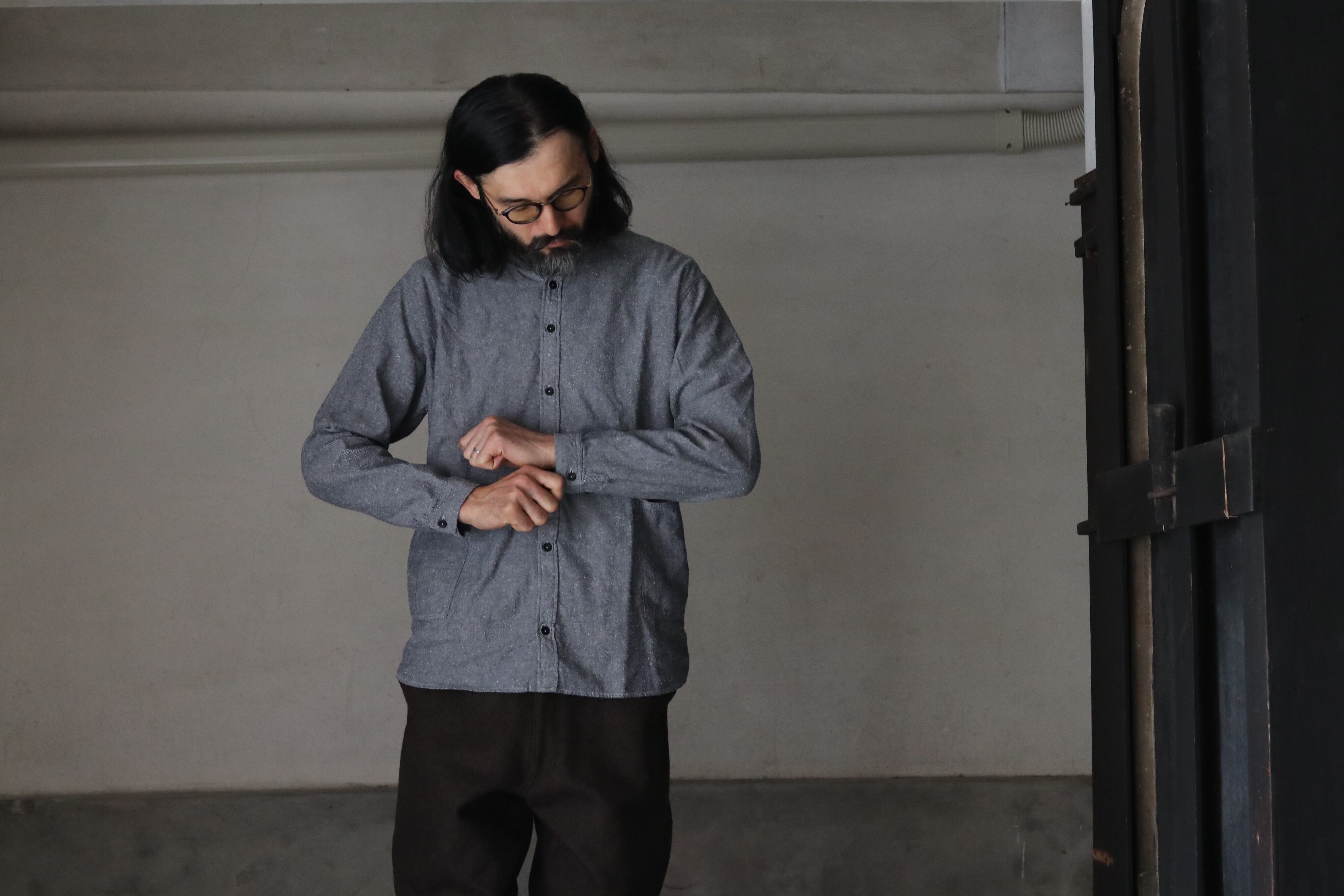 少しゆったりとした身幅に、丸首のようなパイピング始末と、手が入る大きさの左右パッチポケットが特徴の1着。シャツのようでカットソーの雰囲気を持つイメージ。素材が持つ肌触りの良さを活かした布帛を使ったカーディガン的アイテム。