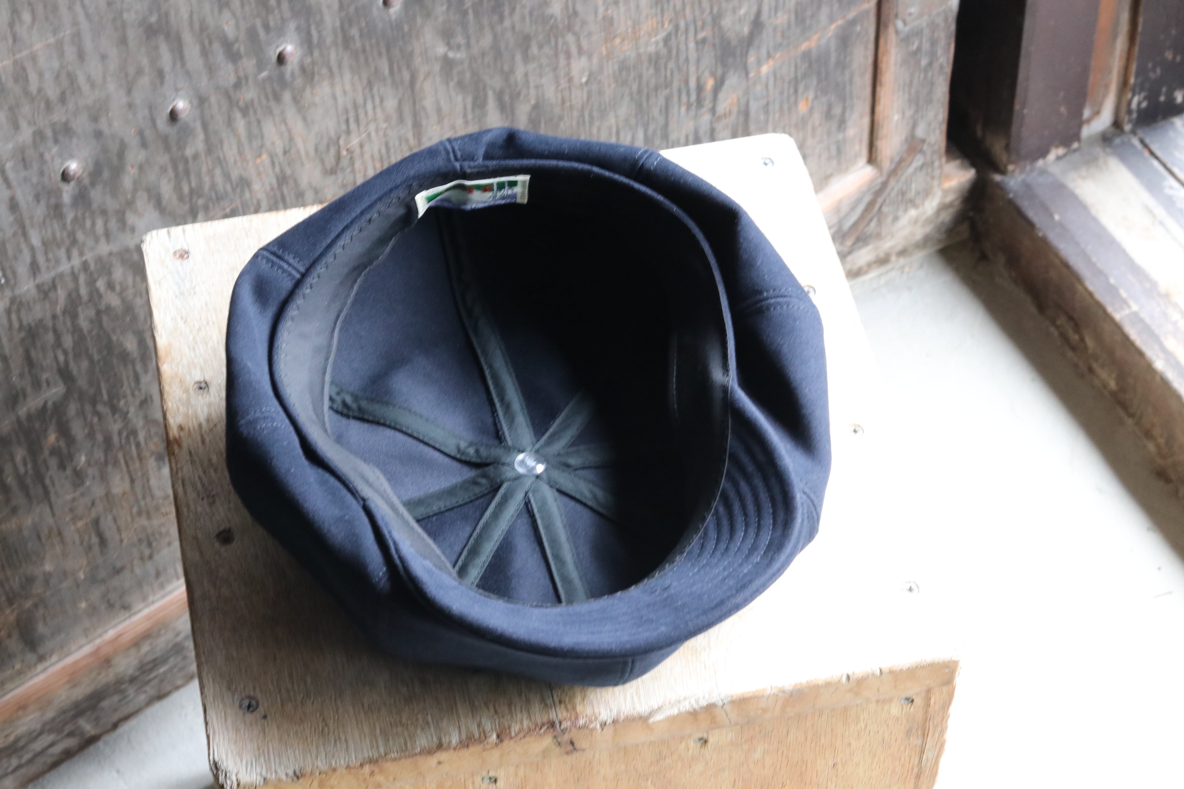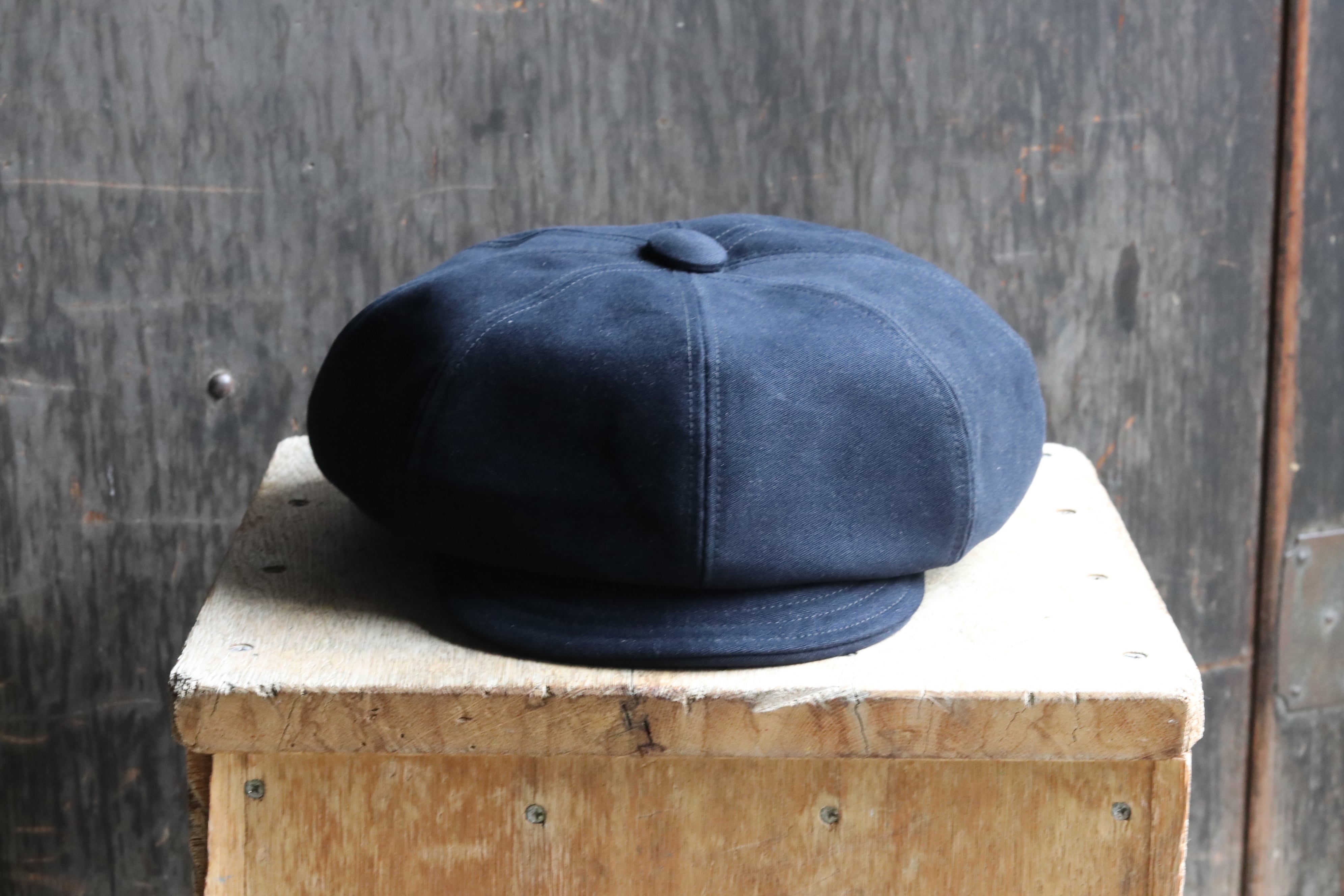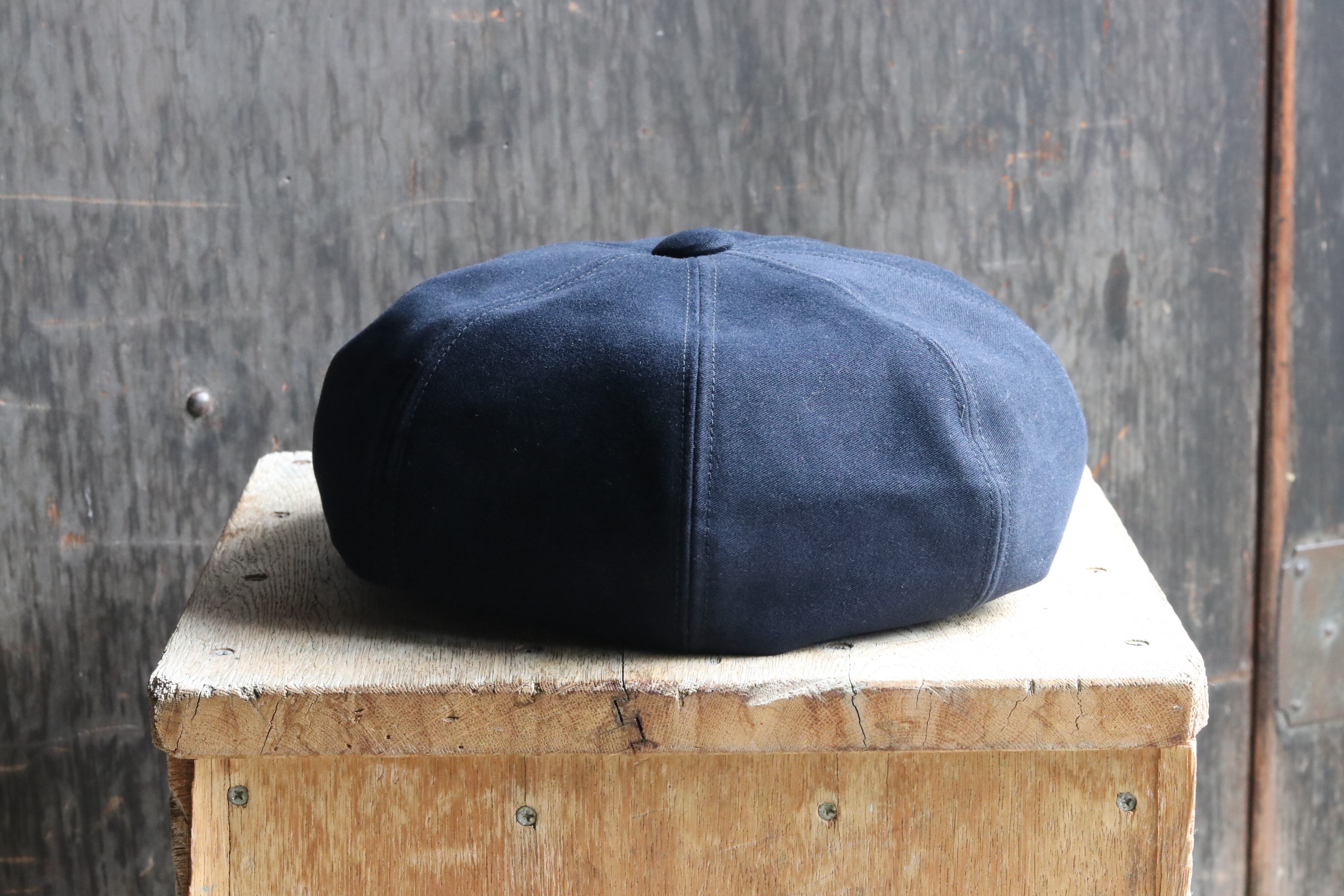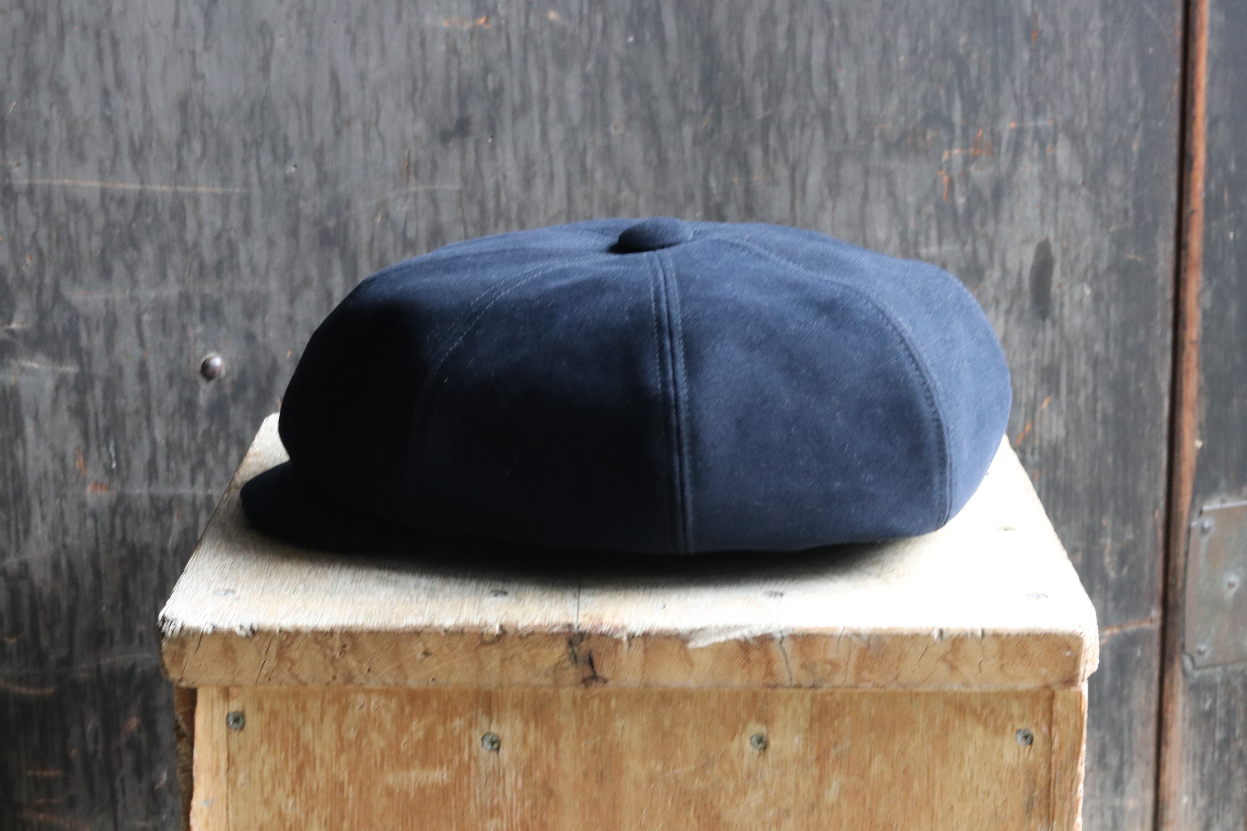べレー帽にツバを付けた大振りなキャスケットのような可愛い帽子。ネイビーのモールスキンの生地がイメージ通りハマって上質で品のある仕上がりとなっております◎