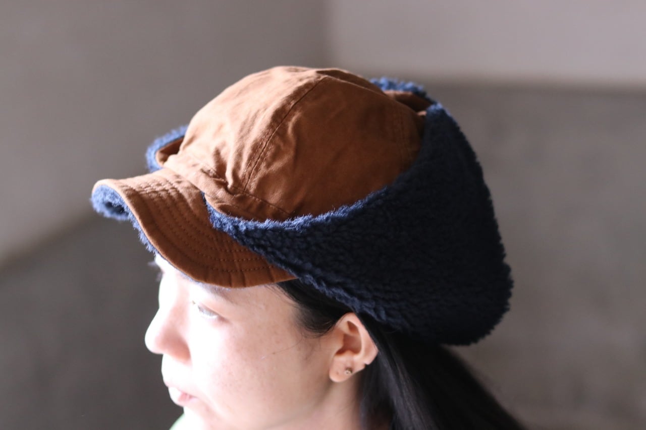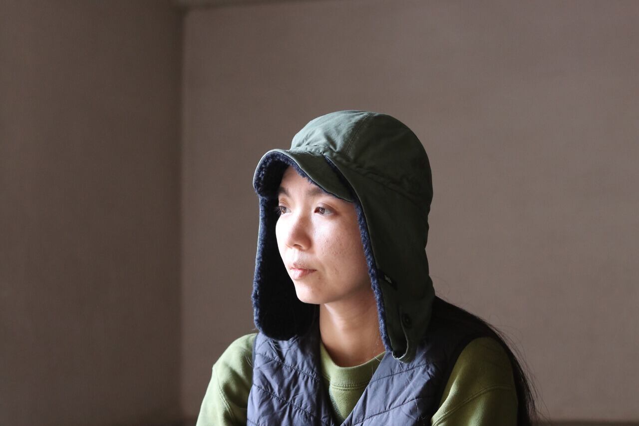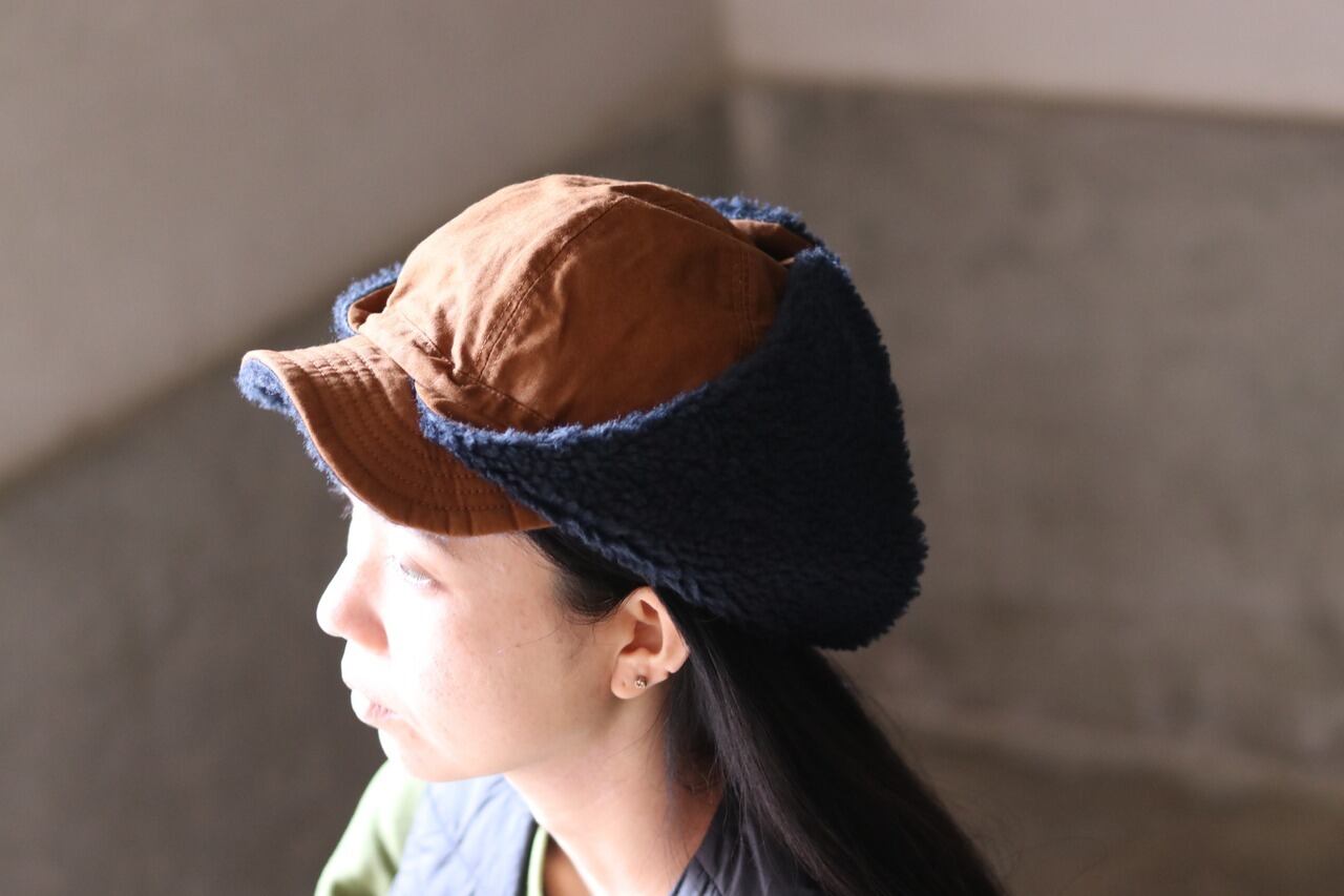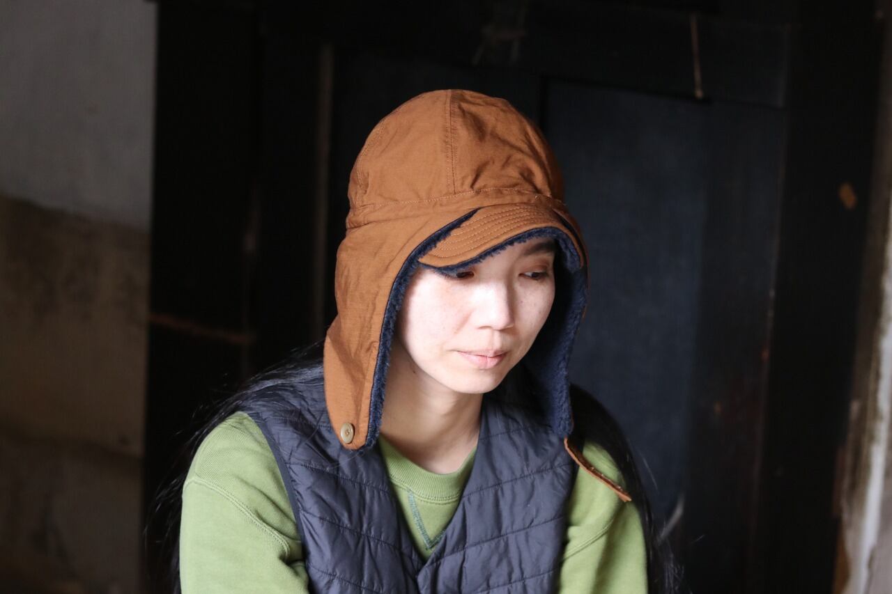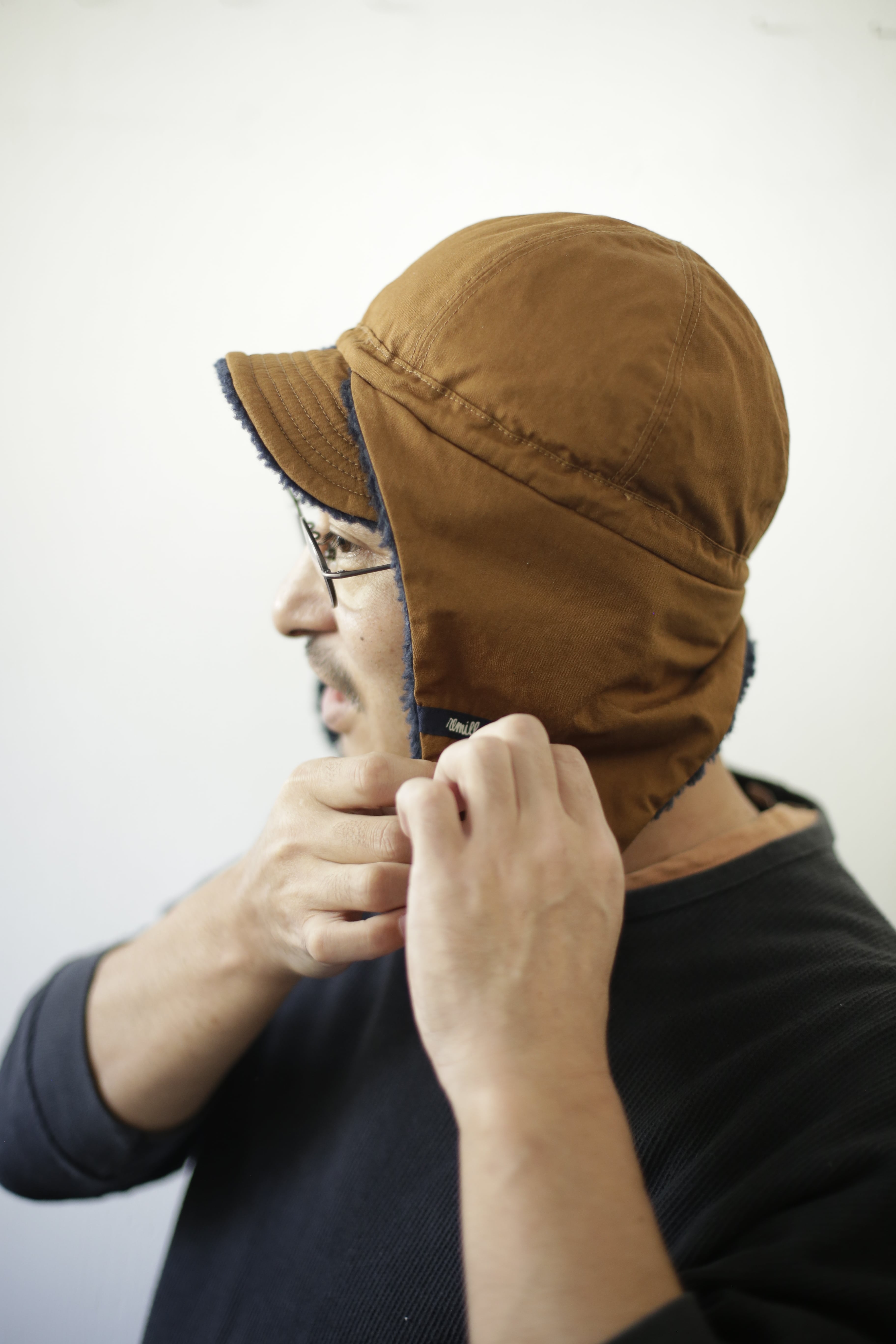 を新たに再構築しました。異なる2種類の表生地の仕様。1つは経緯共にコットンコーデュラのムラ糸を使用したウェザークロス生地。1つは8ozのデニムで縦糸と横糸それぞれ別な色に染め上げた糸で織られた、深みを感じるインディゴ。それぞれ使い込む程に表情を魅せる表地に、耳当て裏には包まれる安心感と温かみのあるシープボアを使用しました。