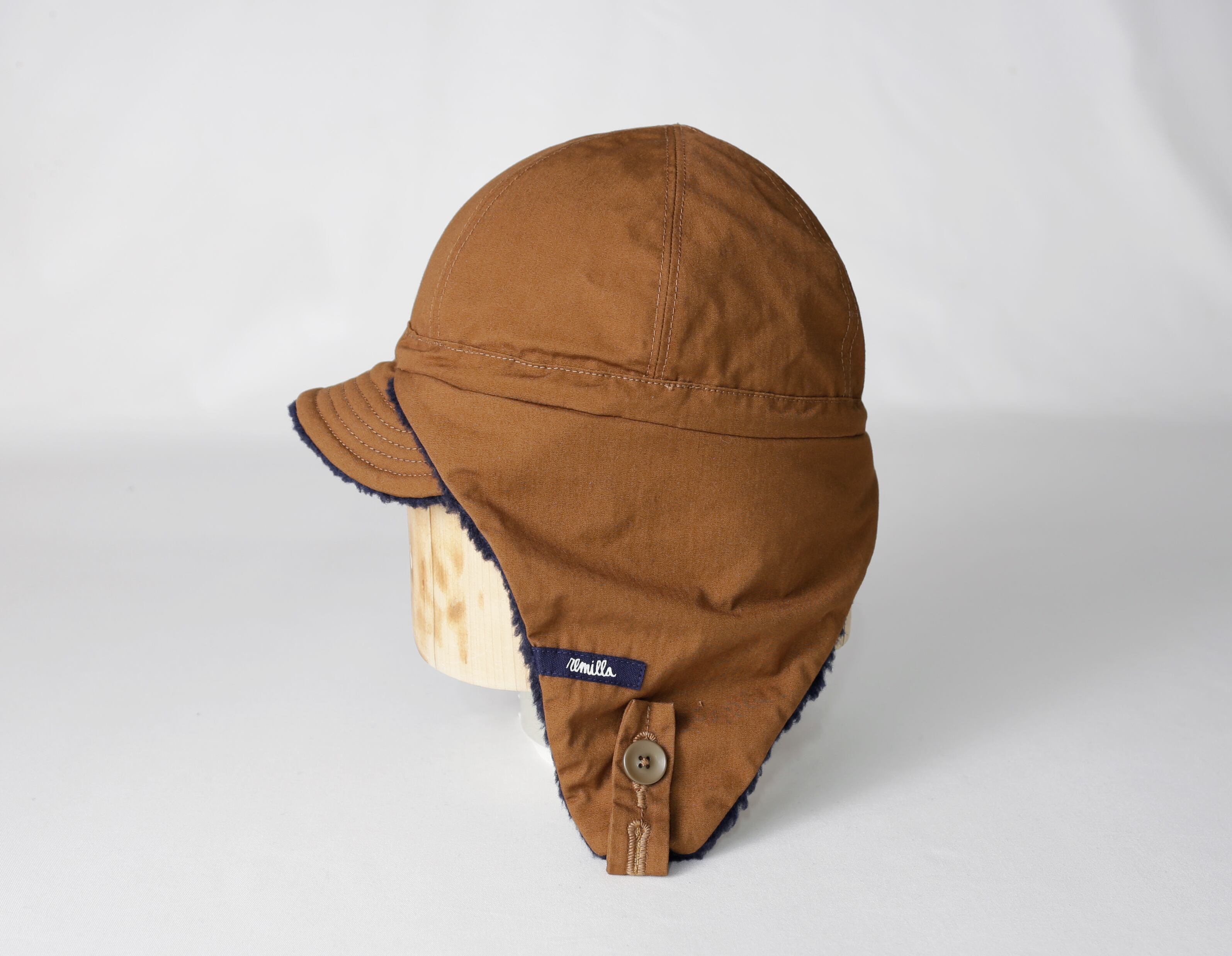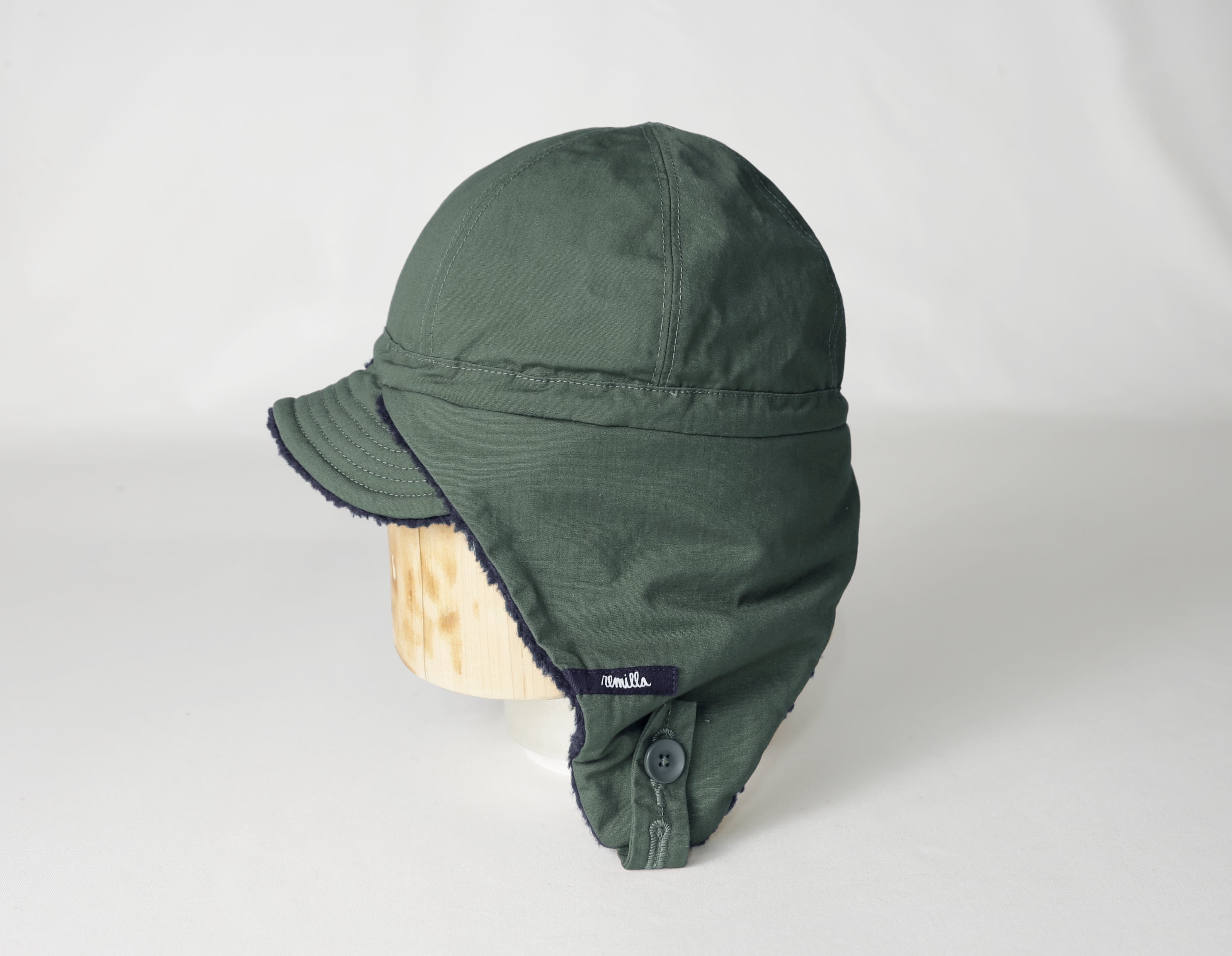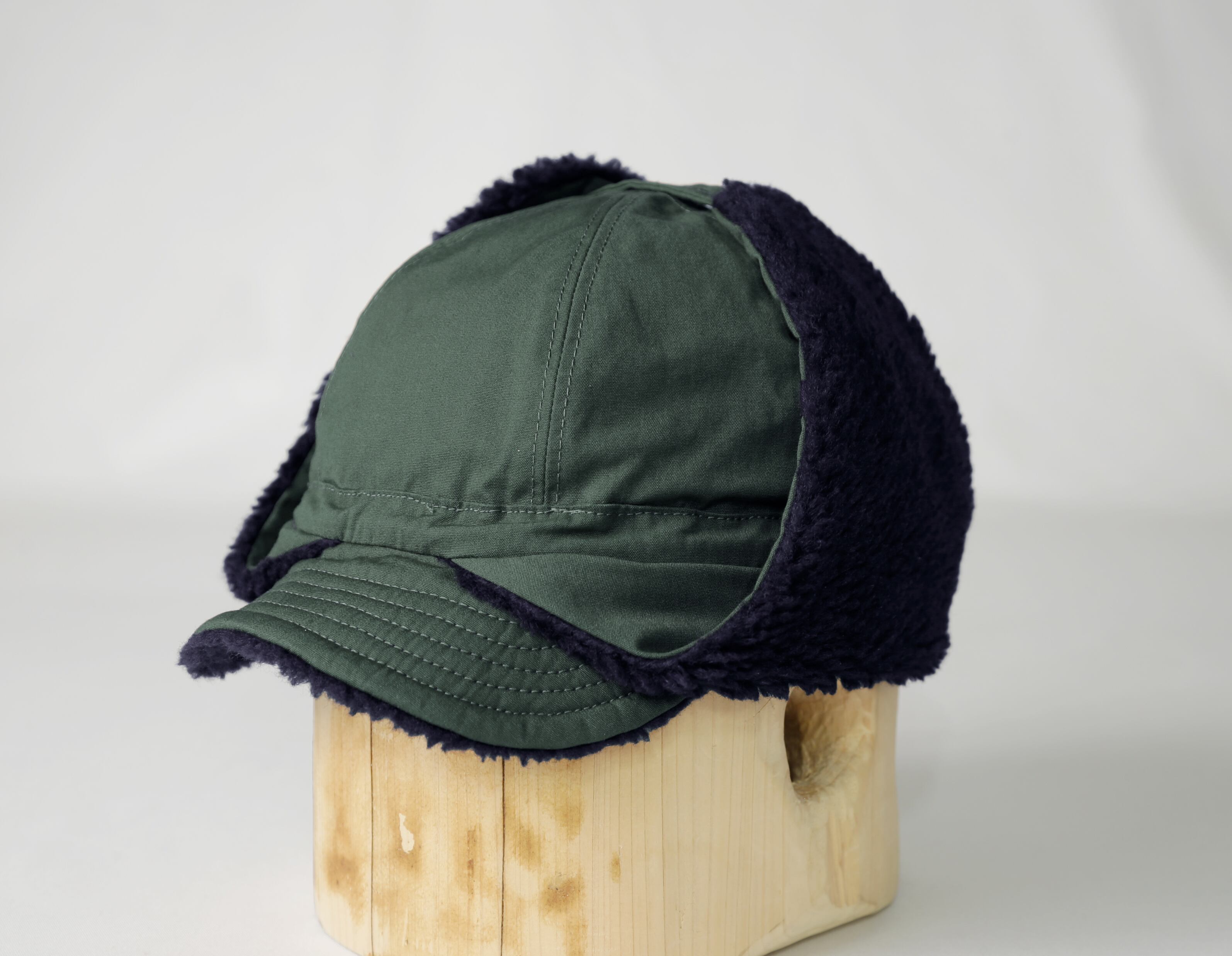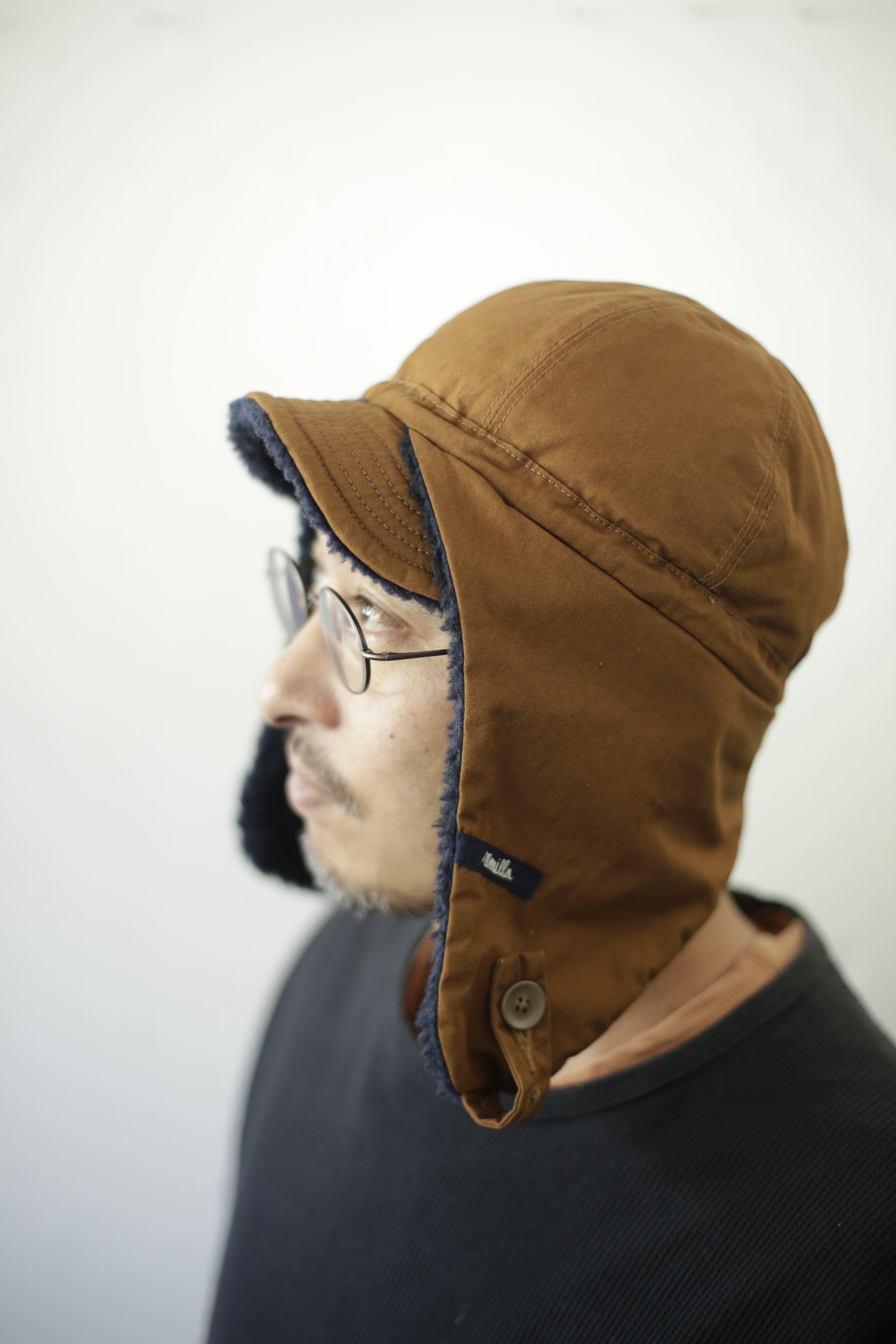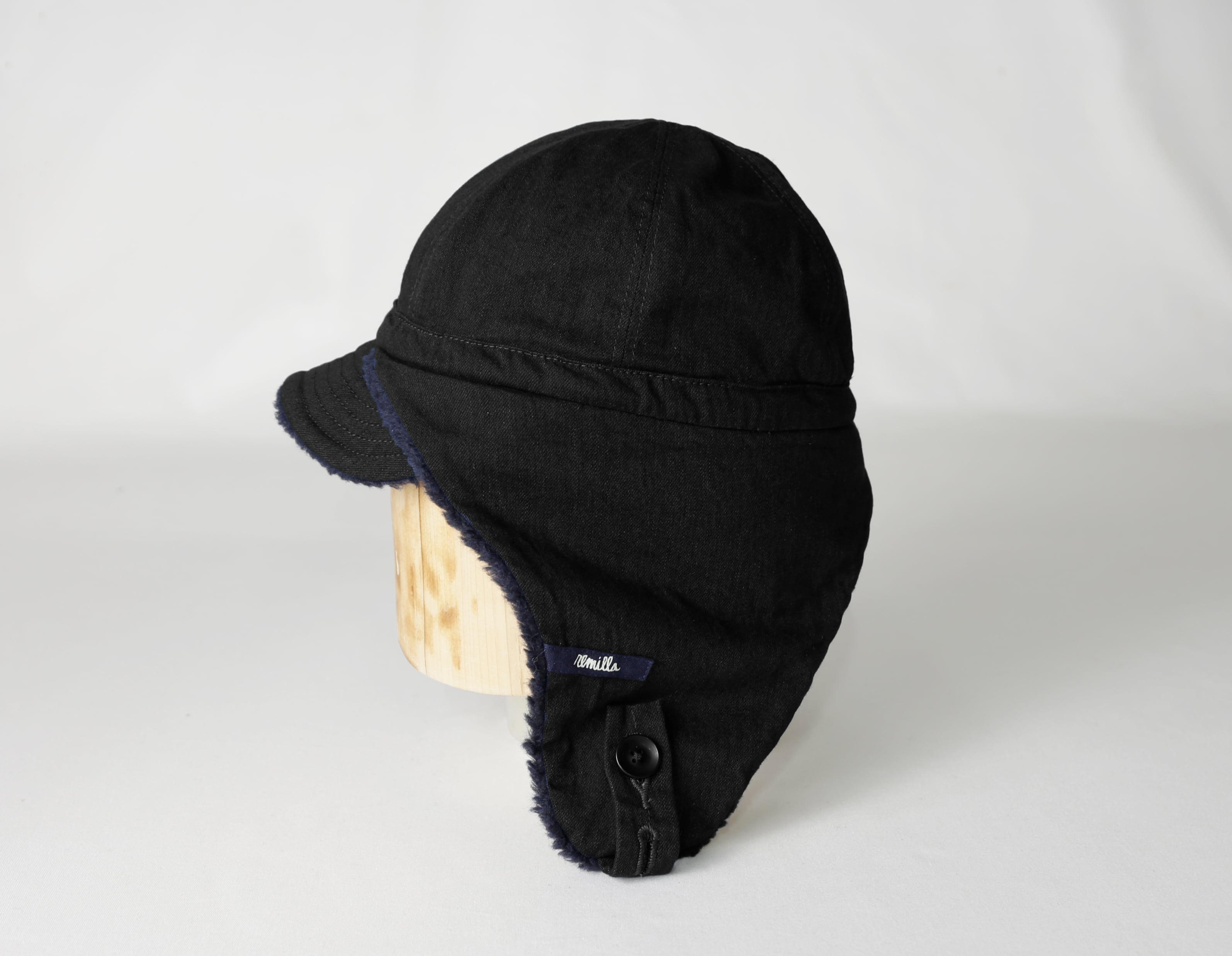 を新たに再構築しました。異なる2種類の表生地の仕様。1つは経緯共にコットンコーデュラのムラ糸を使用したウェザークロス生地。1つは8ozのデニムで縦糸と横糸それぞれ別な色に染め上げた糸で織られた、深みを感じるインディゴ。それぞれ使い込む程に表情を魅せる表地に、耳当て裏には包まれる安心感と温かみのあるシープボアを使用しました。