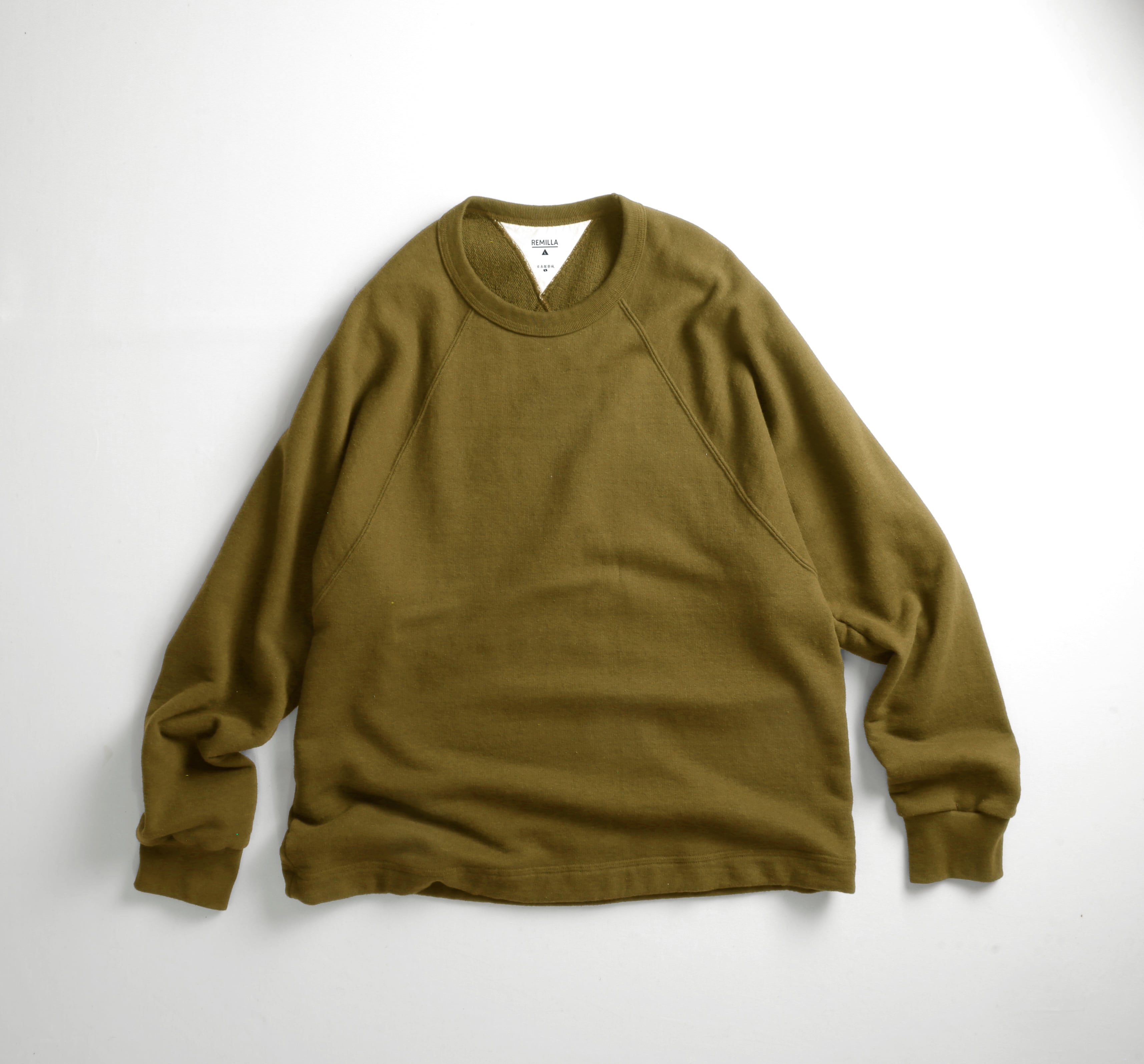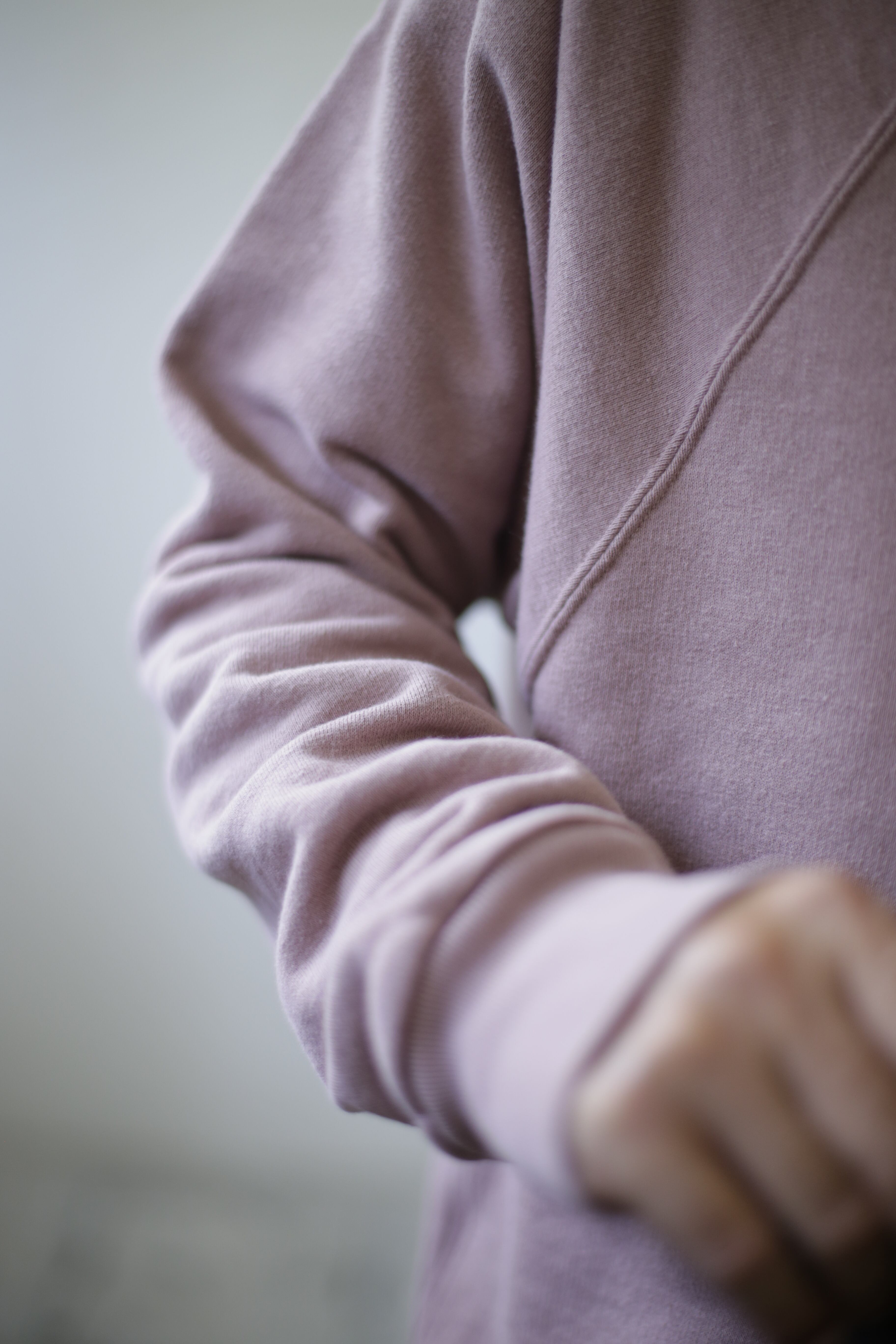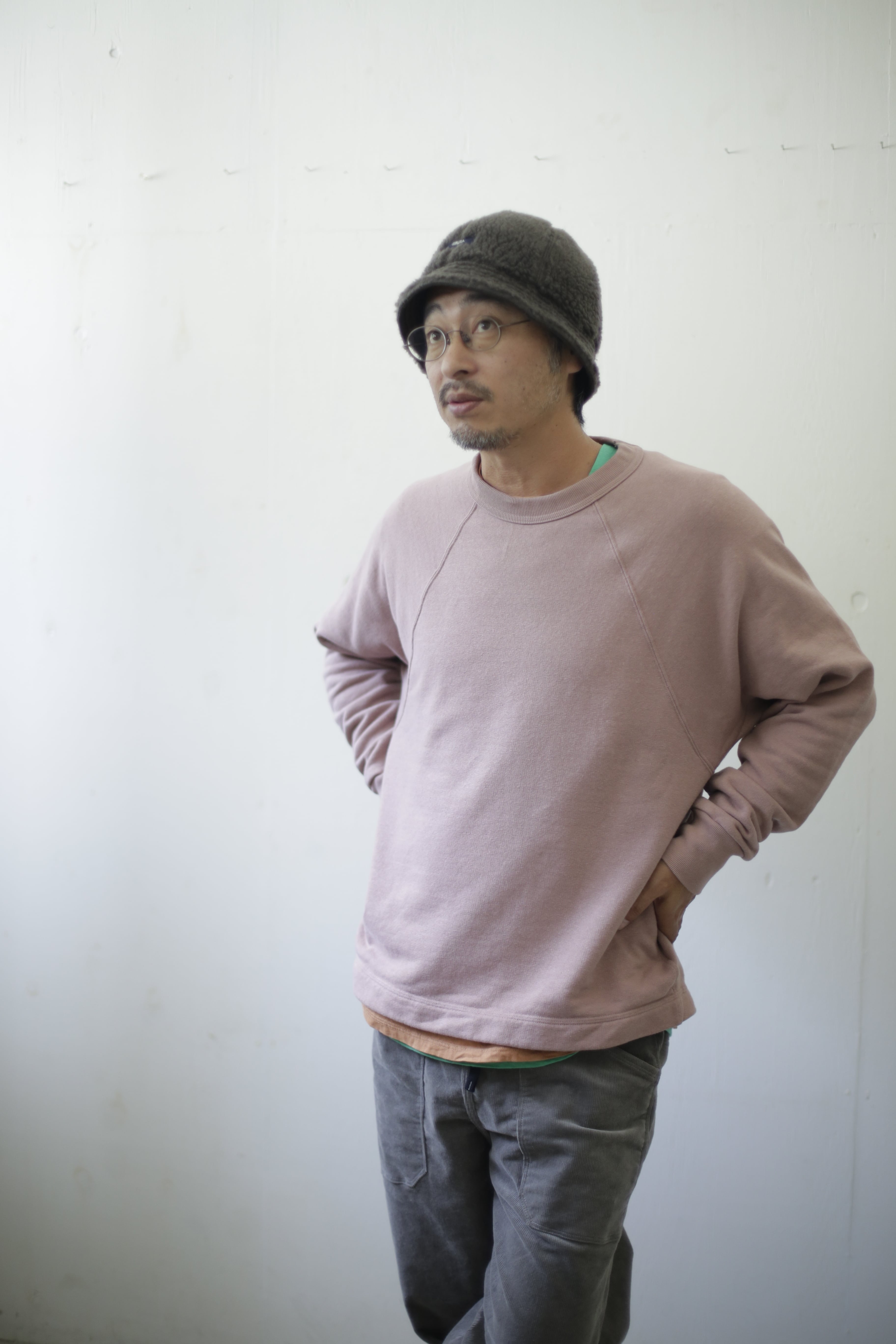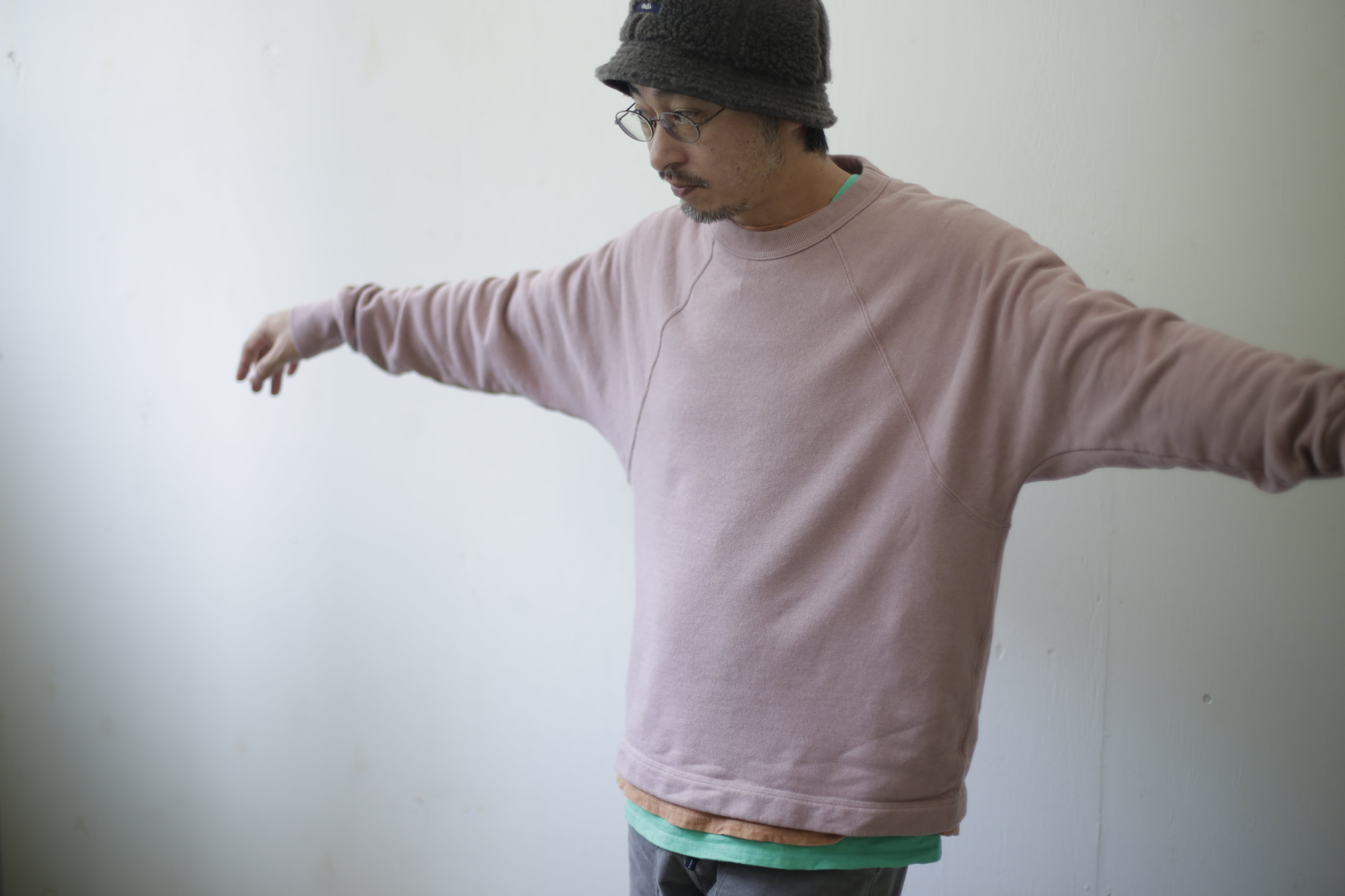 【商品紹介】リサイクル糸が持つ自然なムラ感がある生地目、ふんわり柔らかさが持ち味の裏毛を使用。作りの特徴として、大きなラグランのような切り替えに加え、背中側はクロスするのが特徴で、着たときの背中見が気に入ってます。首と袖口にはリブが付きますが、袖はリブを無くしヘム折りすることで、ストンと落ちる設計に。軽さと肌触りの良さでレイヤードを楽しむイメージの重宝するアイテムです。