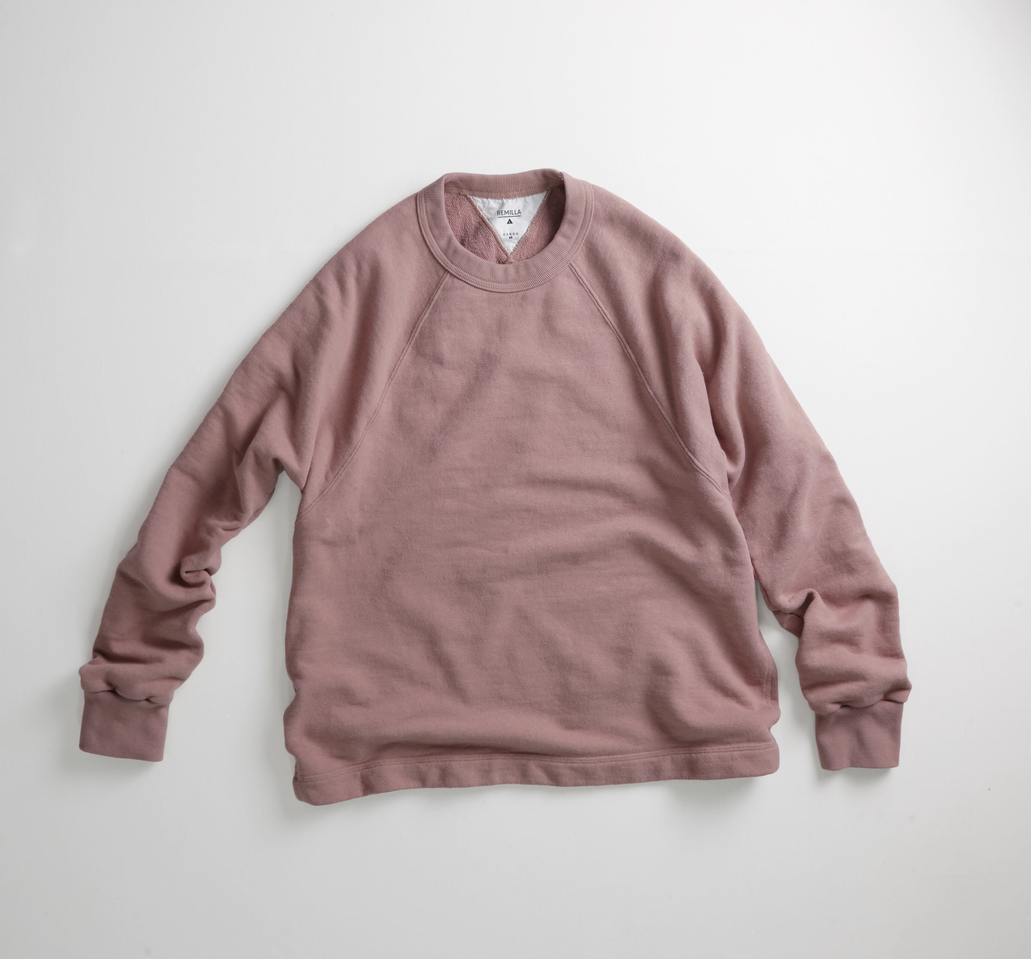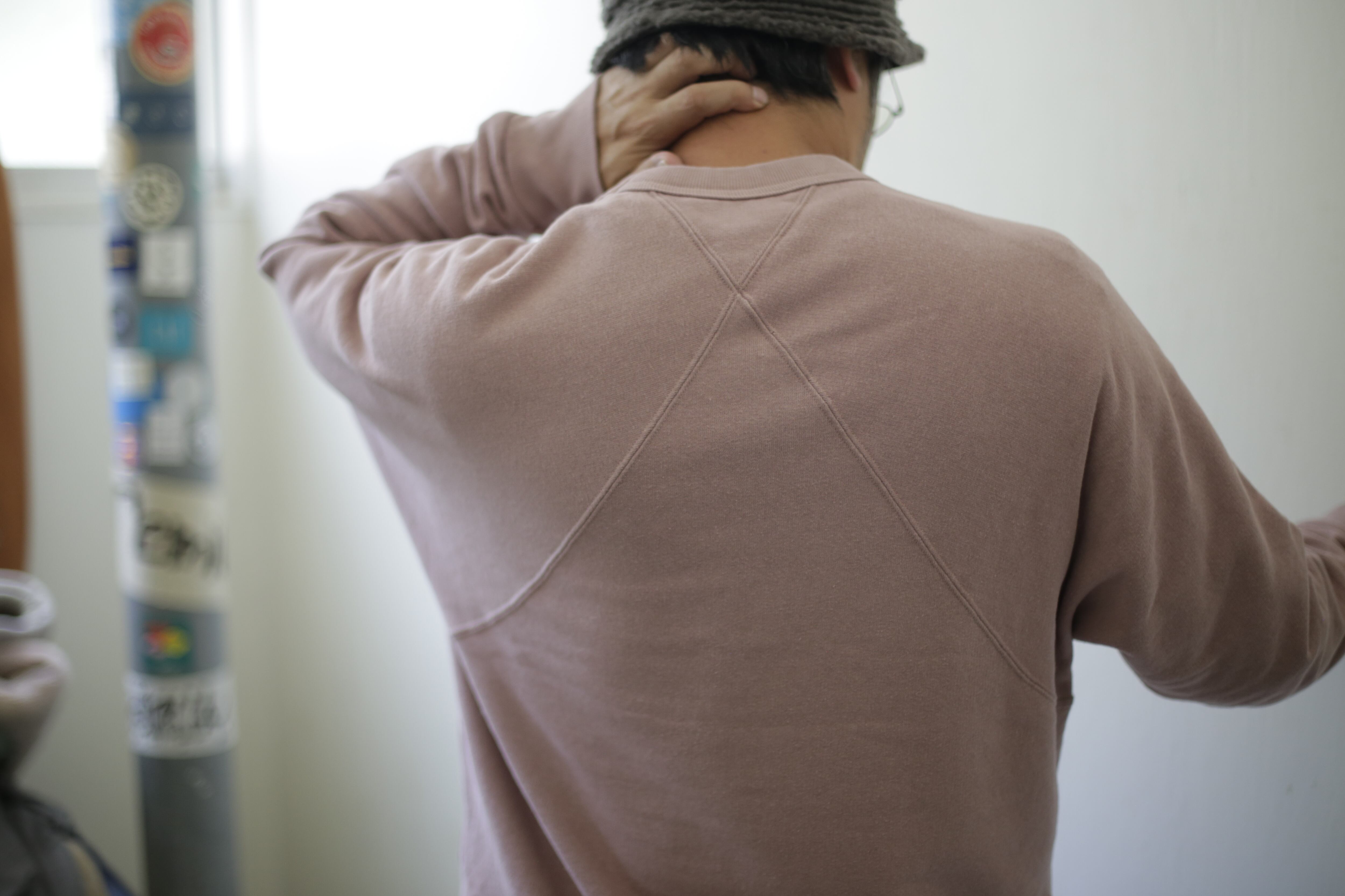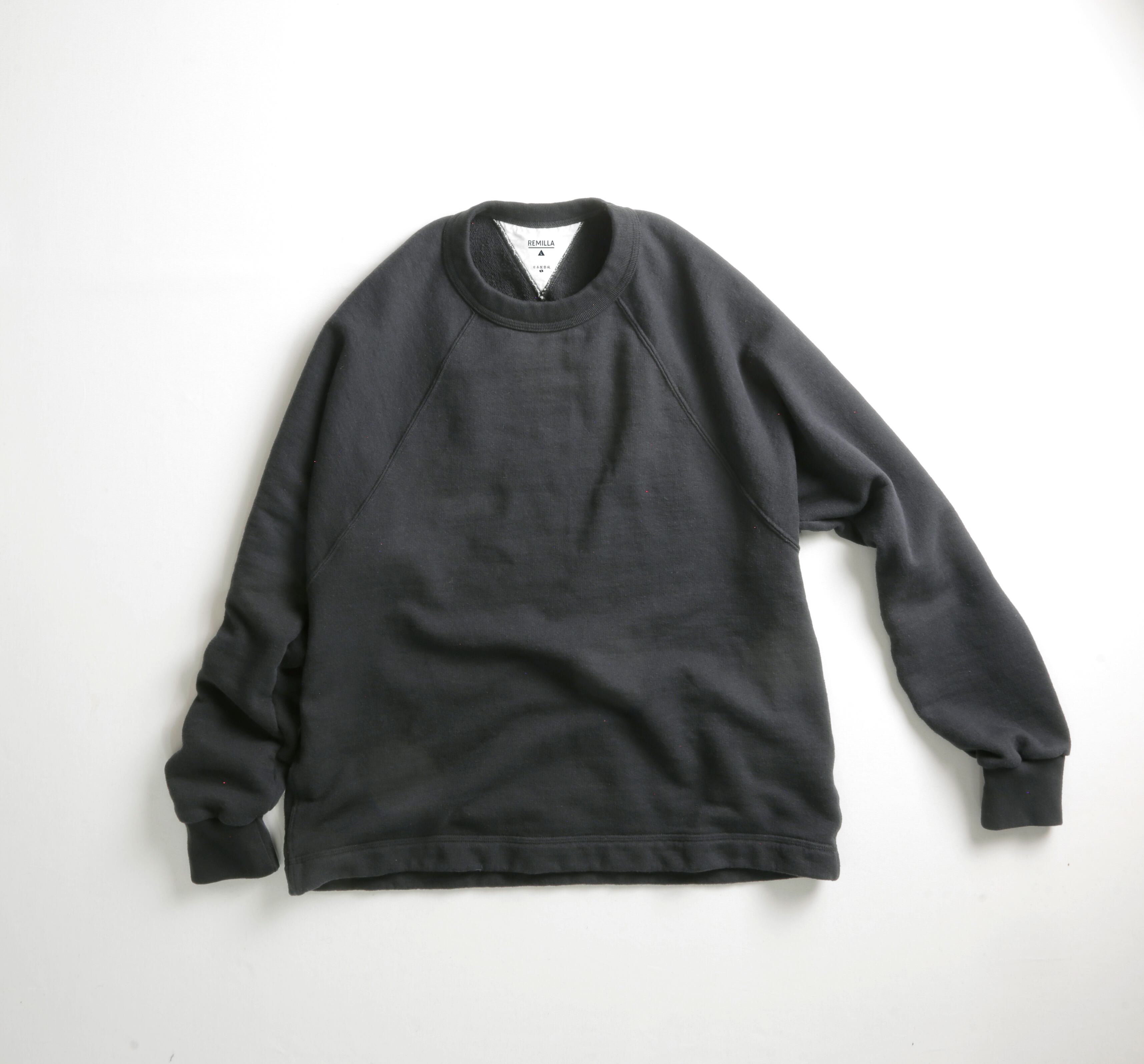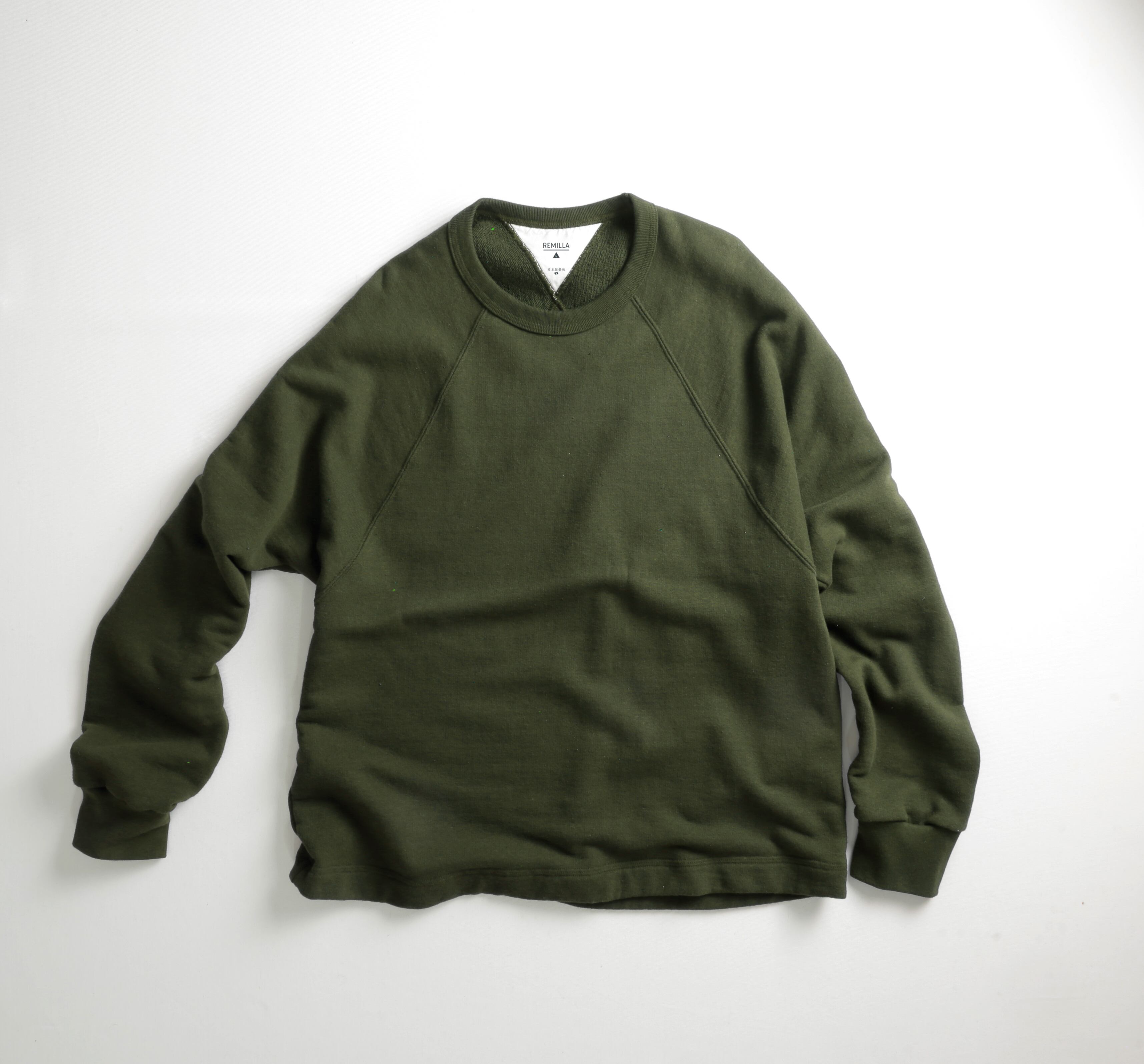 【商品紹介】リサイクル糸が持つ自然なムラ感がある生地目、ふんわり柔らかさが持ち味の裏毛を使用。作りの特徴として、大きなラグランのような切り替えに加え、背中側はクロスするのが特徴で、着たときの背中見が気に入ってます。首と袖口にはリブが付きますが、袖はリブを無くしヘム折りすることで、ストンと落ちる設計に。軽さと肌触りの良さでレイヤードを楽しむイメージの重宝するアイテムです。