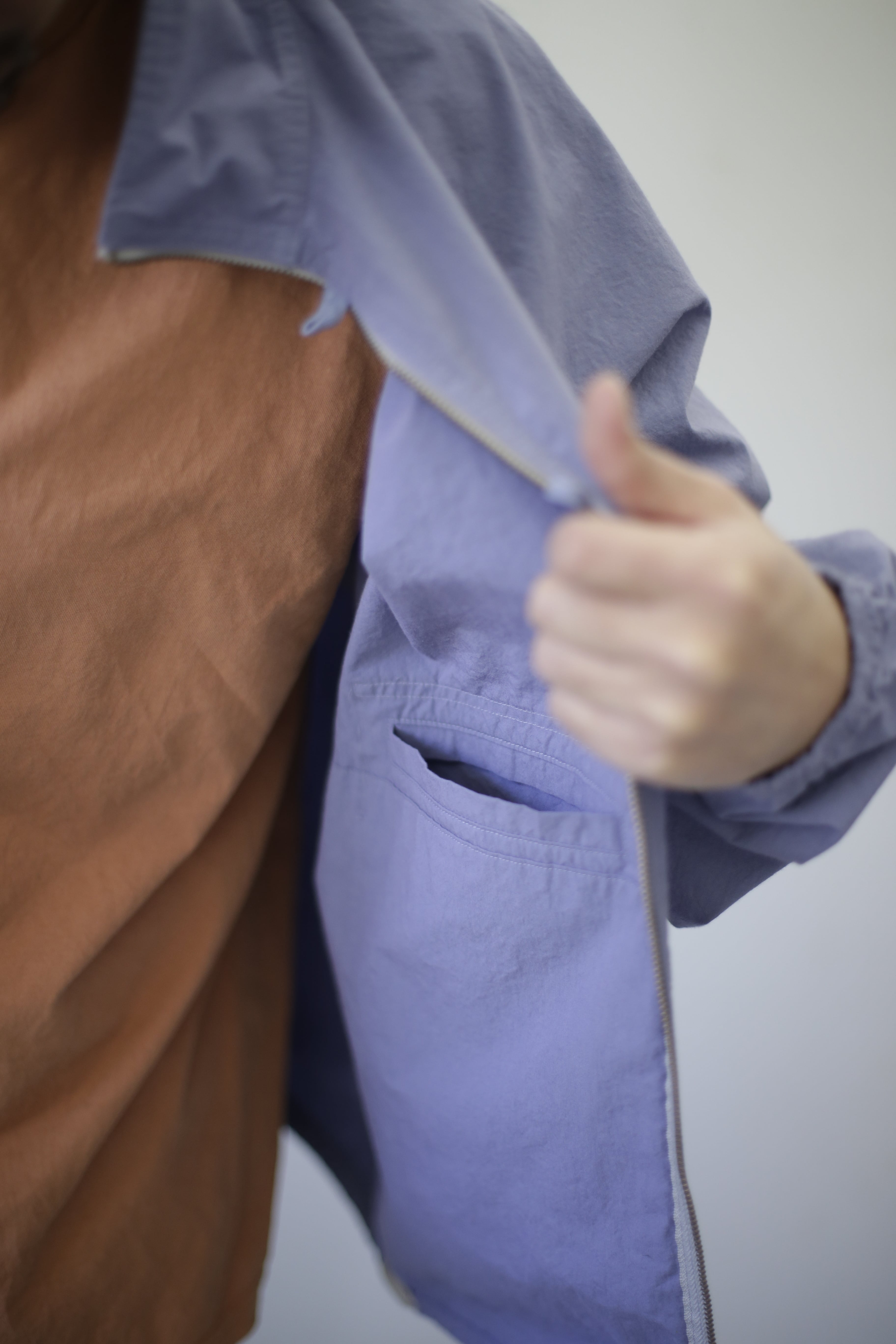 特徴的な作りとしては、胸元に簡易的な作りのループボタンが2つ付き、ファスナーを閉いてボタ ンで止めればマント的な羽織り着としても使えます。左胸下にアンバランスに付く膨らみを持たせたポ ケット袋布は 、一見外側に付いたポケットに見えて、実は肉側からアクセスする内ポケット? という風変わな作り。試着した人がポケット口を探してまさぐる天邪鬼使用!