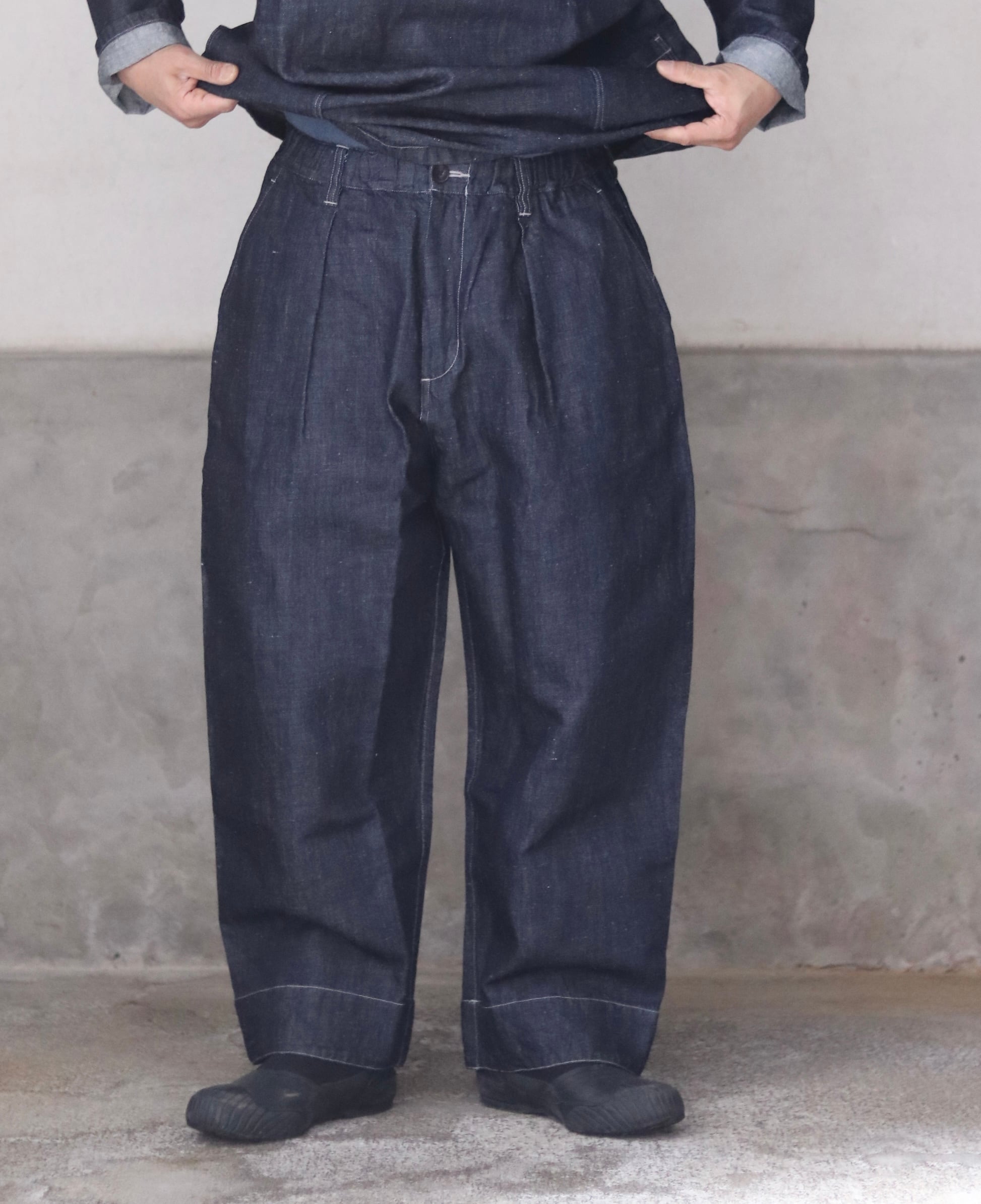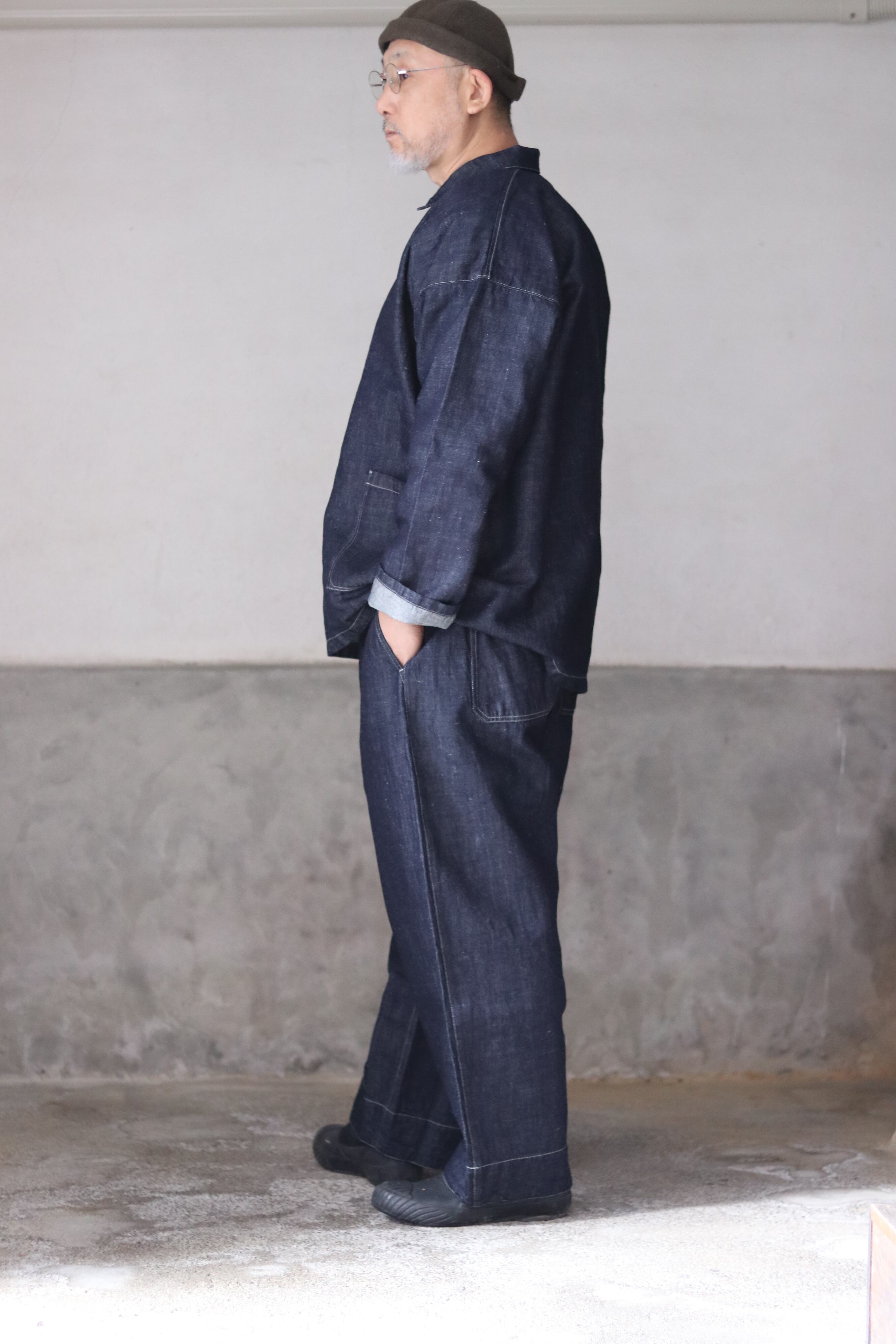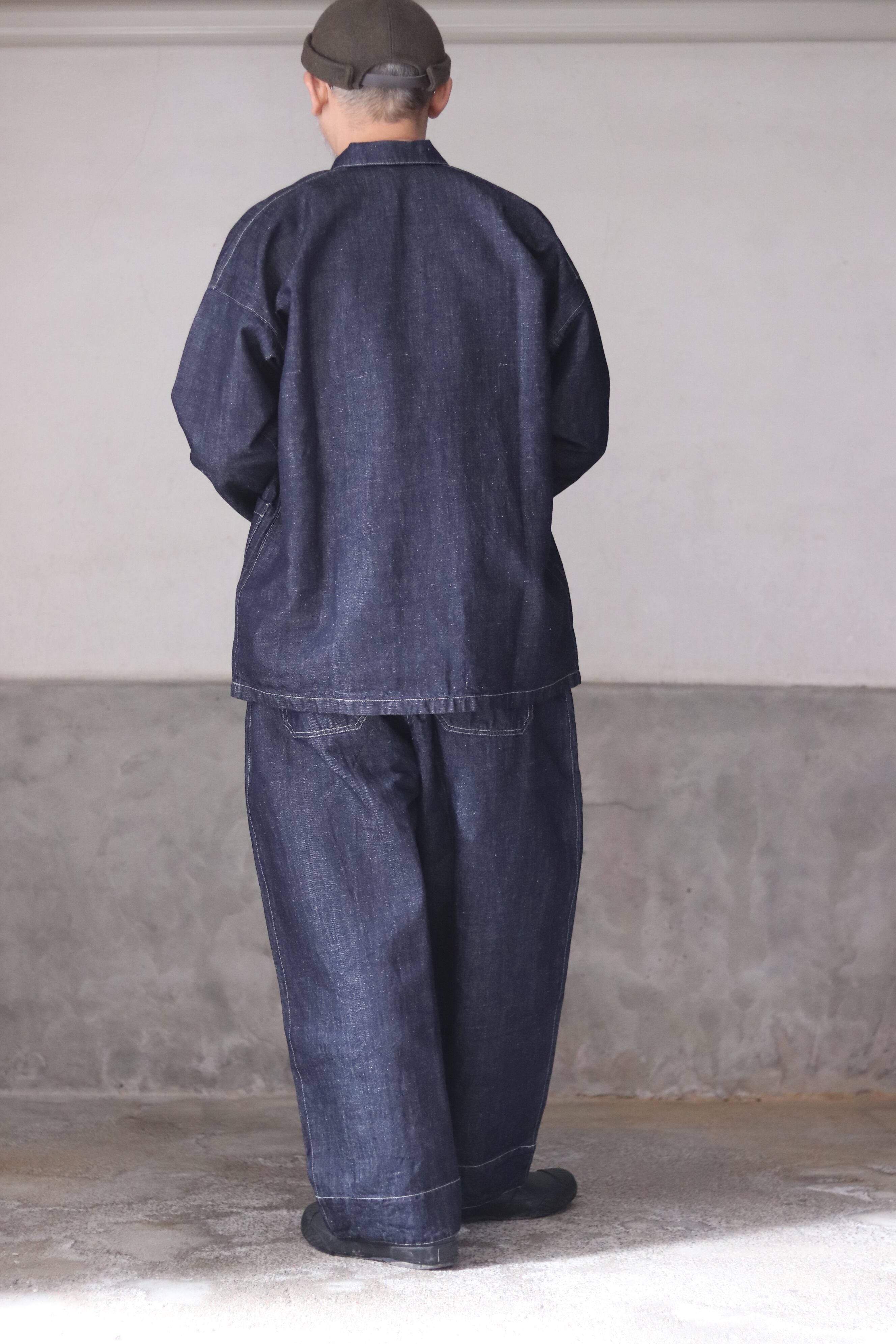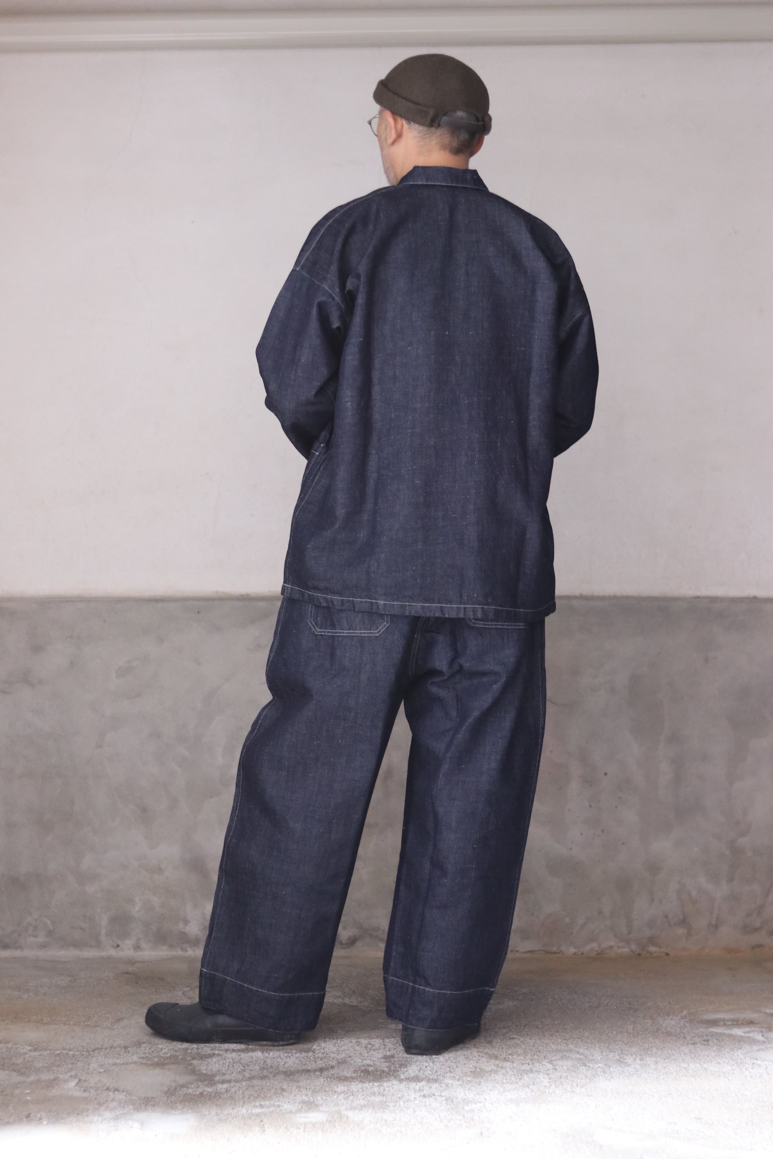 テーパードを入れたワイド型・九分丈のパンツで、新しいシルエットの提案です。ワークウェアの文脈を踏まえながらも、既存のジーンズの形を踏襲せず、MITTAN独自の日常の道具として再定義しました。ウエストベルト全体に伸縮素材を入れ、前開きの仕様を採用しています。本体の脇と内股はシンプルな縫製にすることで、生地への負担を軽減しつつ、修理のしやすさも考慮しています。ボタンには水牛の角を採用しています。