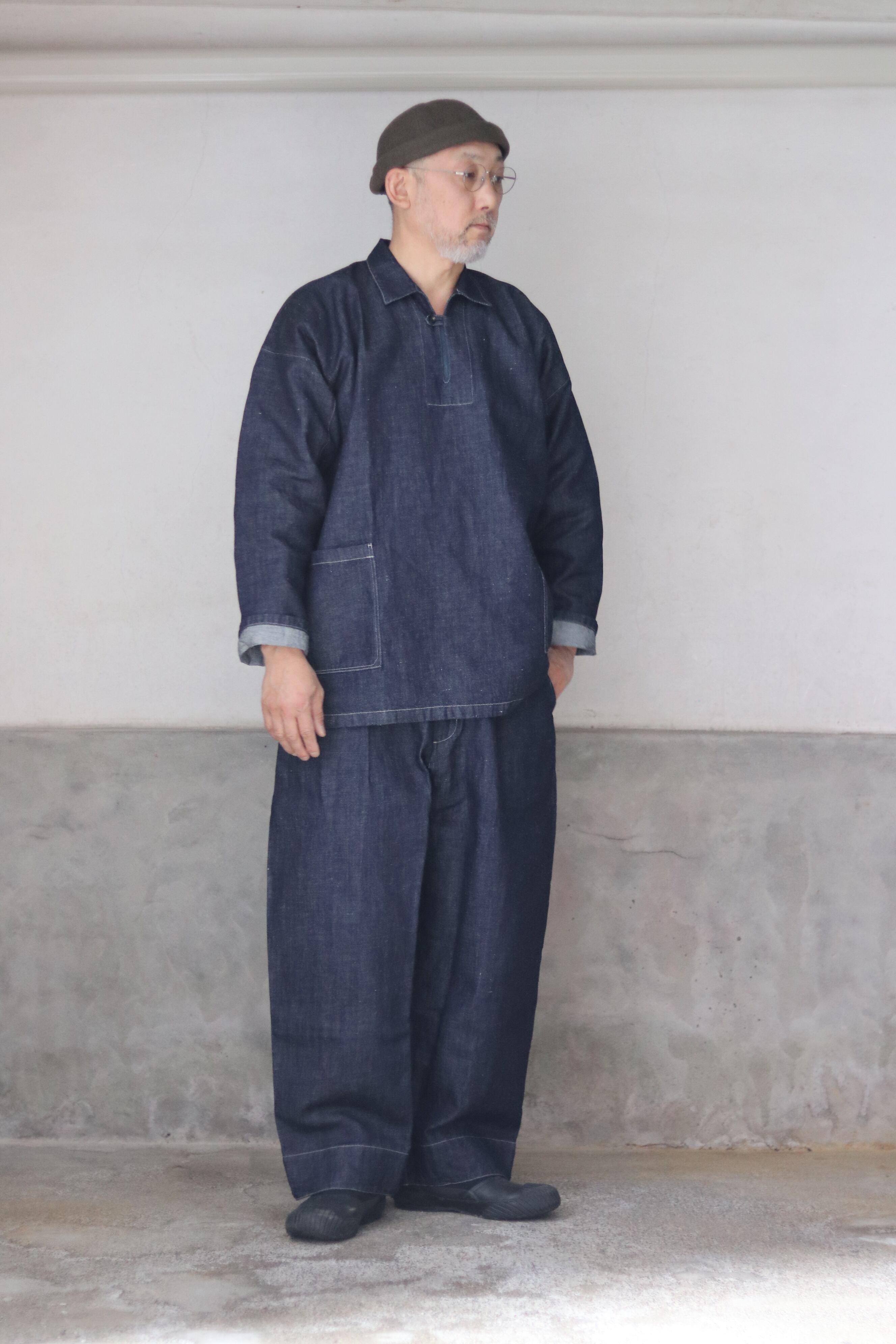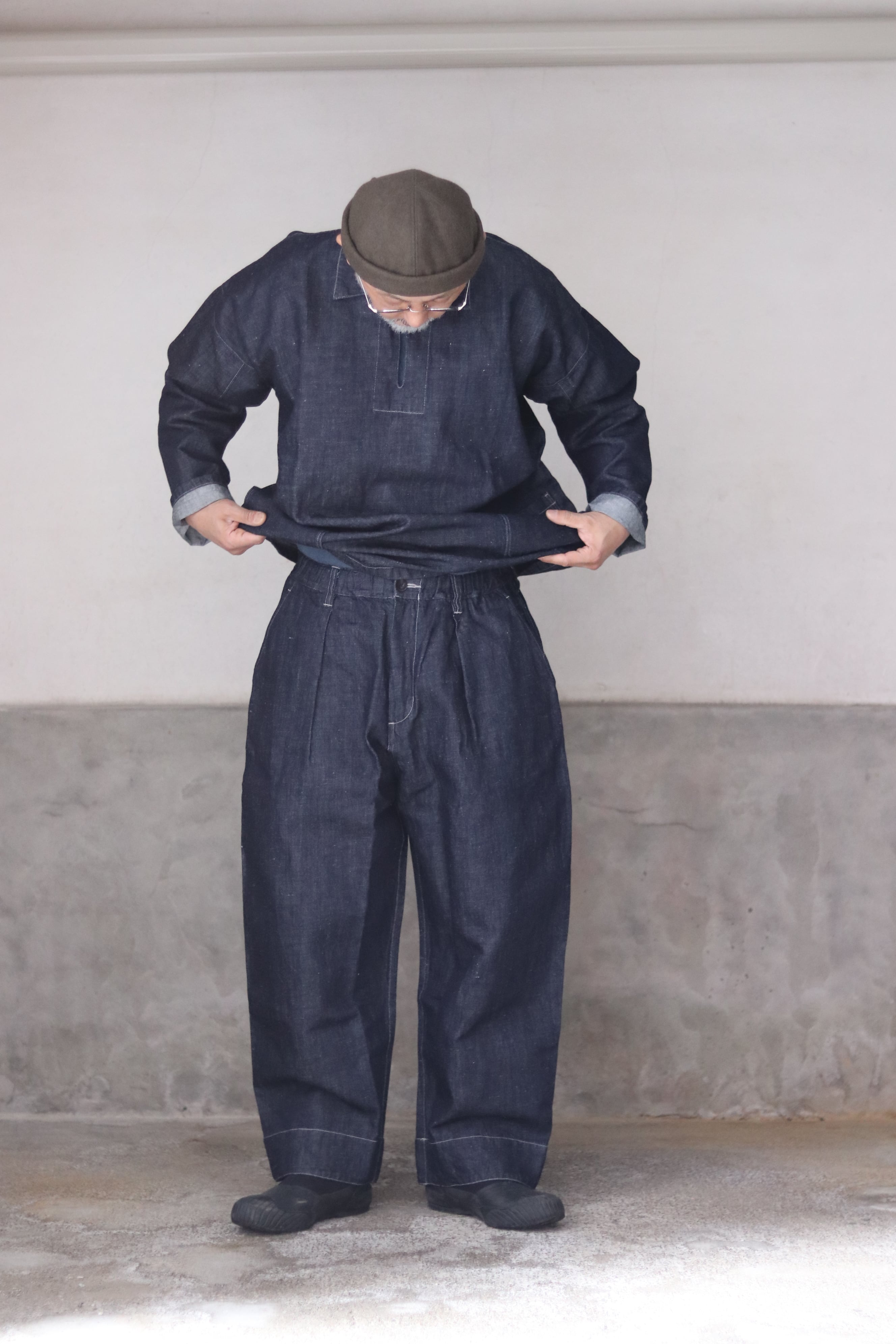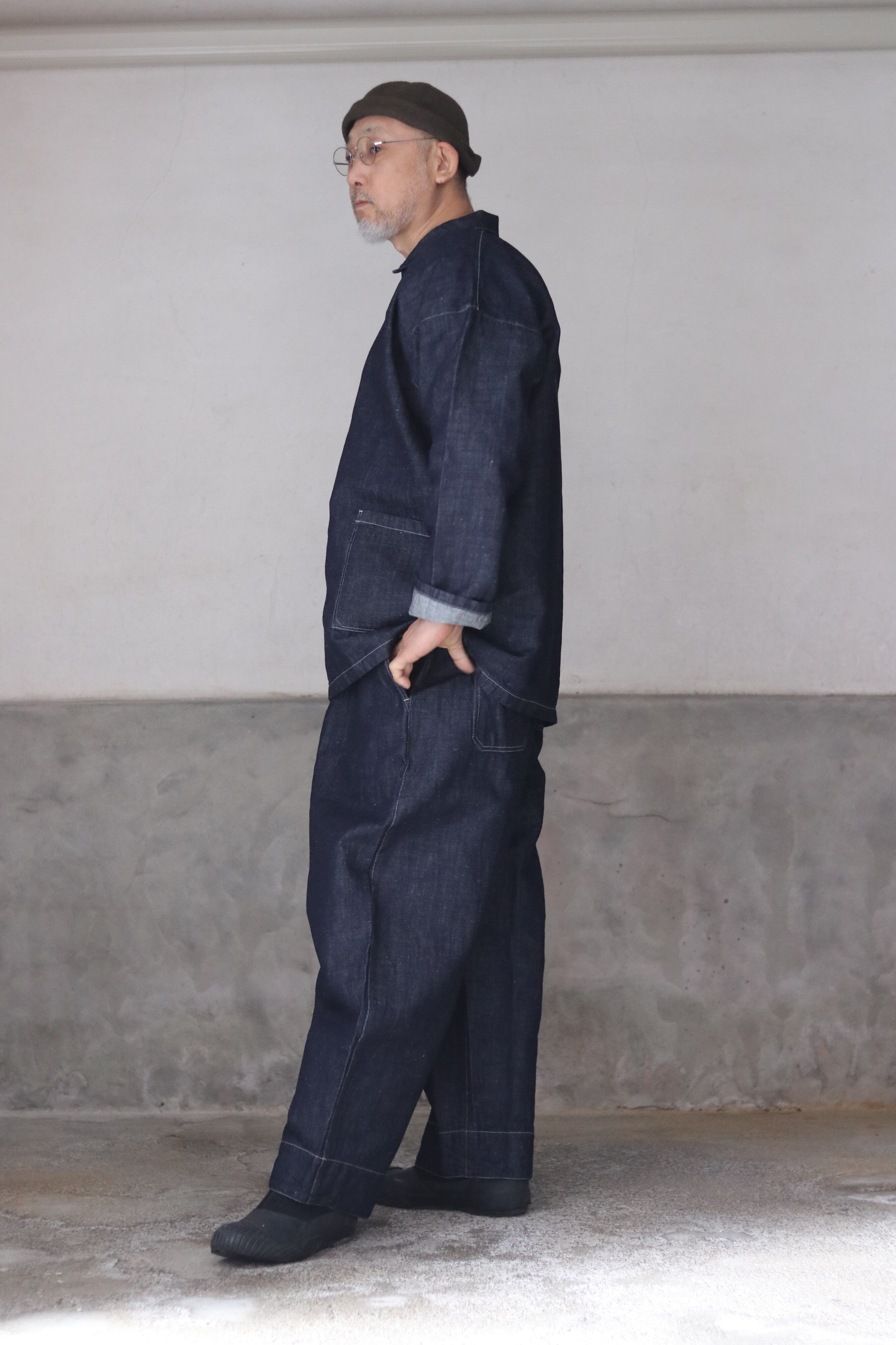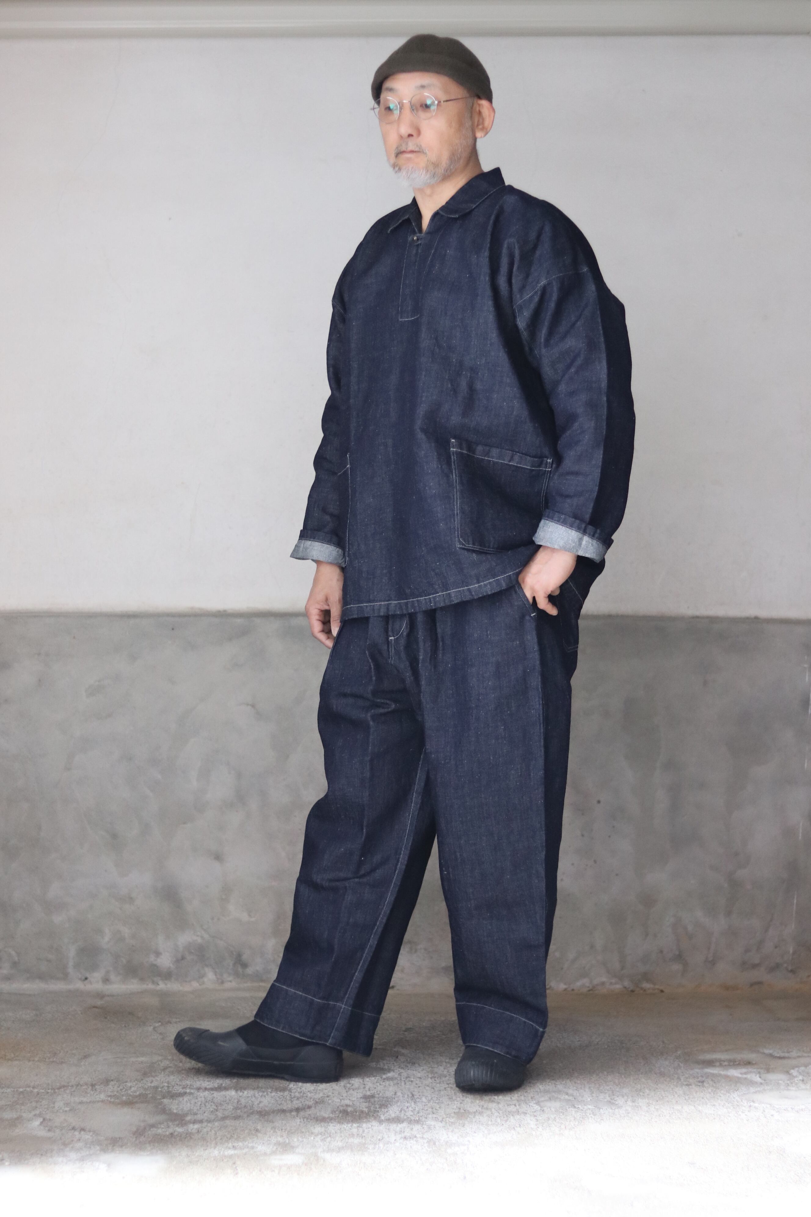 テーパードを入れたワイド型・九分丈のパンツで、新しいシルエットの提案です。ワークウェアの文脈を踏まえながらも、既存のジーンズの形を踏襲せず、MITTAN独自の日常の道具として再定義しました。ウエストベルト全体に伸縮素材を入れ、前開きの仕様を採用しています。本体の脇と内股はシンプルな縫製にすることで、生地への負担を軽減しつつ、修理のしやすさも考慮しています。ボタンには水牛の角を採用しています。