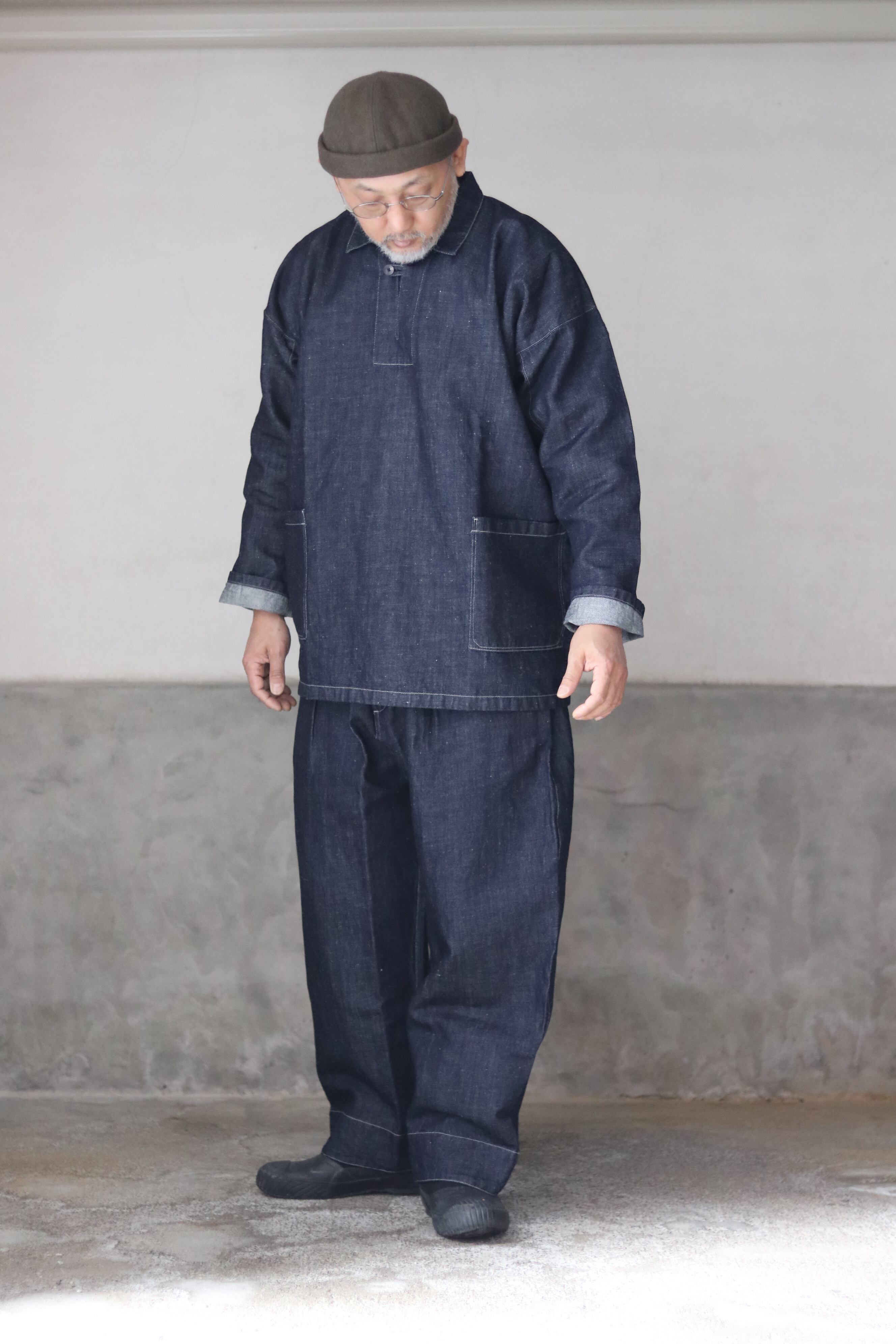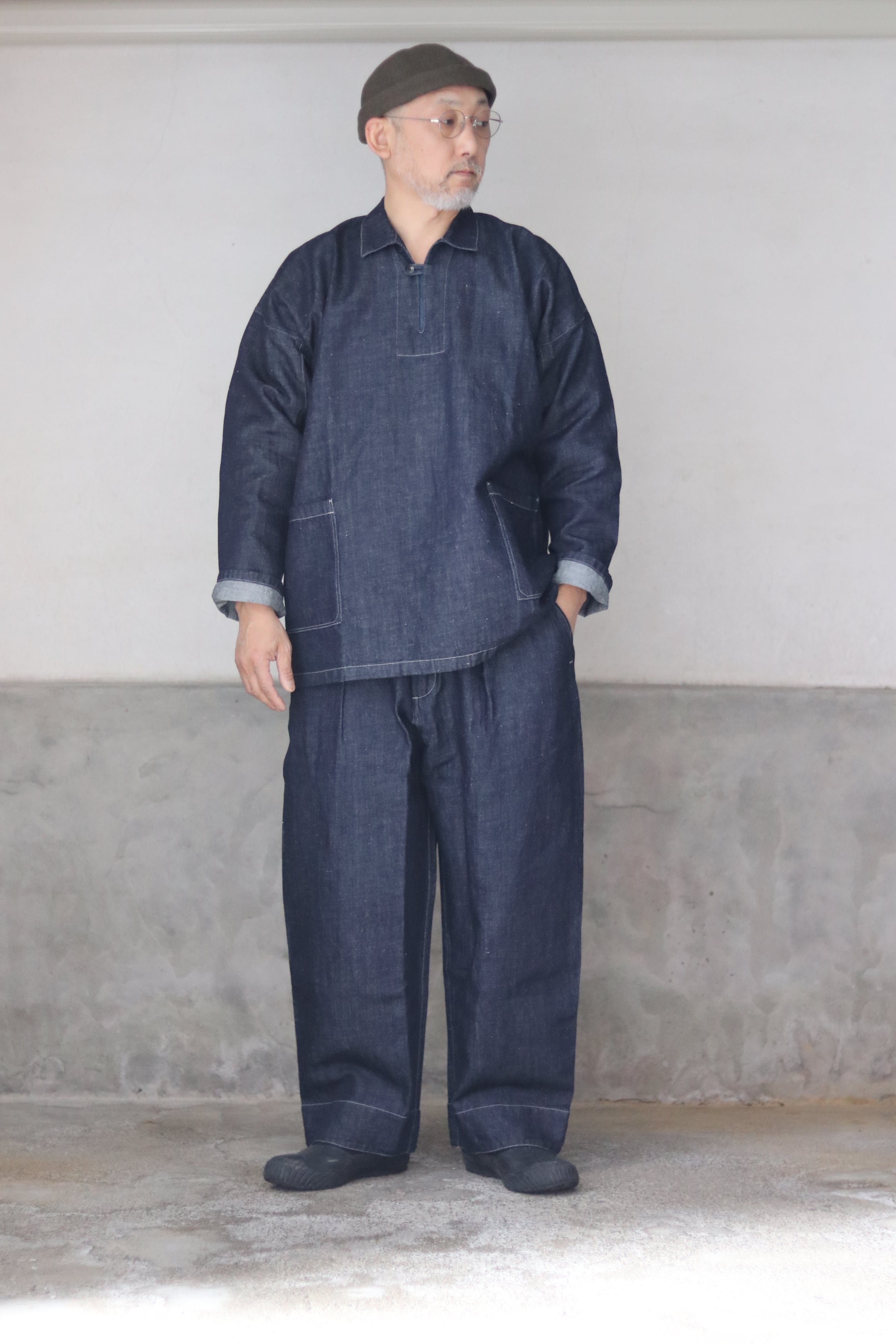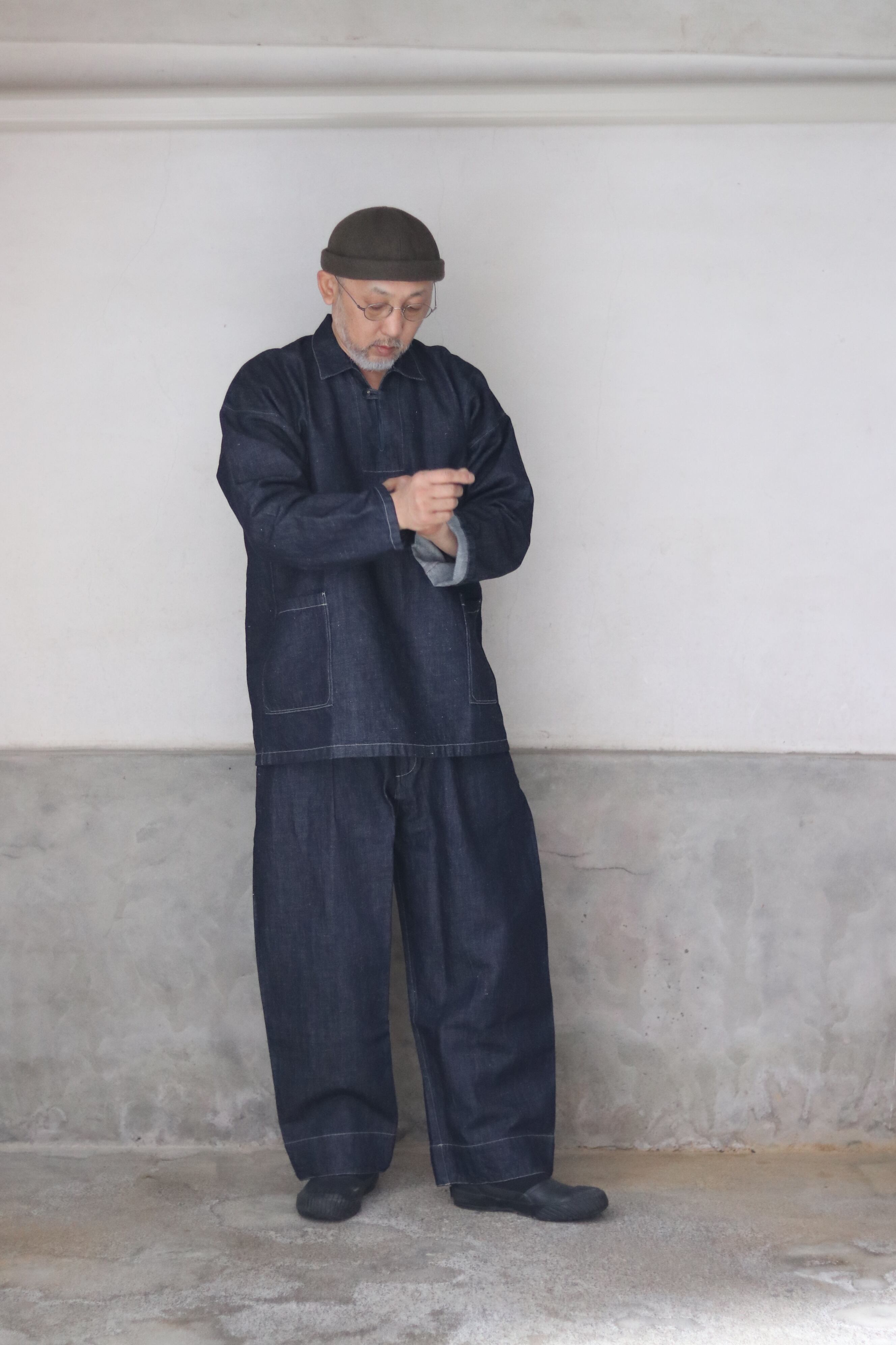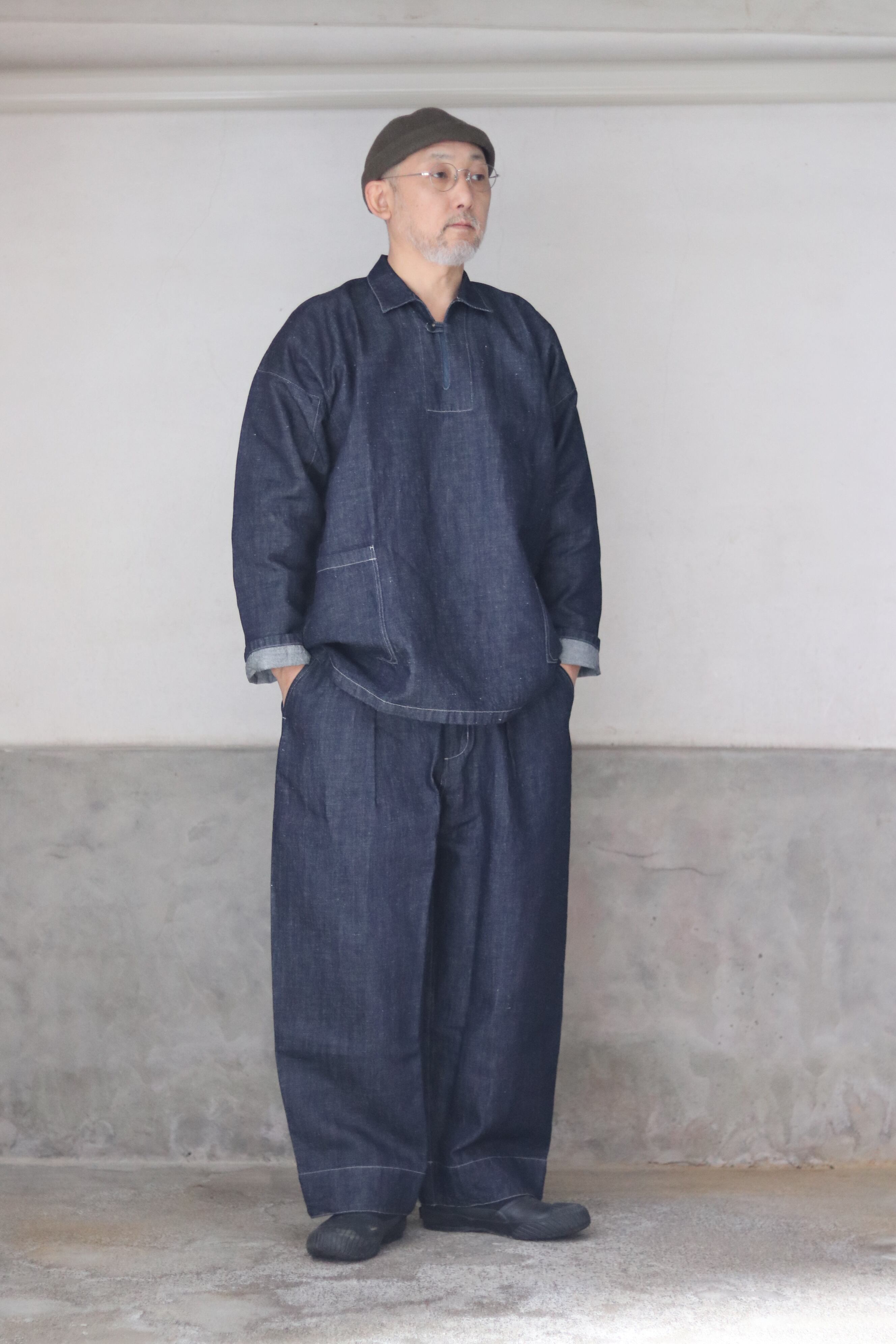テーパードを入れたワイド型・九分丈のパンツで、新しいシルエットの提案です。ワークウェアの文脈を踏まえながらも、既存のジーンズの形を踏襲せず、MITTAN独自の日常の道具として再定義しました。ウエストベルト全体に伸縮素材を入れ、前開きの仕様を採用しています。本体の脇と内股はシンプルな縫製にすることで、生地への負担を軽減しつつ、修理のしやすさも考慮しています。ボタンには水牛の角を採用しています。