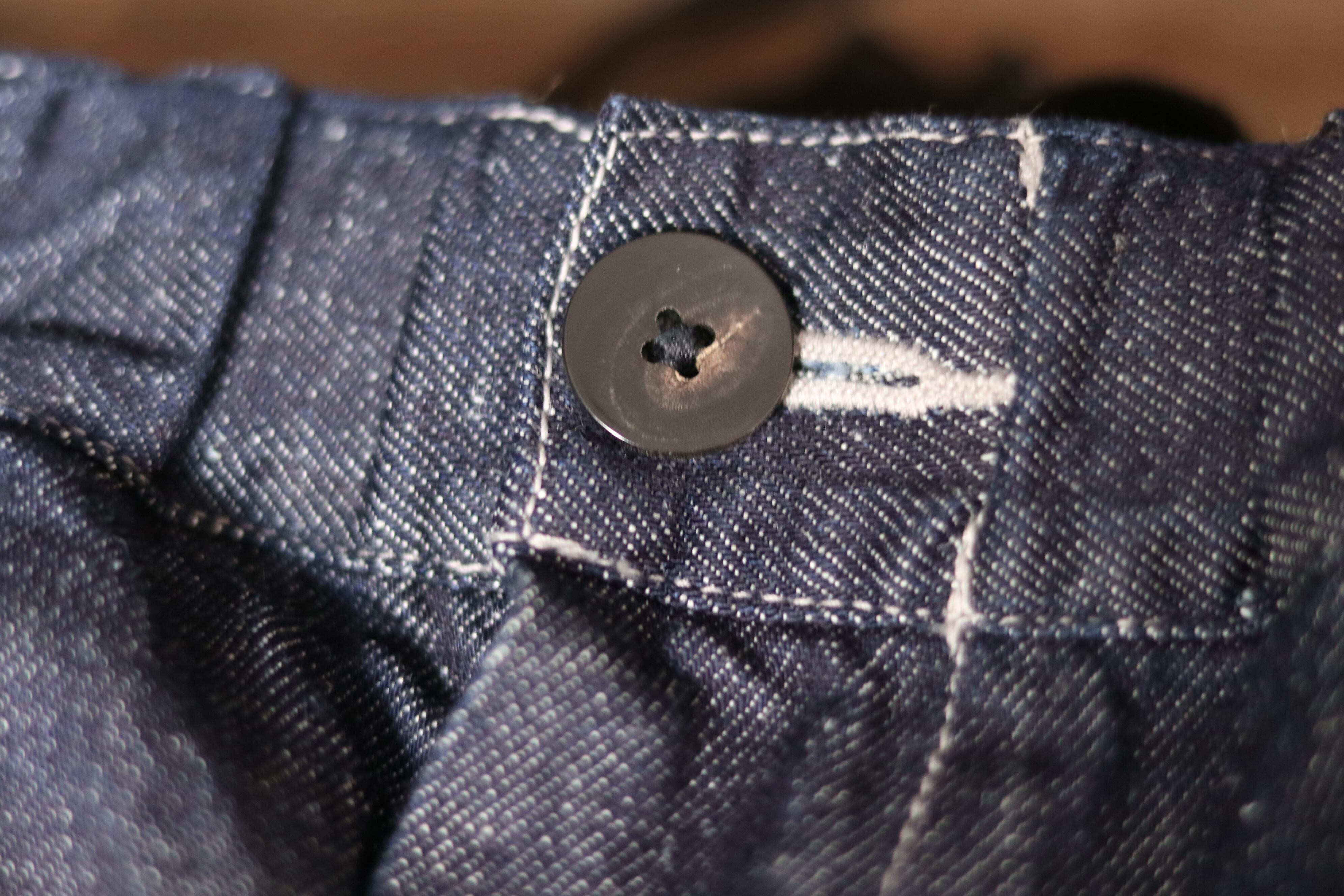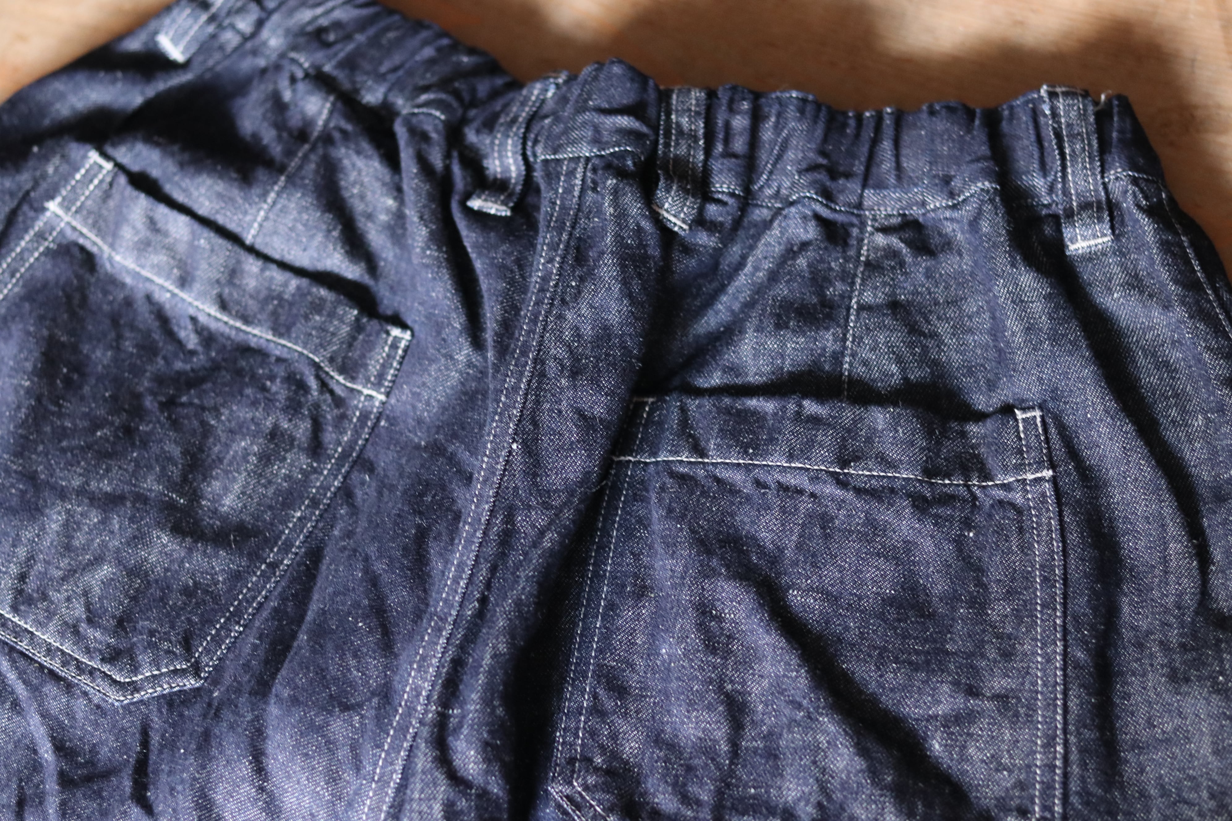 岡山県井原市で織り上げたオリジナルのデニム生地です。経糸にはオーガニックコットンを使用し、ロープ染色によって表面のみをインディゴで染め、糸の芯を白く残しています。緯糸には大麻を用いており、穿き込むほどにインディゴの色が薄く変化し、大麻も強度を保ちながら綿のようにしなやかに変化していきます。長い時間をかけて風合いが深まっていく様子を楽しめる生地です。厚みは、暑い季節から寒い季節まで通して着用できるよう設計しています。着用と洗濯を重ねることで糸がほぐれ、柔軟性が増し、肌側の大麻糸が清涼感のある肌当たりをもたらします。