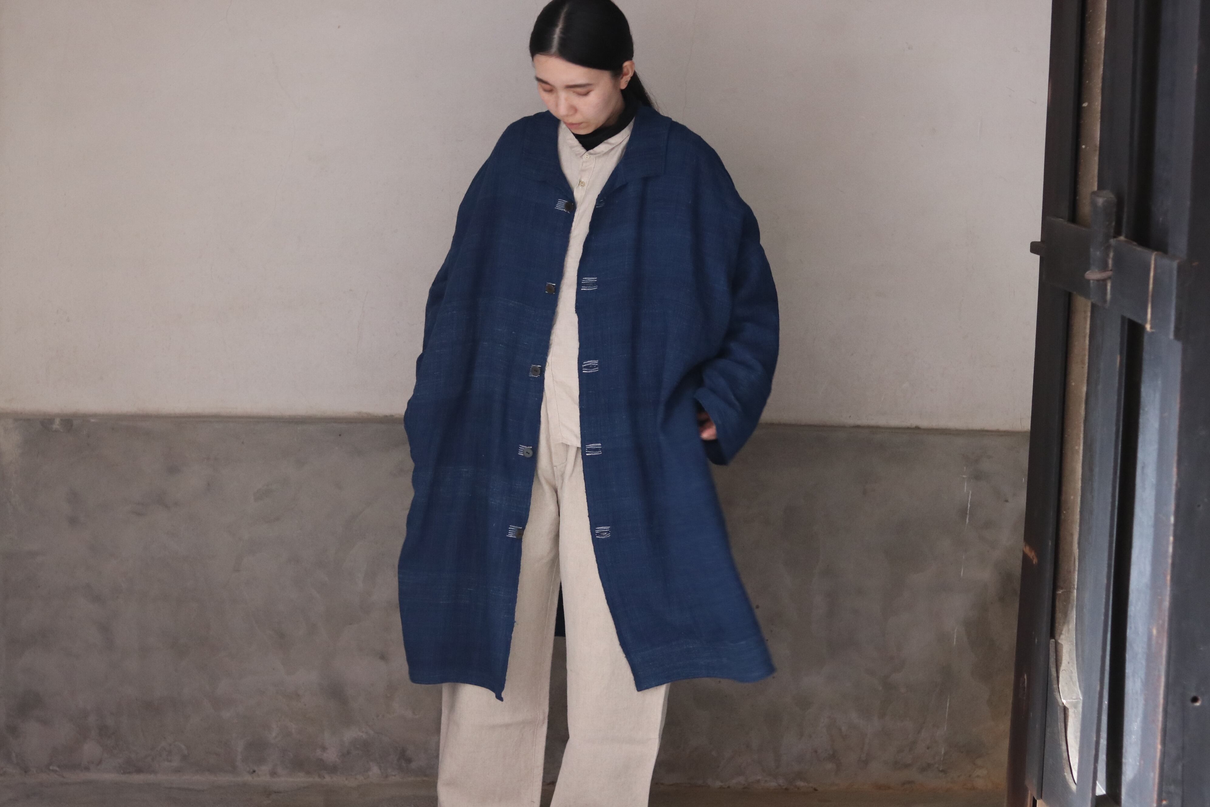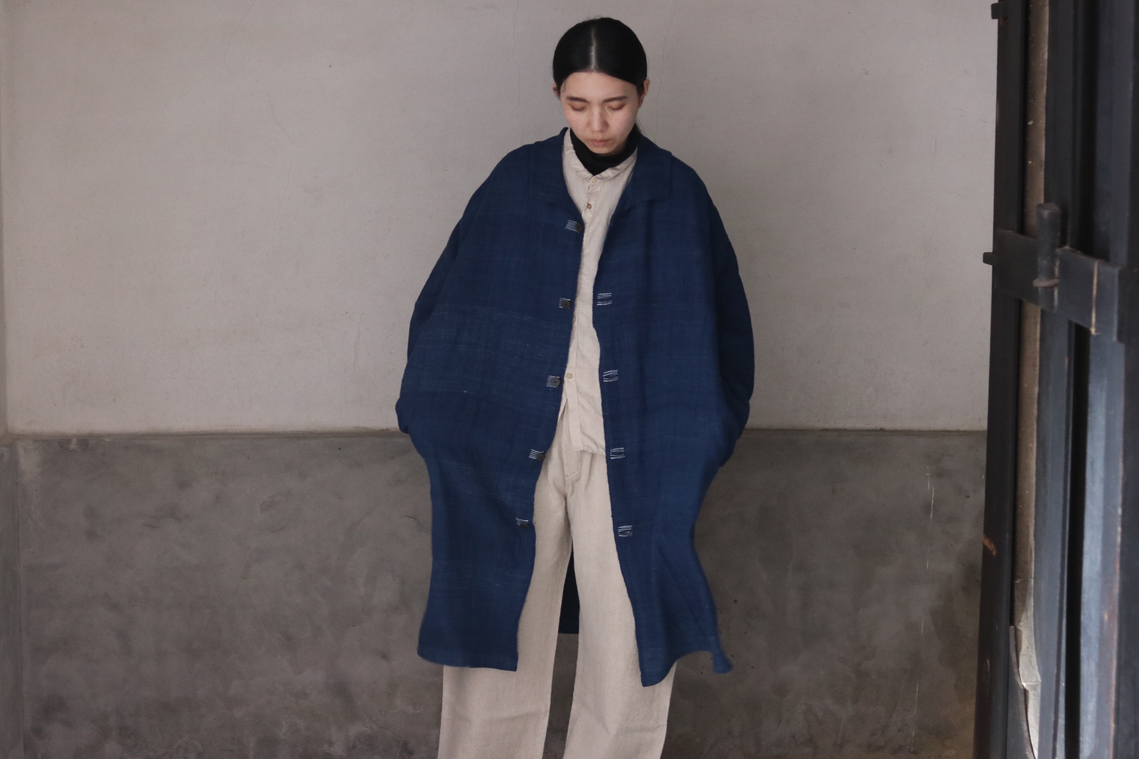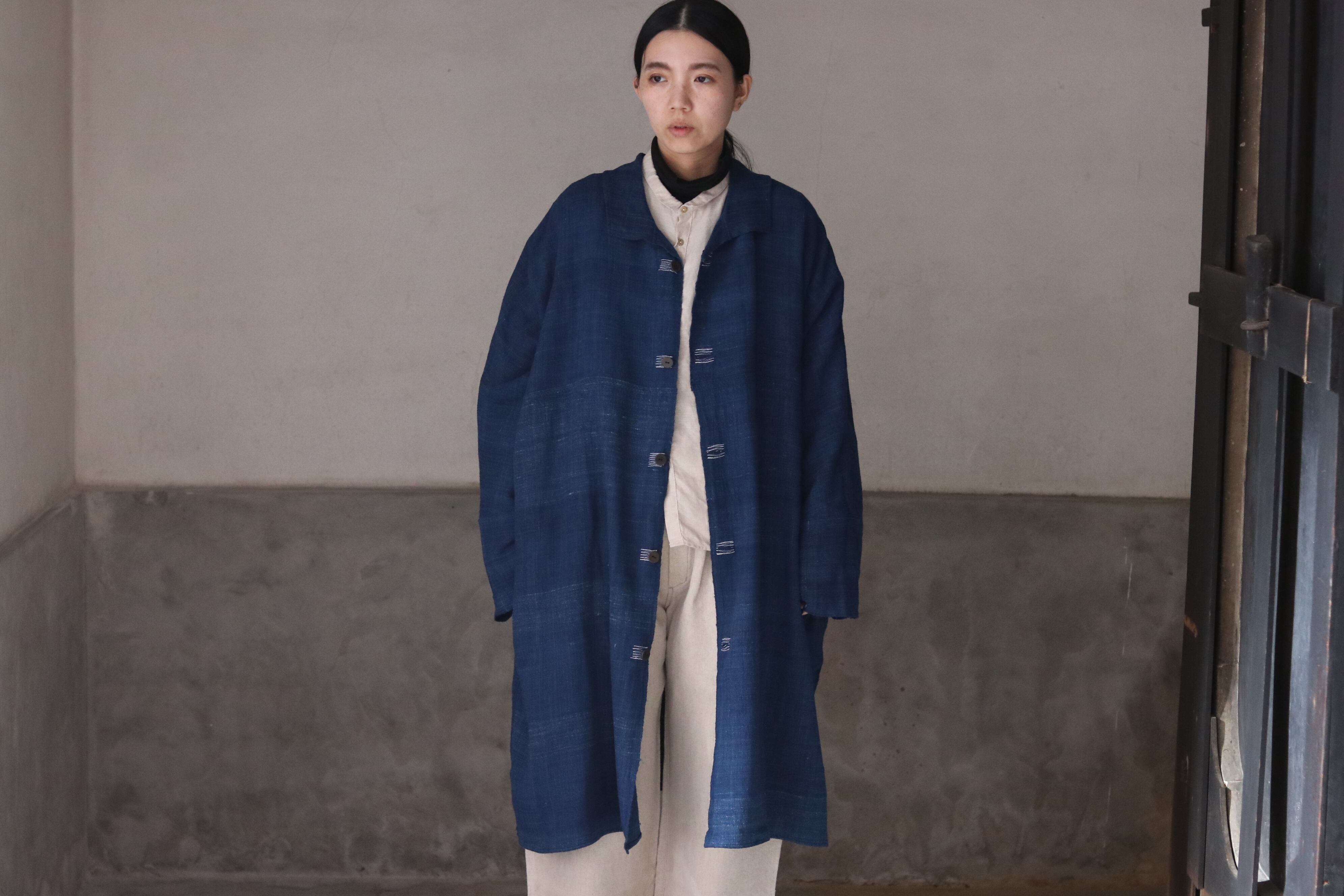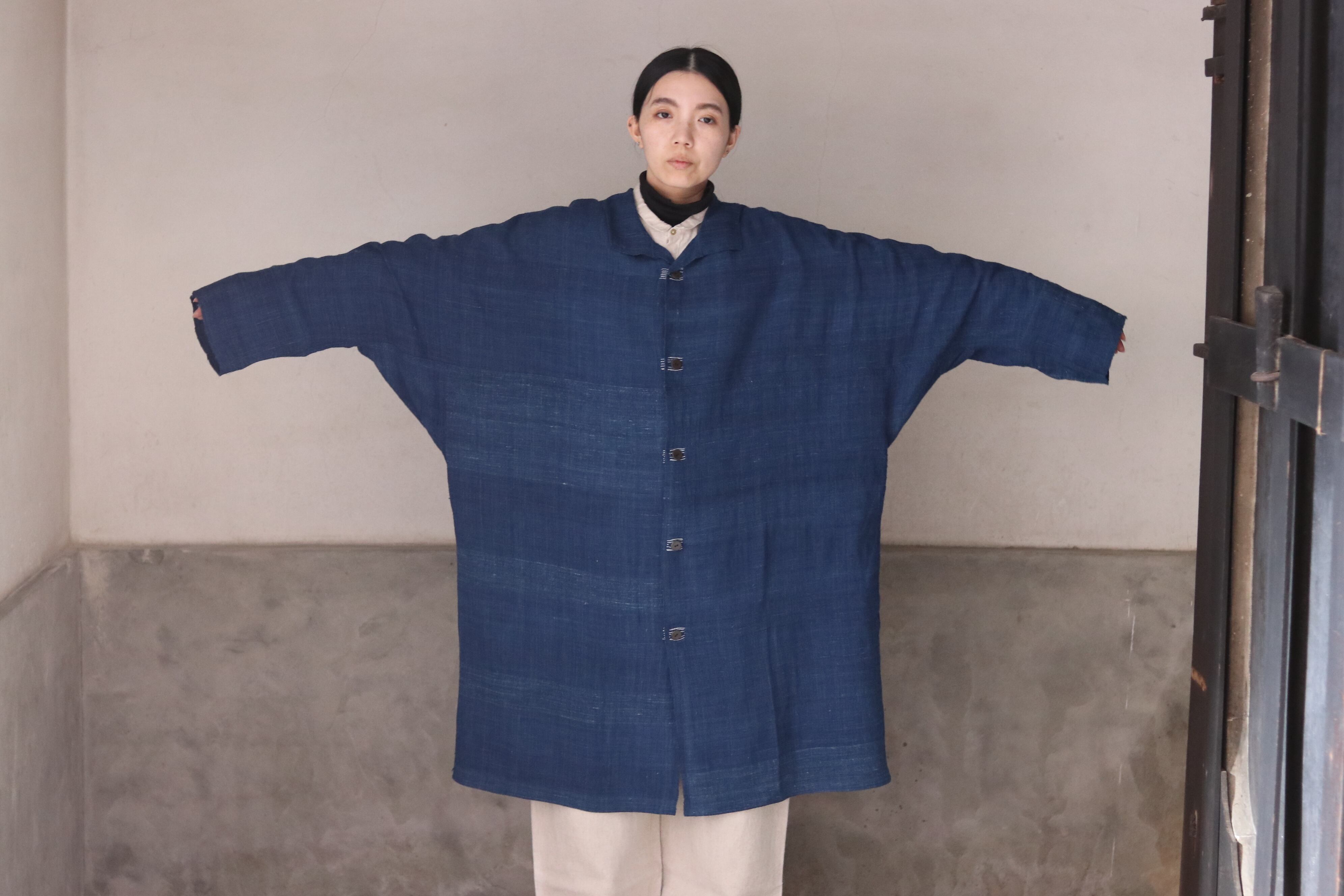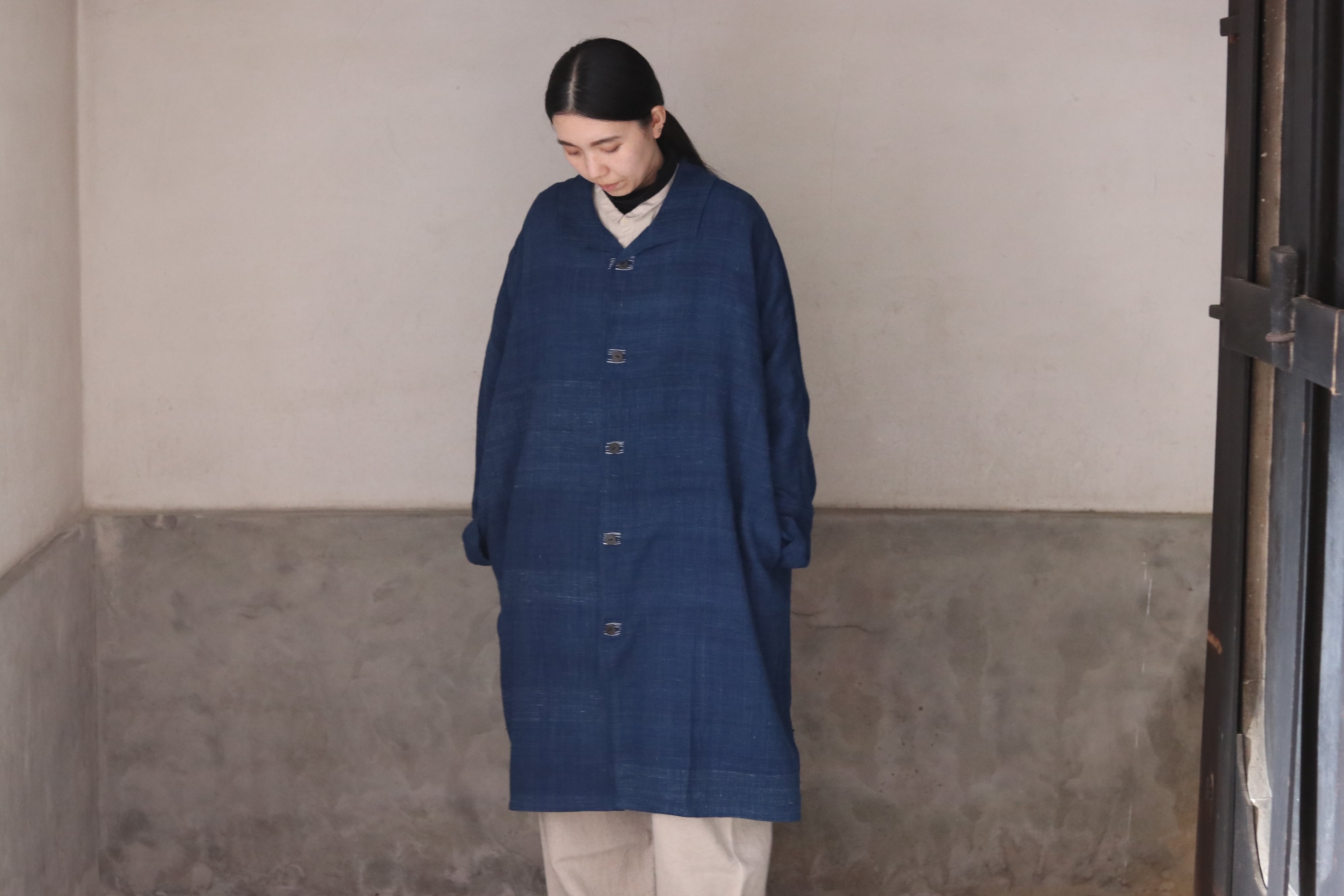 洋服の文脈から距離を置き、畳まれた布がそのまま衣服になるような構造を意識した、平面的なコートです。ほとんどのパーツを直線で構成し、袖下に裁ち続きのマチを配したゆとりのあるシルエットで、体型や中に着るものを問わず羽織ることができます。前端や衿、袖口には生地耳を使用し、軽やかな印象に仕上げています。ボタンとボタンホールの箇所には当て布を重ね、白い糸で補強ステッチを入れることで、手仕事の痕跡を感じられる仕上がりにしています。ボタンには貝ボタンを使用しています。