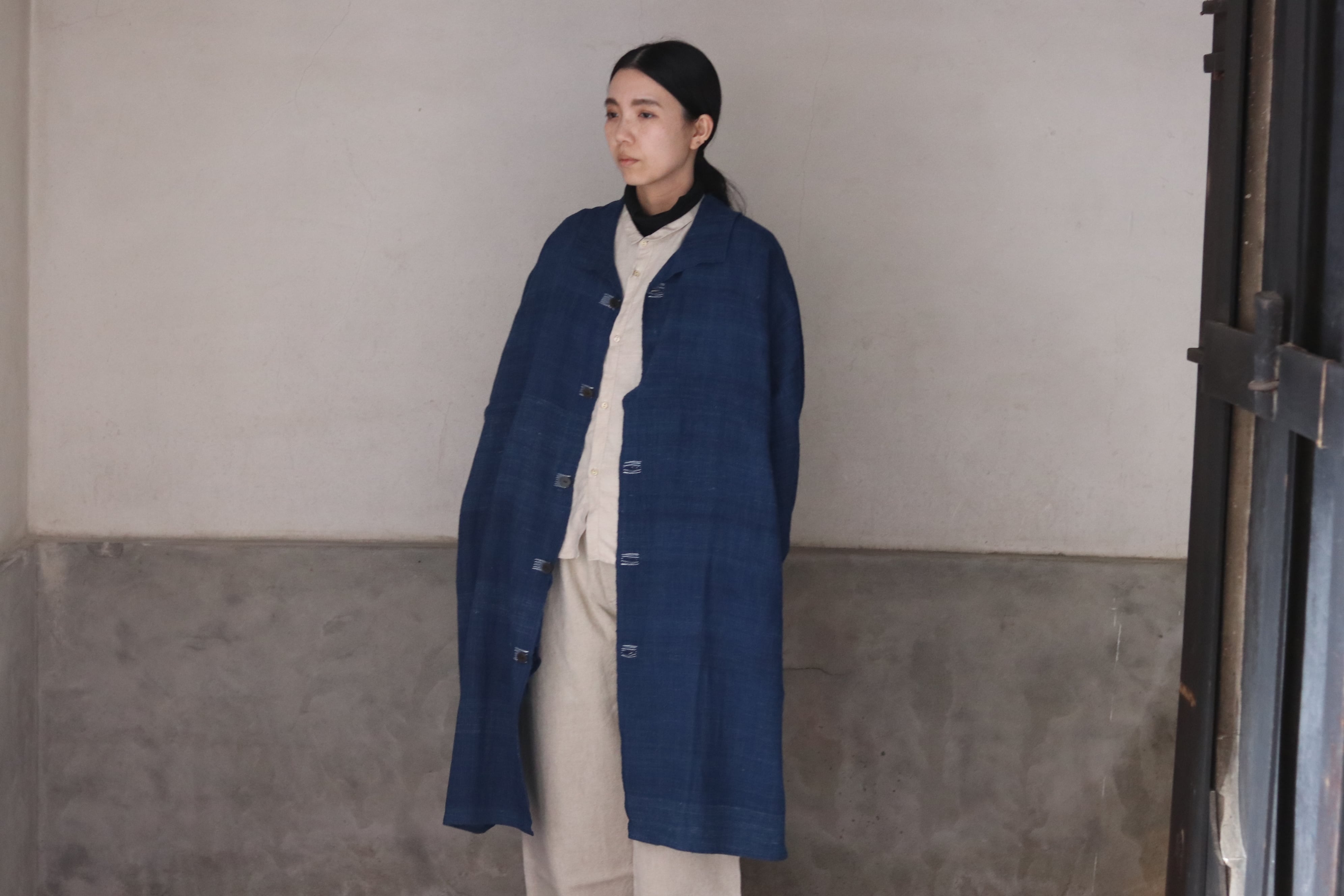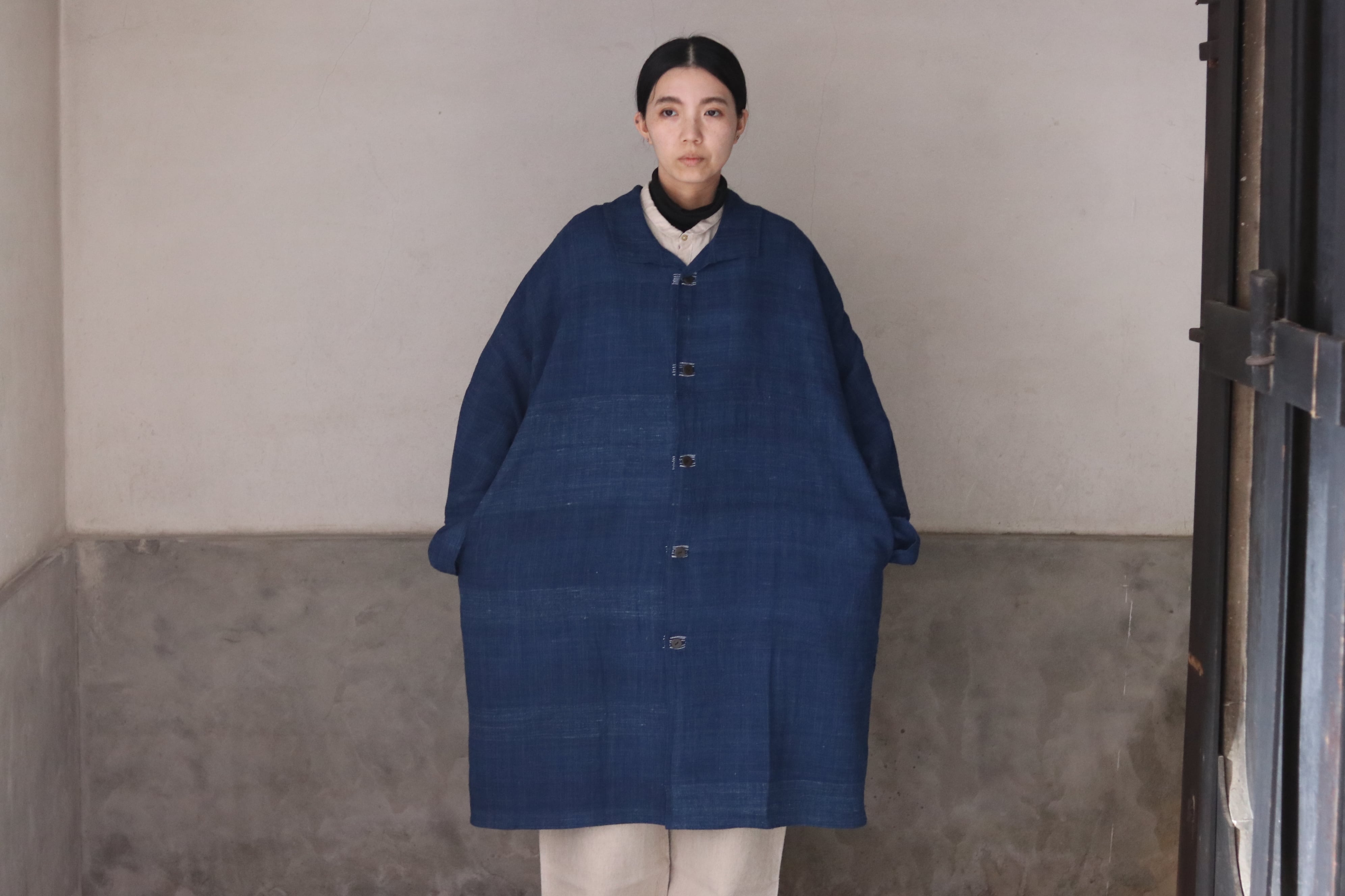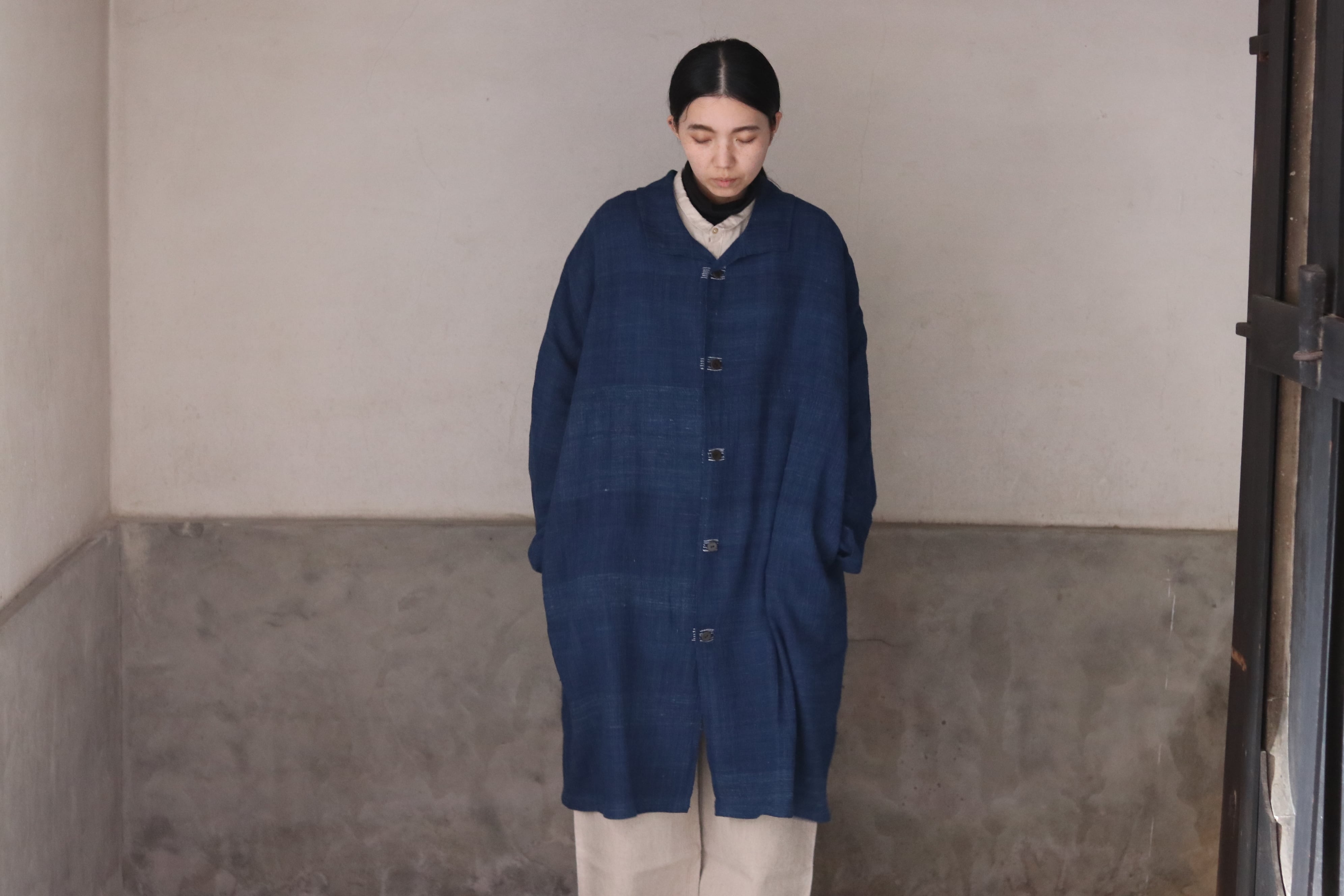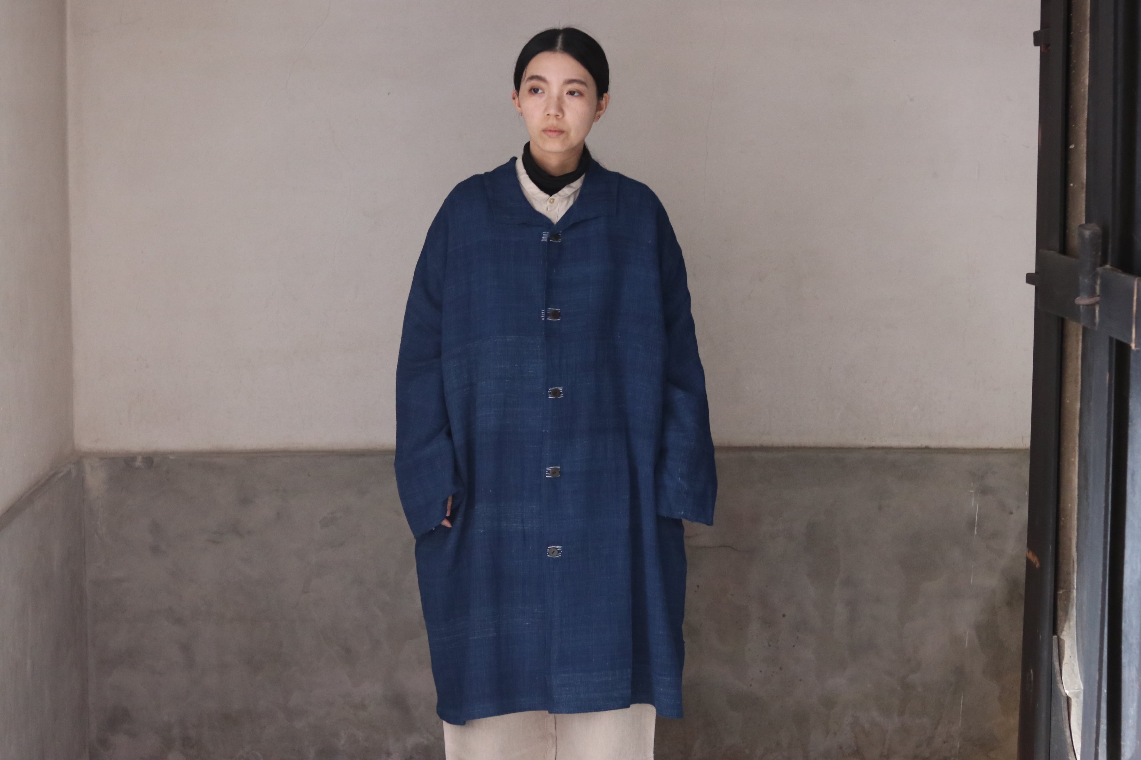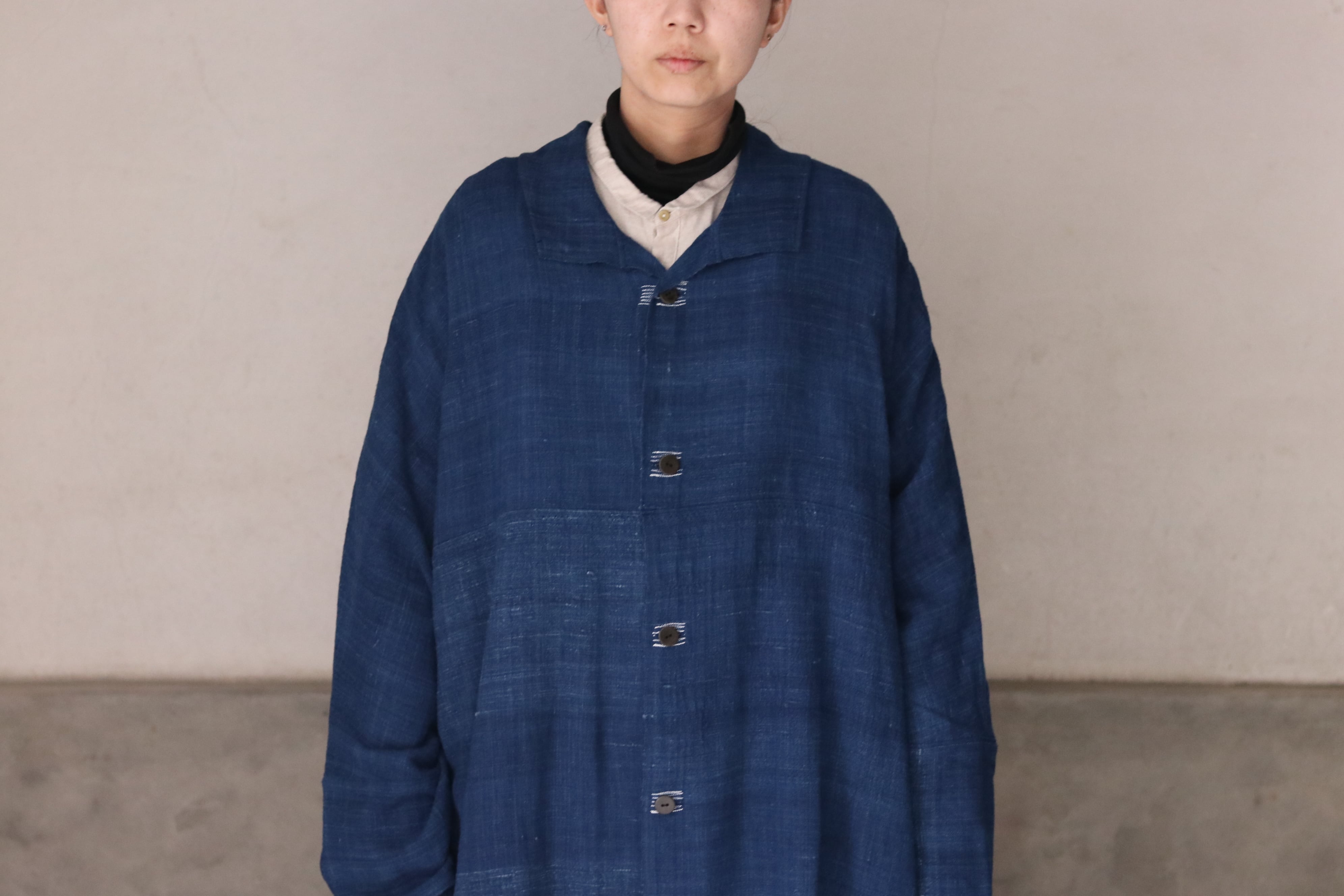 洋服の文脈から距離を置き、畳まれた布がそのまま衣服になるような構造を意識した、平面的なコートです。ほとんどのパーツを直線で構成し、袖下に裁ち続きのマチを配したゆとりのあるシルエットで、体型や中に着るものを問わず羽織ることができます。前端や衿、袖口には生地耳を使用し、軽やかな印象に仕上げています。ボタンとボタンホールの箇所には当て布を重ね、白い糸で補強ステッチを入れることで、手仕事の痕跡を感じられる仕上がりにしています。ボタンには貝ボタンを使用しています。
