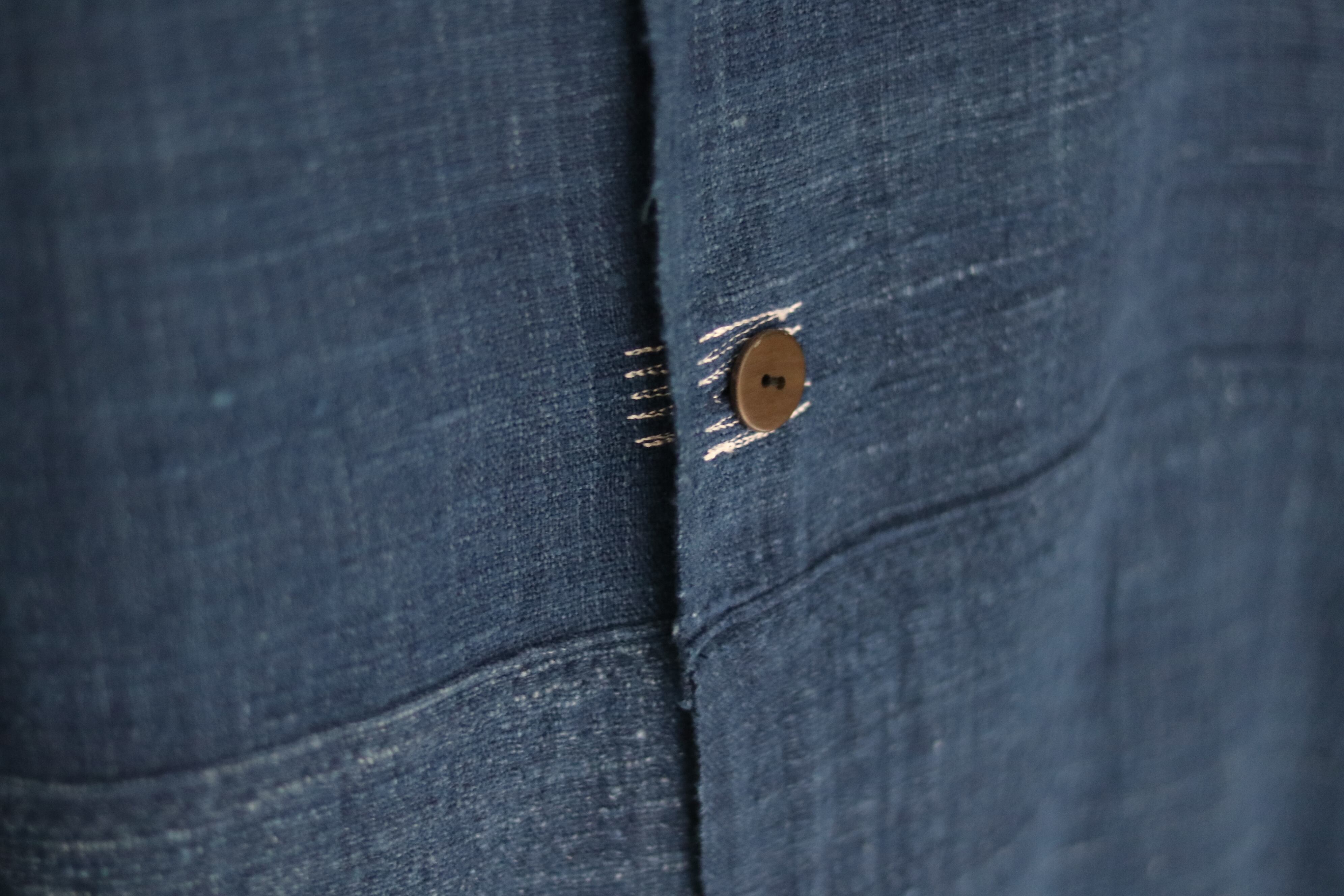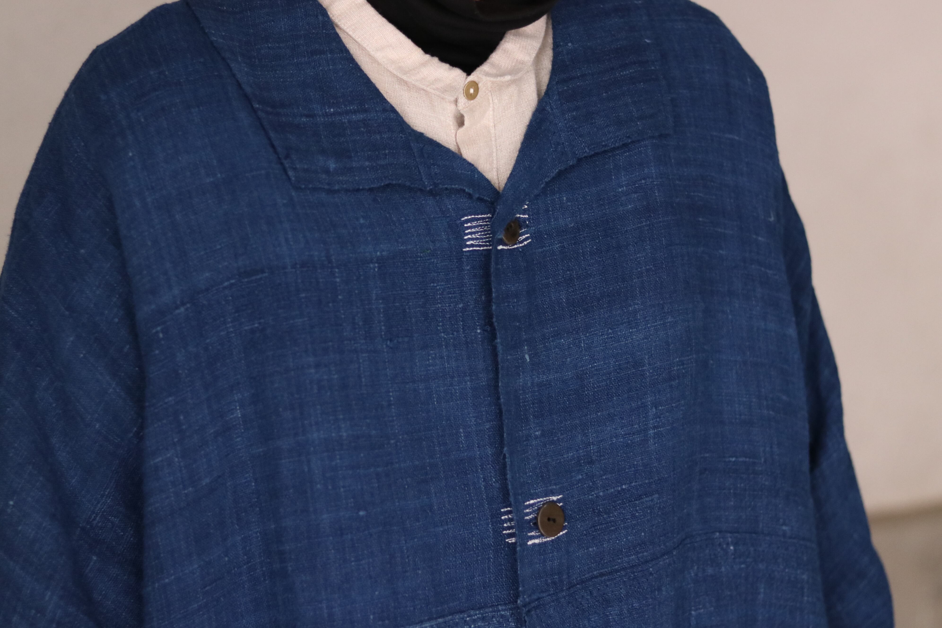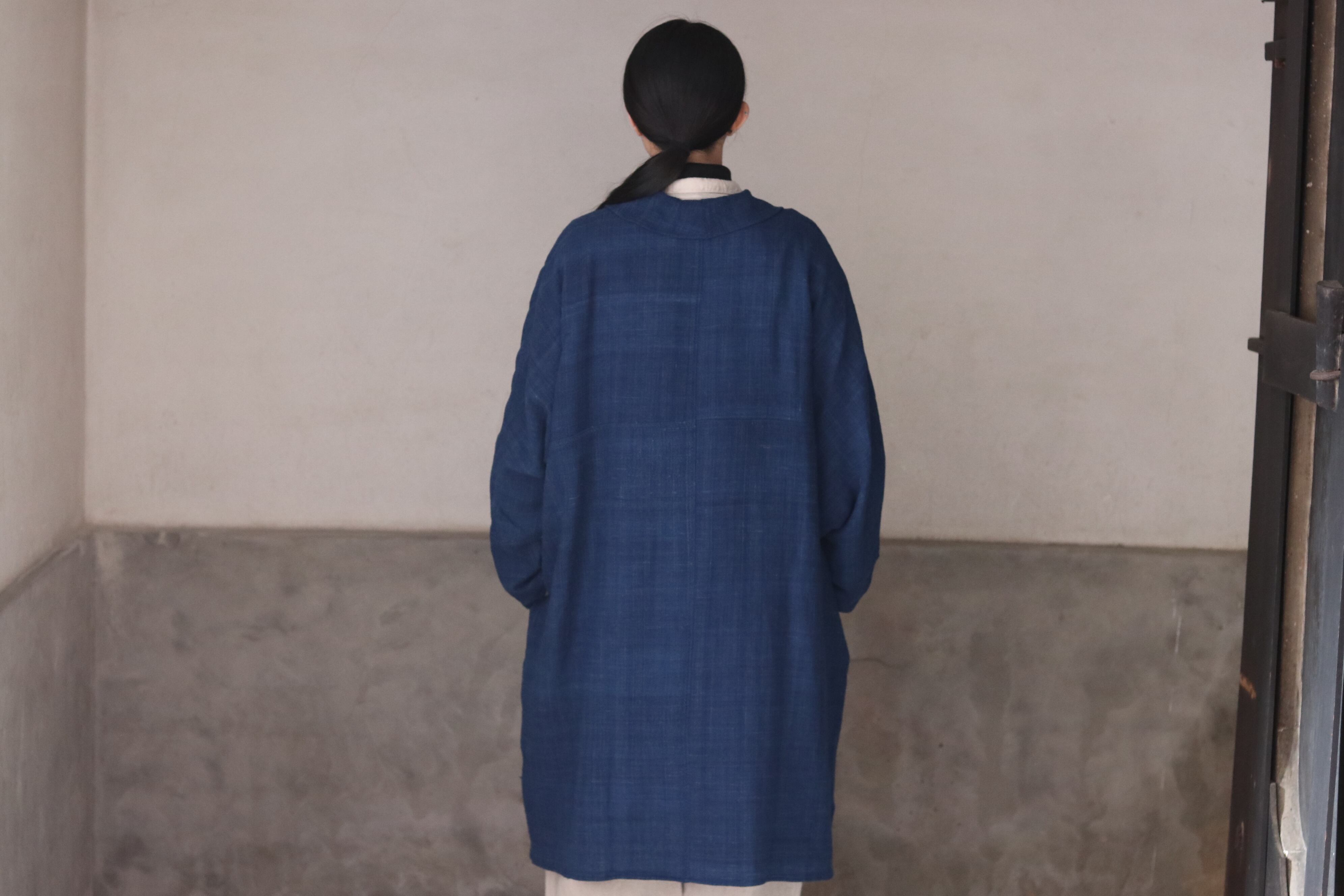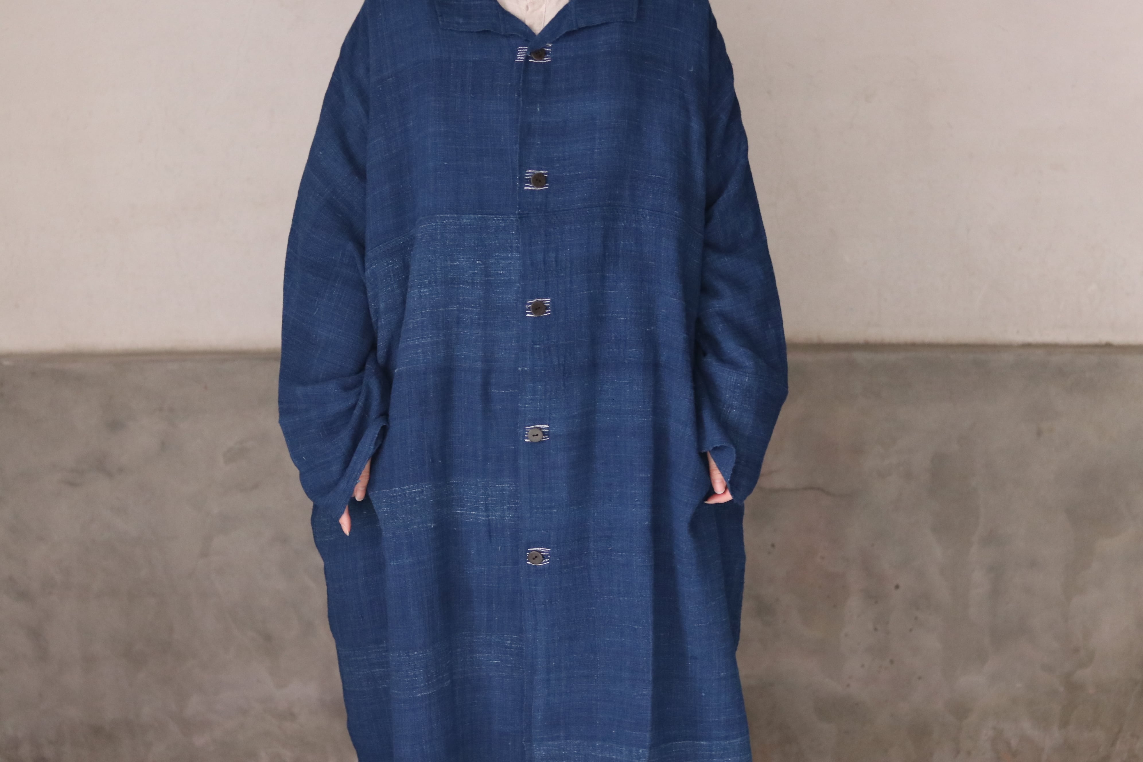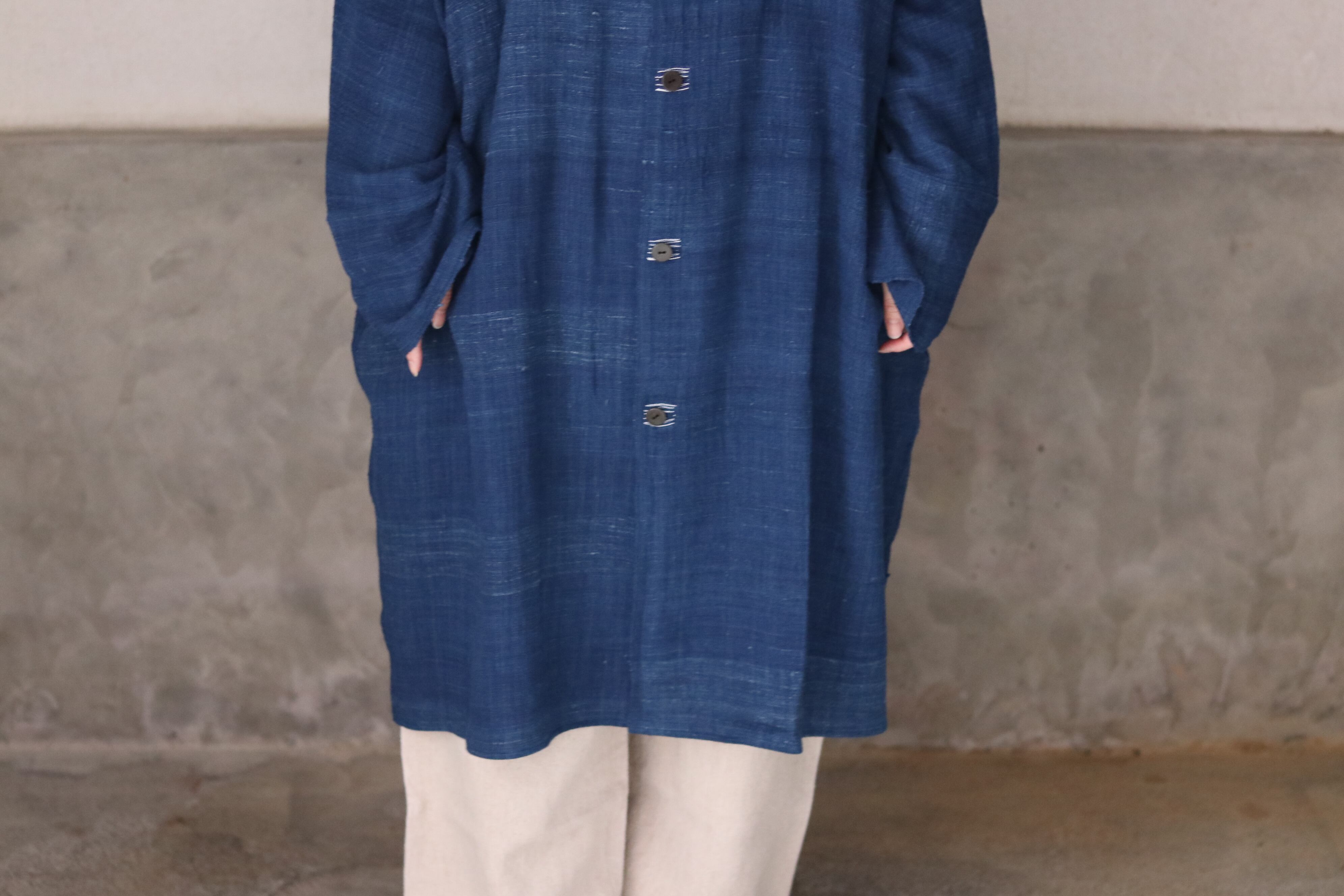 洋服の文脈から距離を置き、畳まれた布がそのまま衣服になるような構造を意識した、平面的なコートです。ほとんどのパーツを直線で構成し、袖下に裁ち続きのマチを配したゆとりのあるシルエットで、体型や中に着るものを問わず羽織ることができます。前端や衿、袖口には生地耳を使用し、軽やかな印象に仕上げています。ボタンとボタンホールの箇所には当て布を重ね、白い糸で補強ステッチを入れることで、手仕事の痕跡を感じられる仕上がりにしています。ボタンには貝ボタンを使用しています。