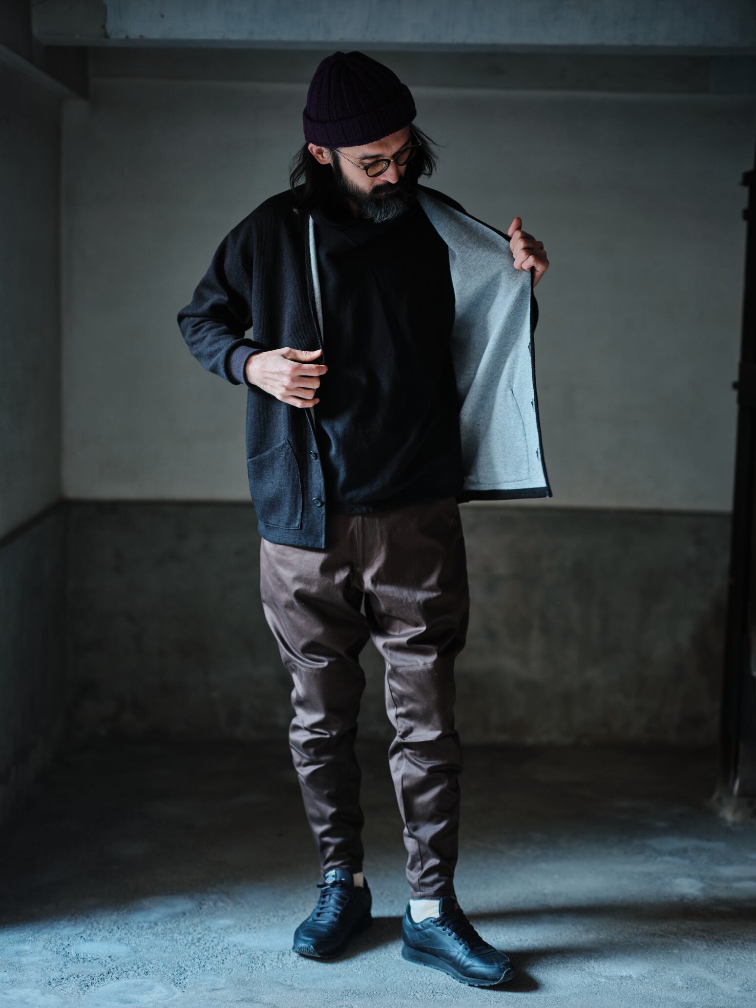 少しゆったり目のシルエットに、ボタンを開けるとほぼストレートに落ちる前立のライン作りを特徴に、肩から垂れ下がる素材の表情を活かすための衿と前身頃の一体作りや、脇線の切り替えしを無くした作り。シンプルでありながら少し変わった面持ちの1着。前作ではスエット地でしたが今作の素材感も良い感じになりました。