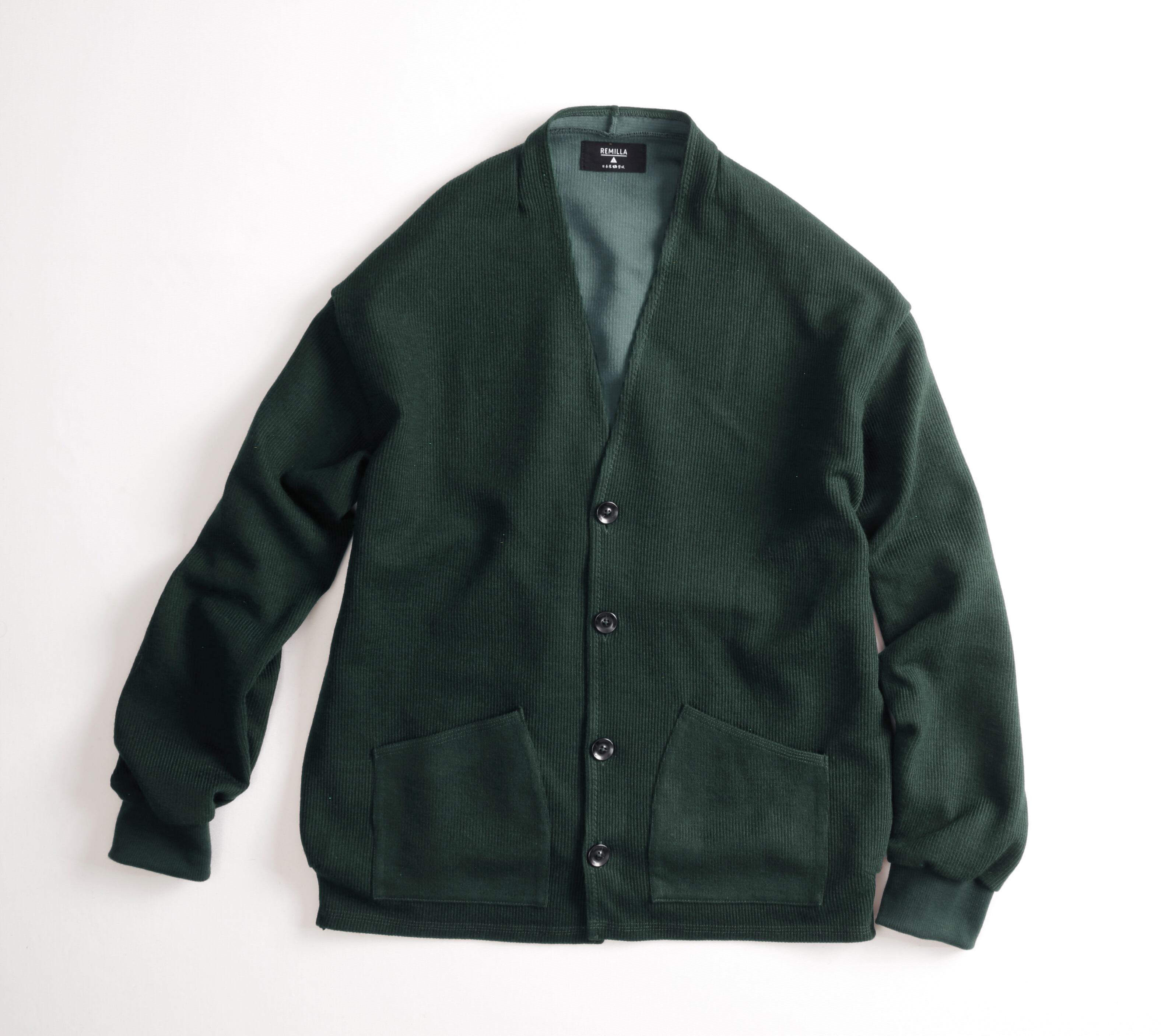 少しゆったり目のシルエットに、ボタンを開けるとほぼストレートに落ちる前立のライン作りを特徴に、肩から垂れ下がる素材の表情を活かすための衿と前身頃の一体作りや、脇線の切り替えしを無くした作り。シンプルでありながら少し変わった面持ちの1着。前作ではスエット地でしたが今作の素材感も良い感じになりました。