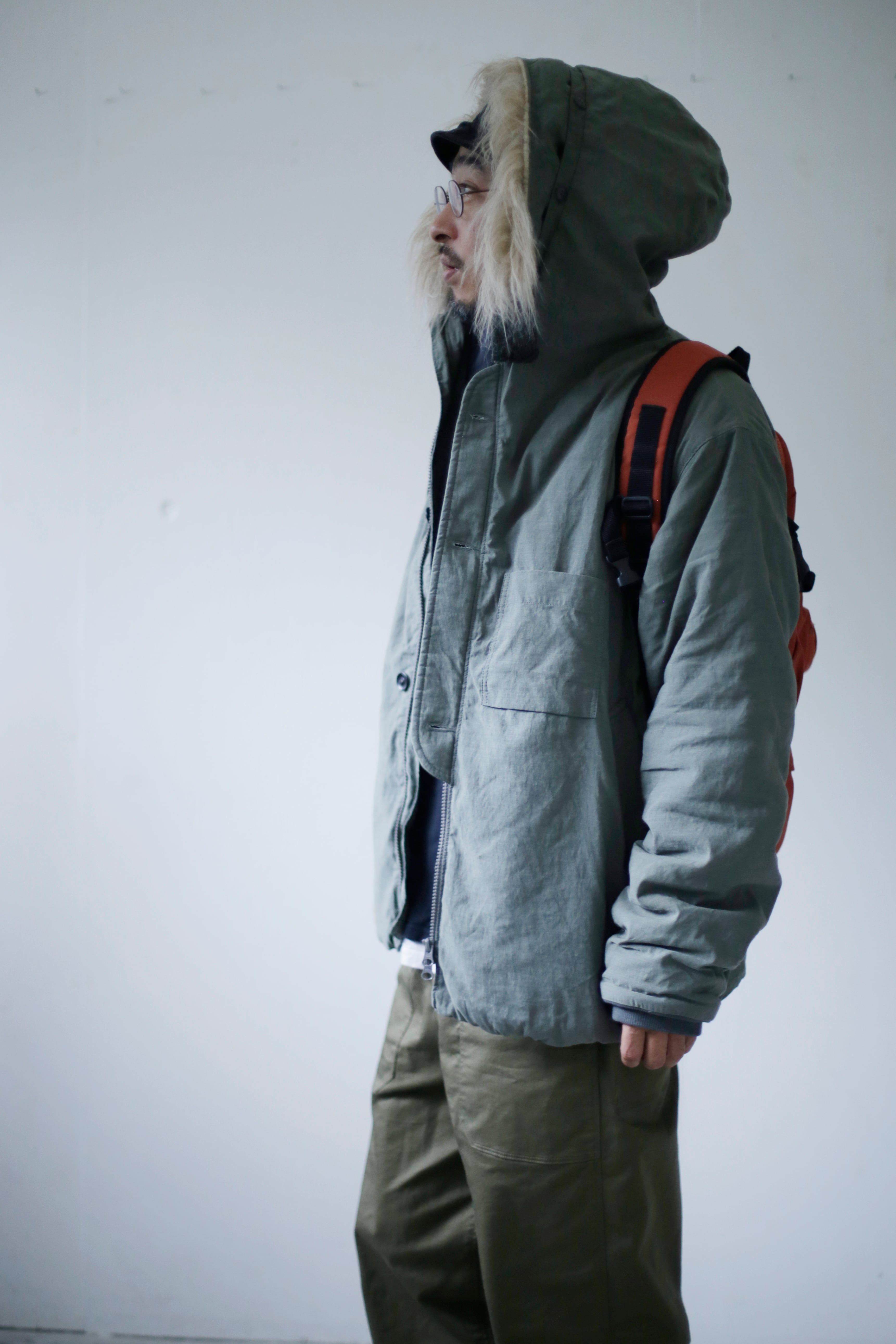 「サボット」と名付けた身頃一体型のフード作りが着た時に独特な首周りのシワ感と、宇宙服のような、イエティのようなフォルム感が他にはなく、気に入っています。中綿仕様で軽く、サラッと着られる作りにremilla 初のファーは取り外し可能。表地の素材の存在感がすごくシックリ来た1着。是非、直接雰囲気を感じていただきたいアイテムです!