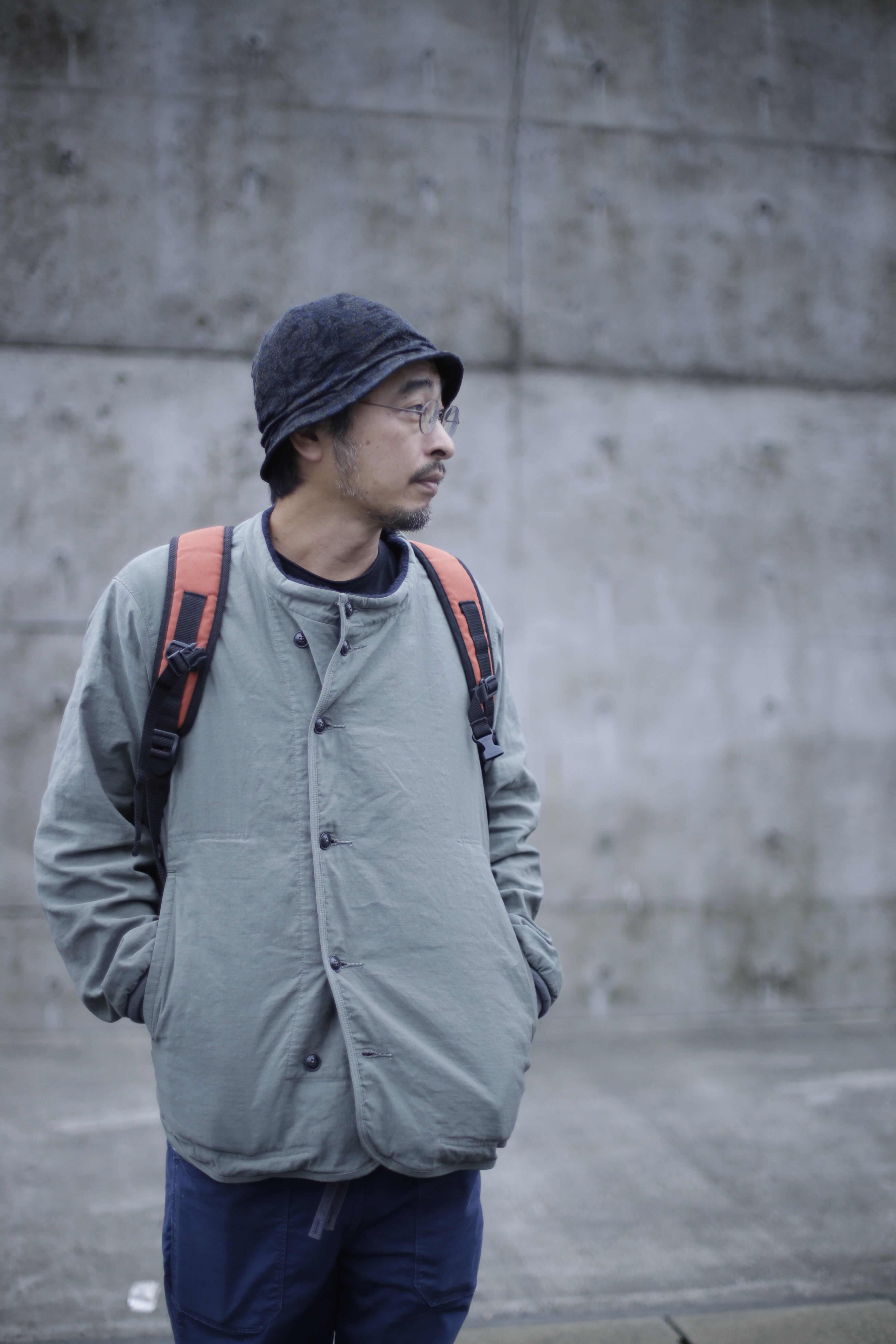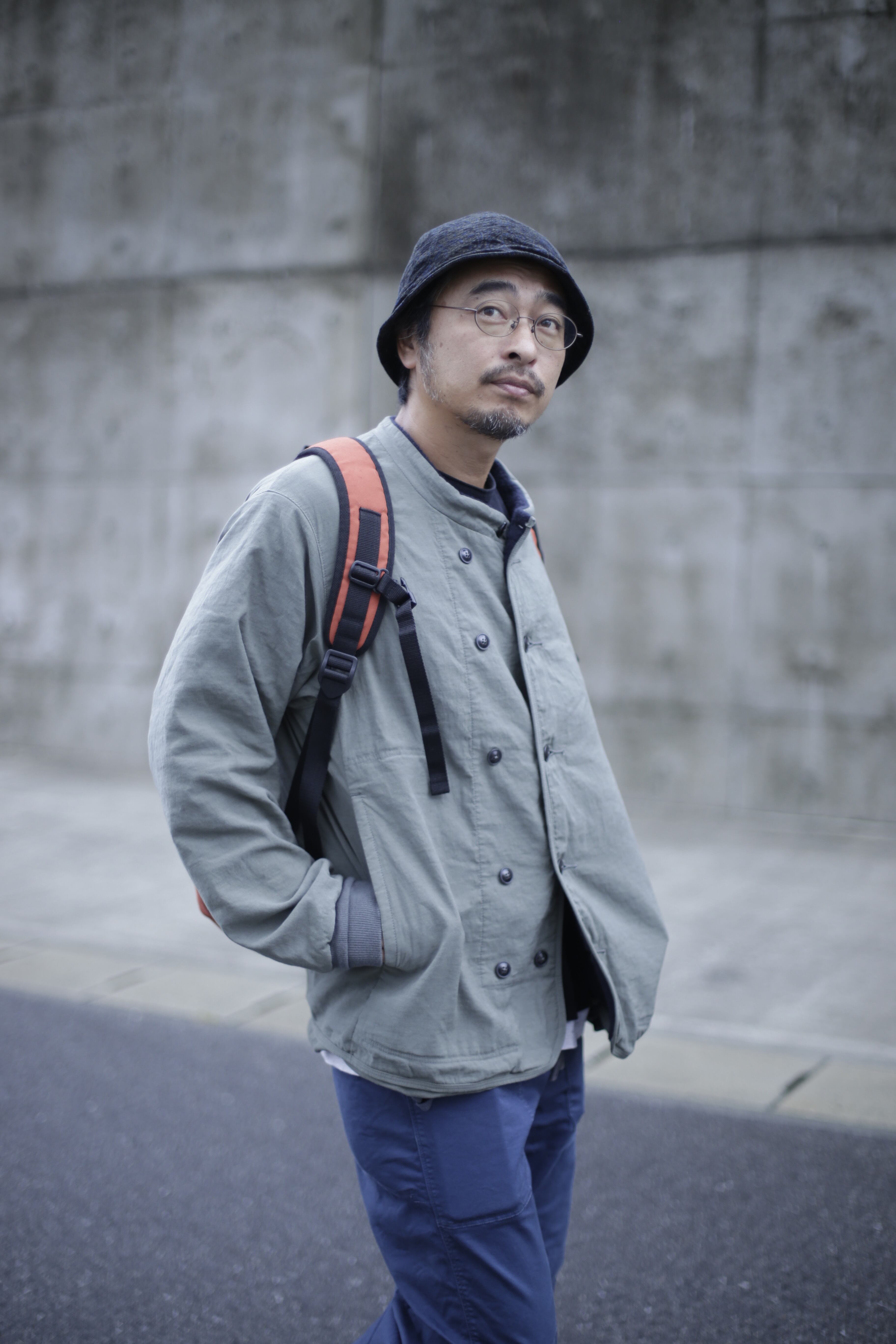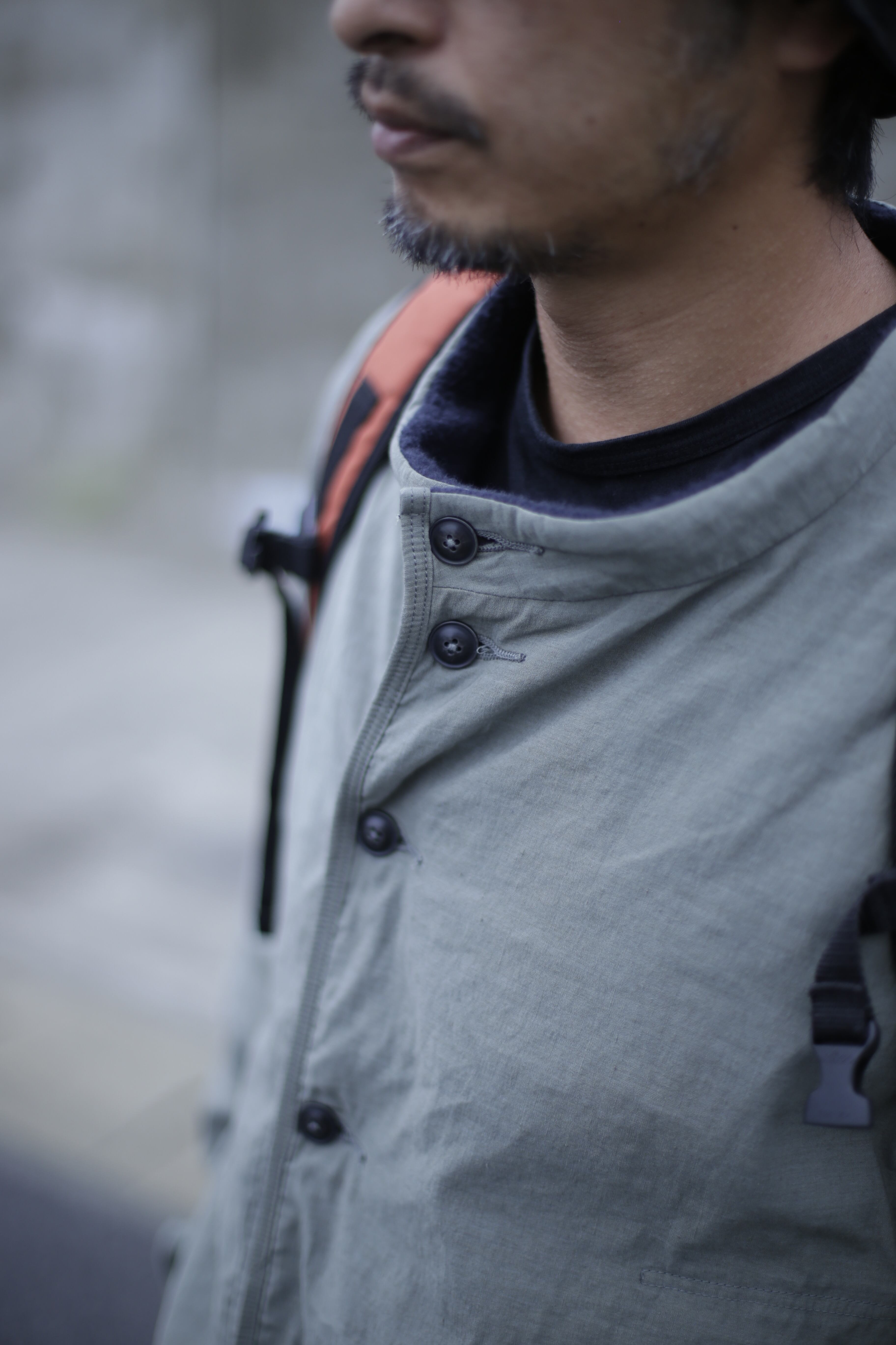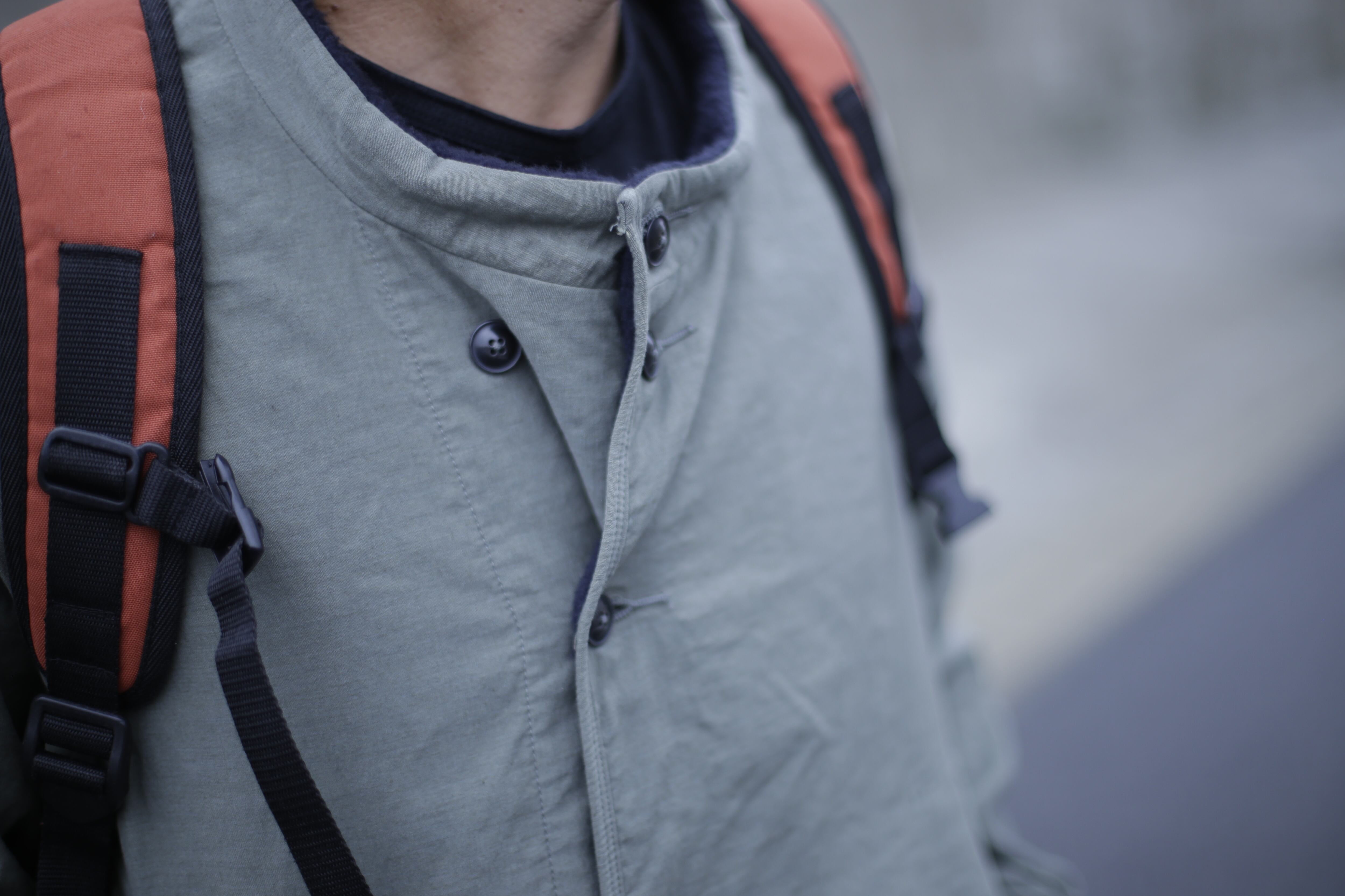 2列に並んだ釦の止め方でレギュラーとワイドの2種類の身幅の着方が出来る作り。狩衣(カリギヌ)のような丸く開いた首元が、パーカーなどの重ね着の変化や、釦の止め方で変わるシルエットなど着方が選べるアイテム。デクトと名付けた裾口の切り替えによって裏地がハミ出たような独特な着崩し感を魅せます。
