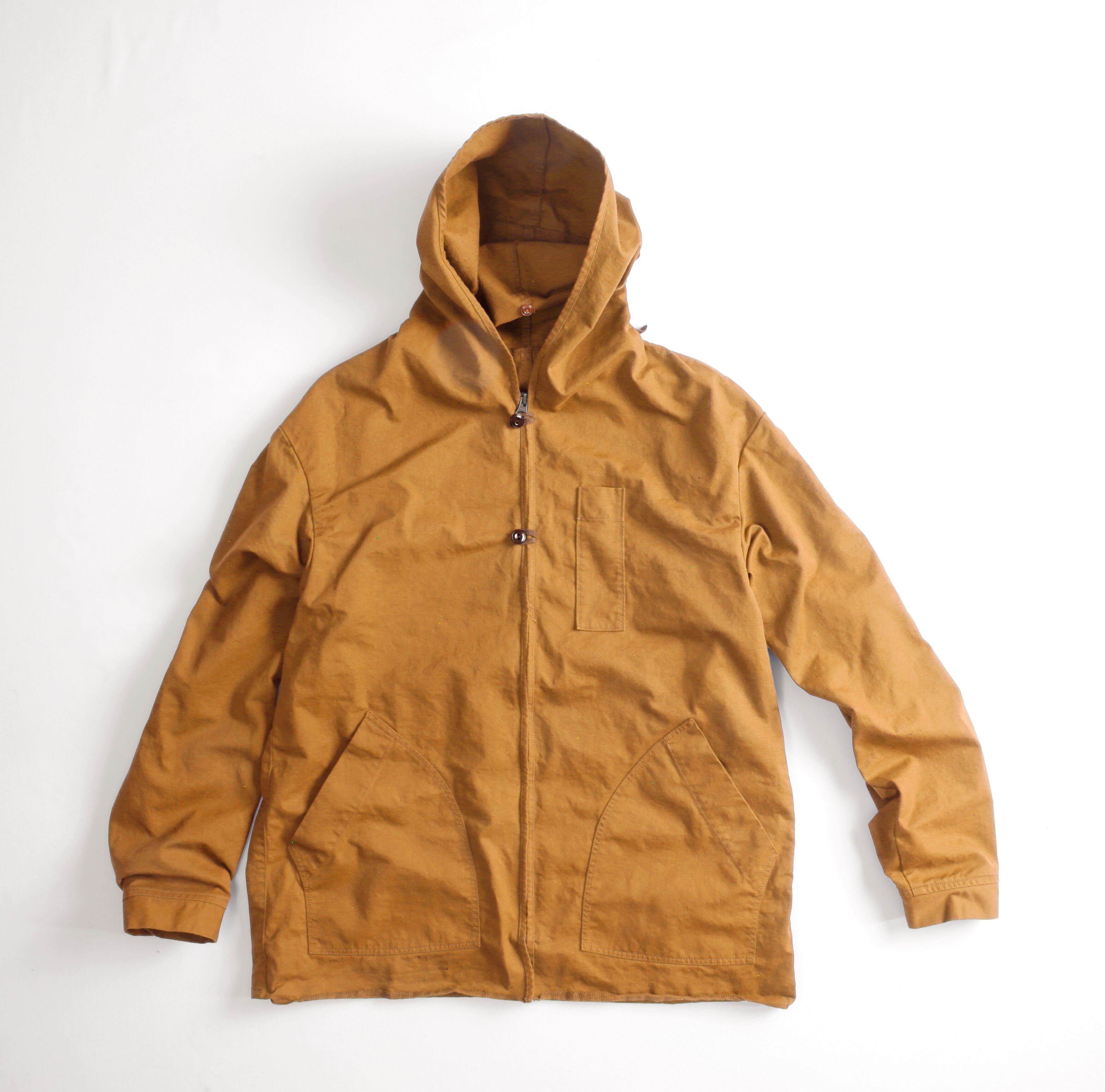 ・身頃とフードが一体型で、丸めて釦で止めれば何となく衿になる作り。重ね着にも使える身幅と袖幅で、作業で羽織るにも良さそうなワークスモック。